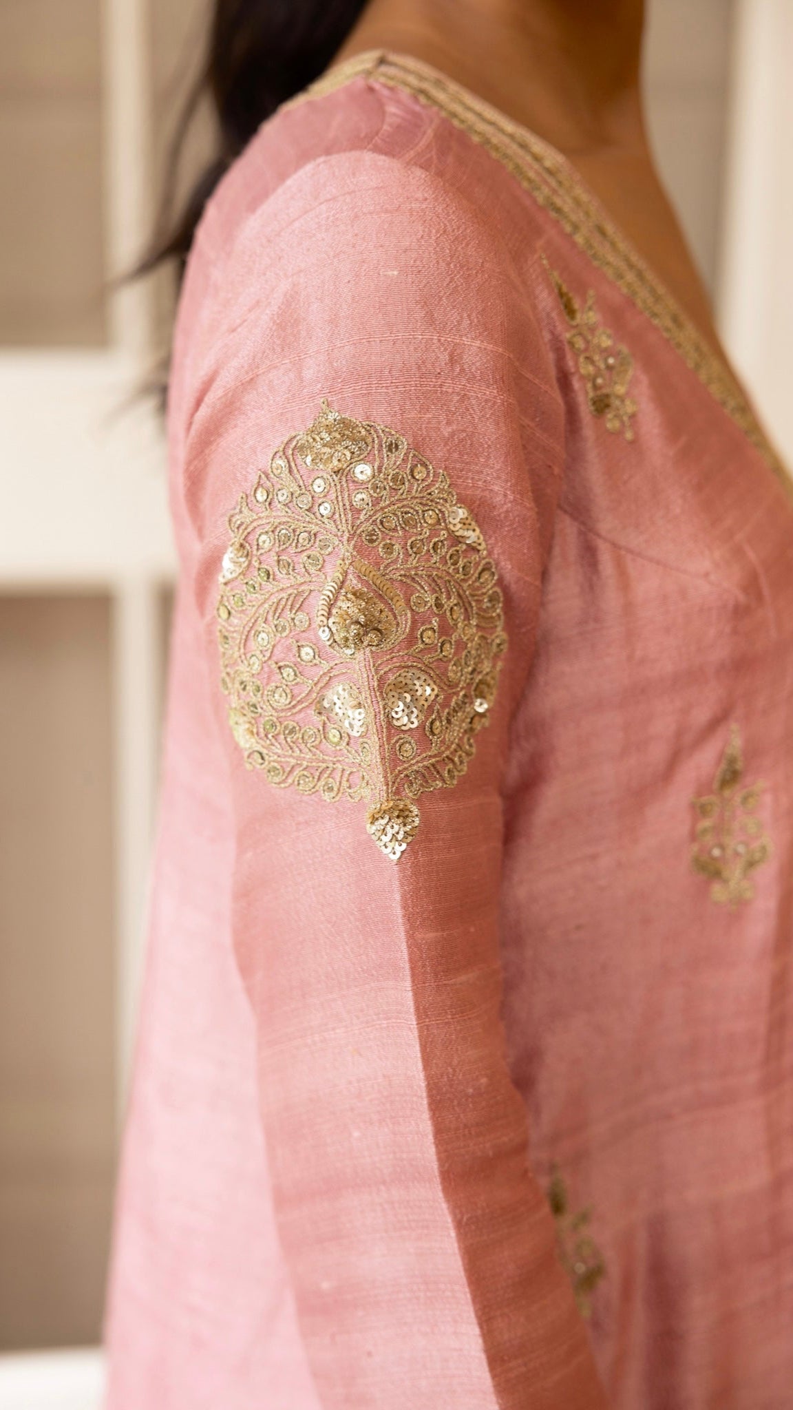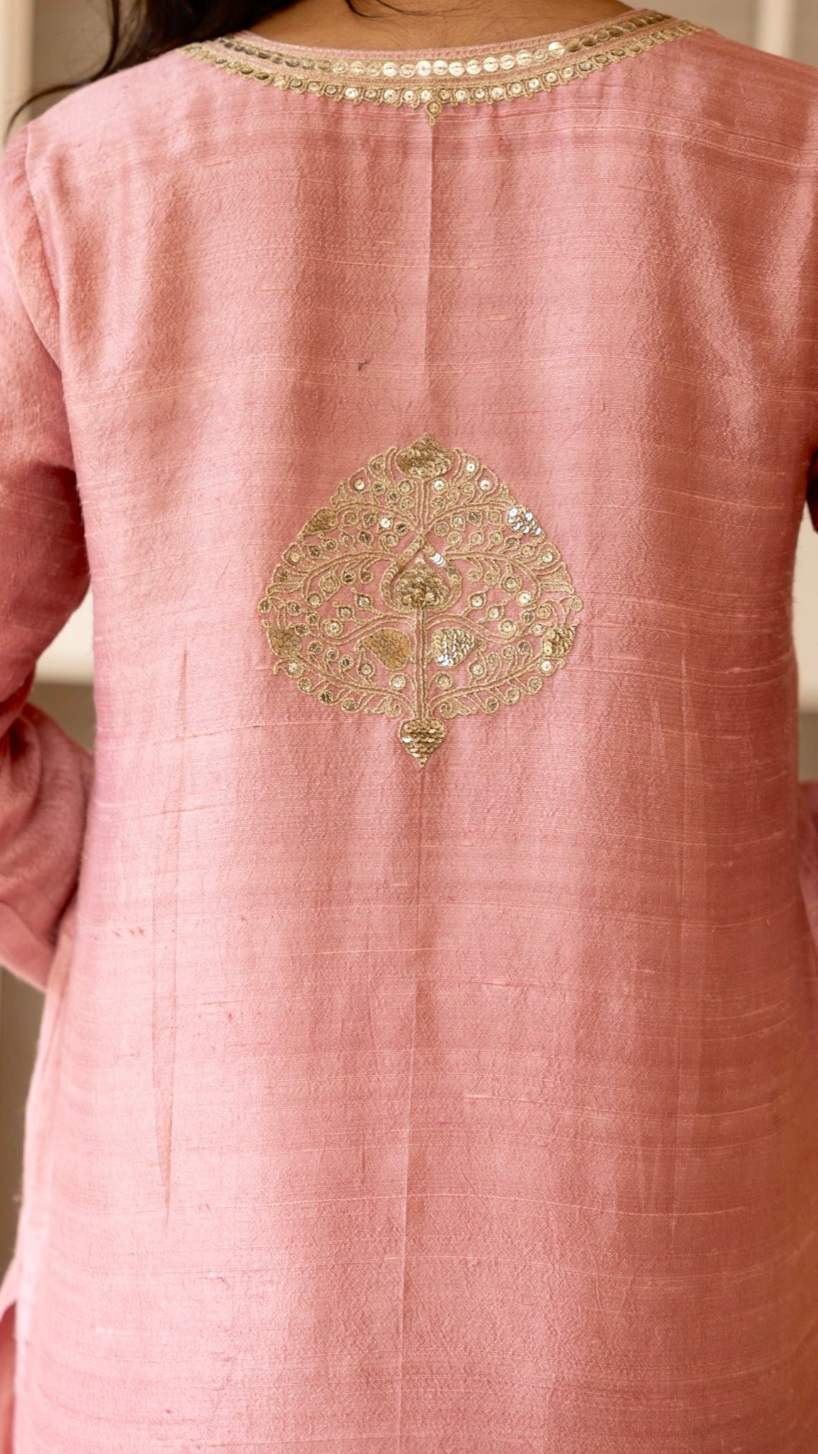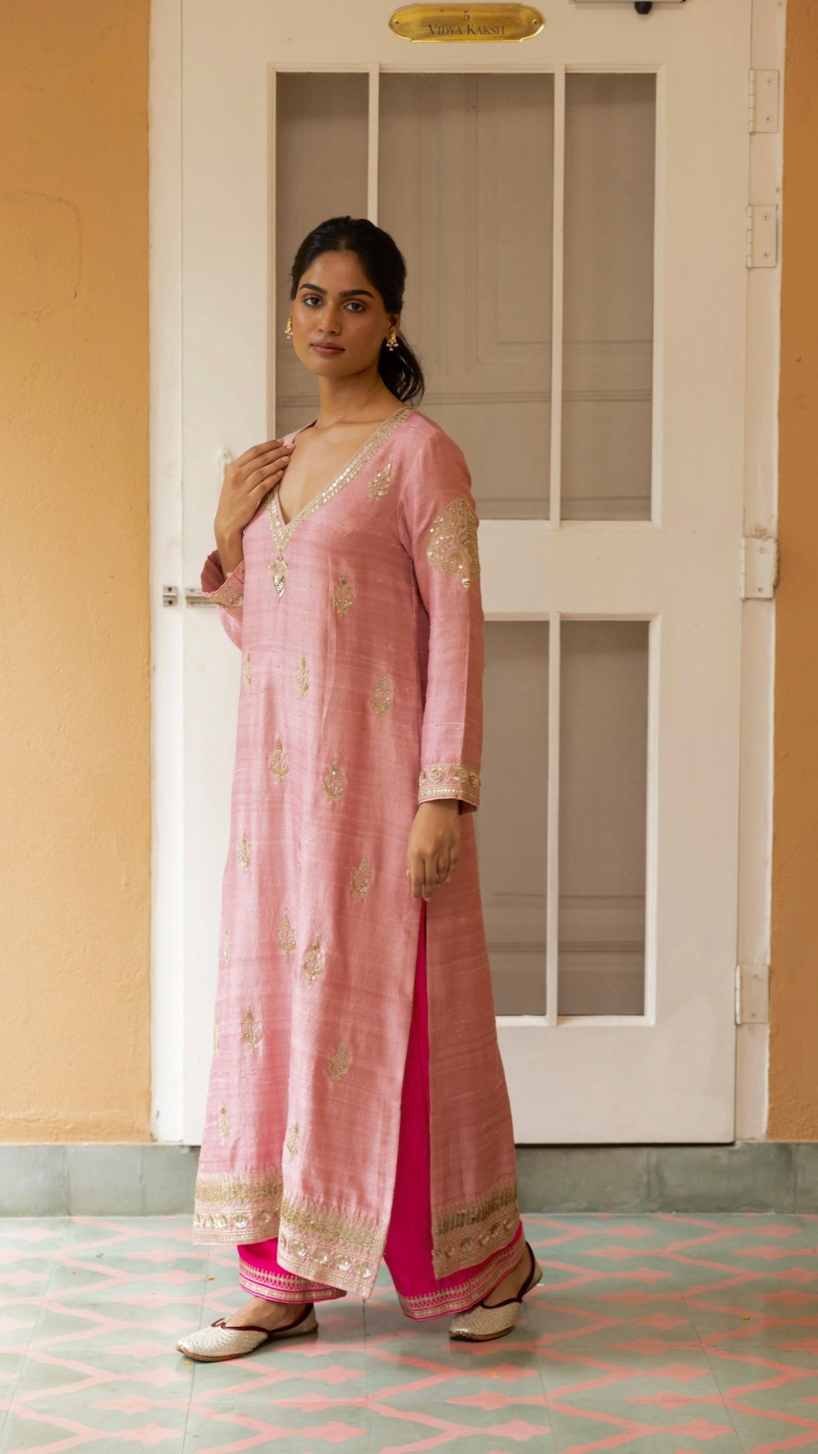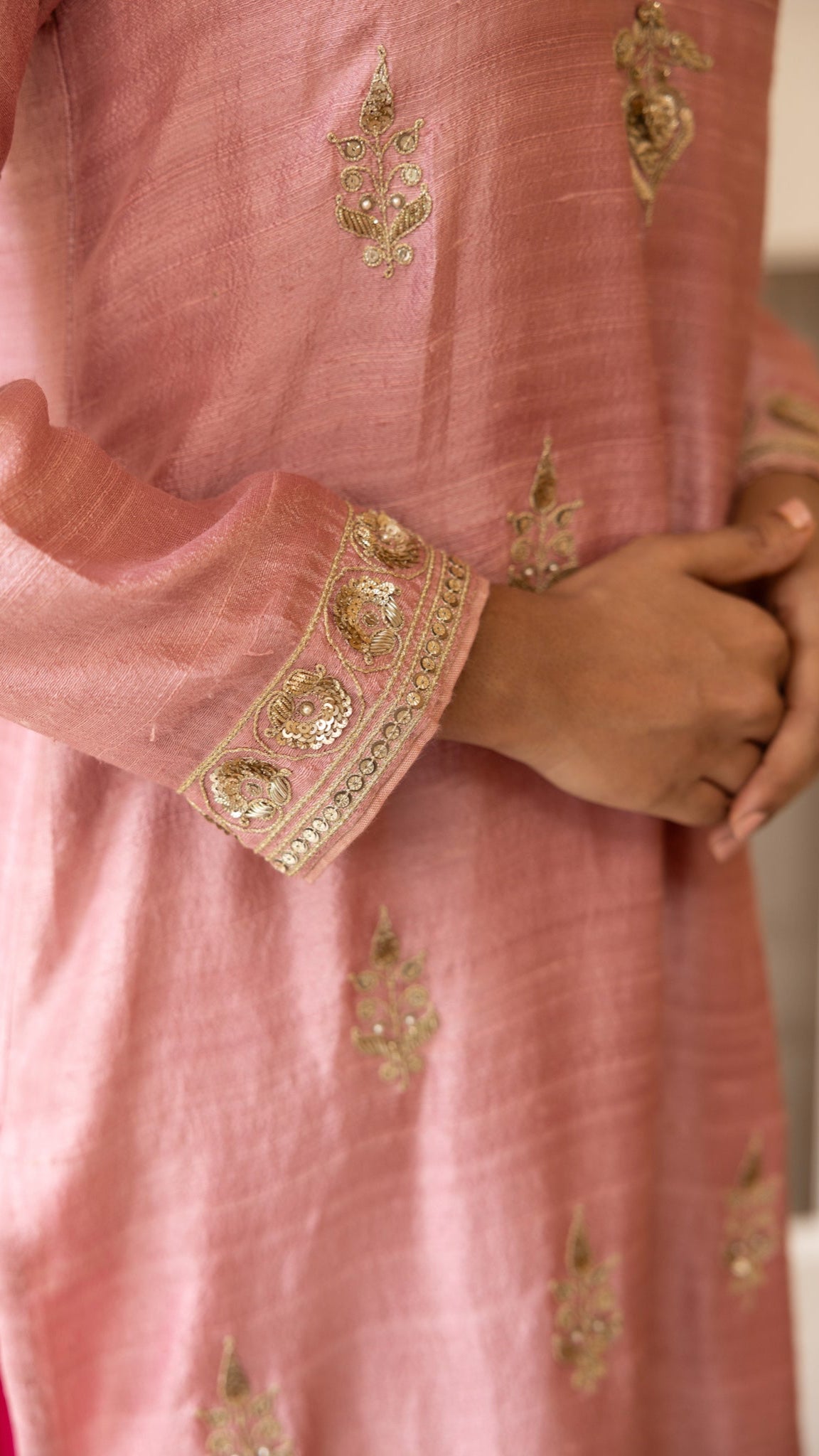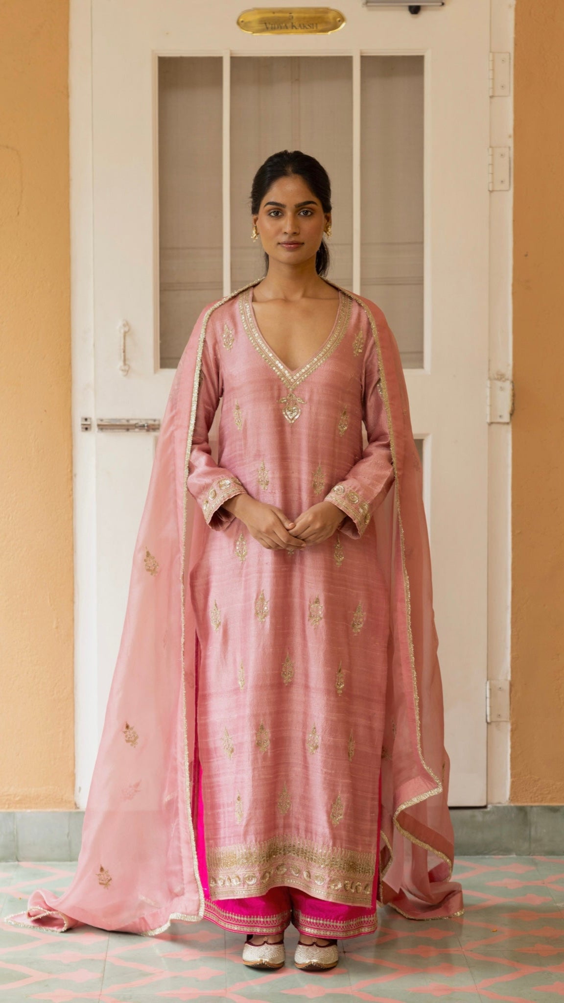 - Pastel Pink Raw Silk Kurta, Hot Pink Pure Silk Pants and Organza Dupatta set with Hand Dori and Zardozi Embroidery