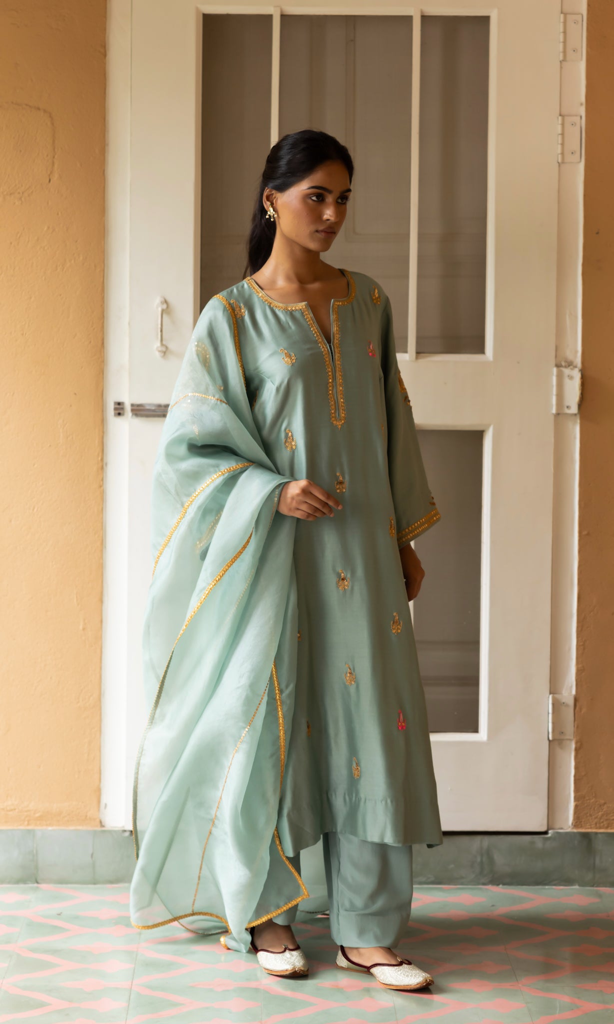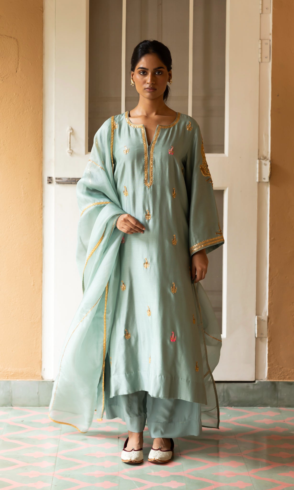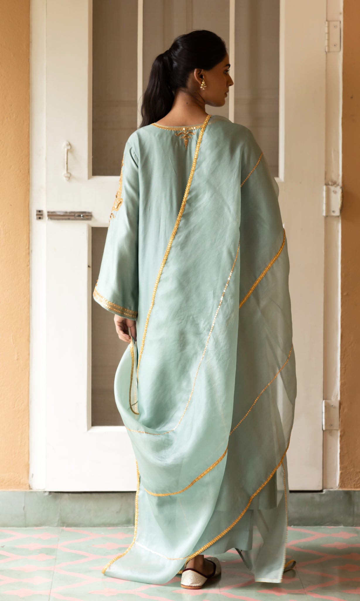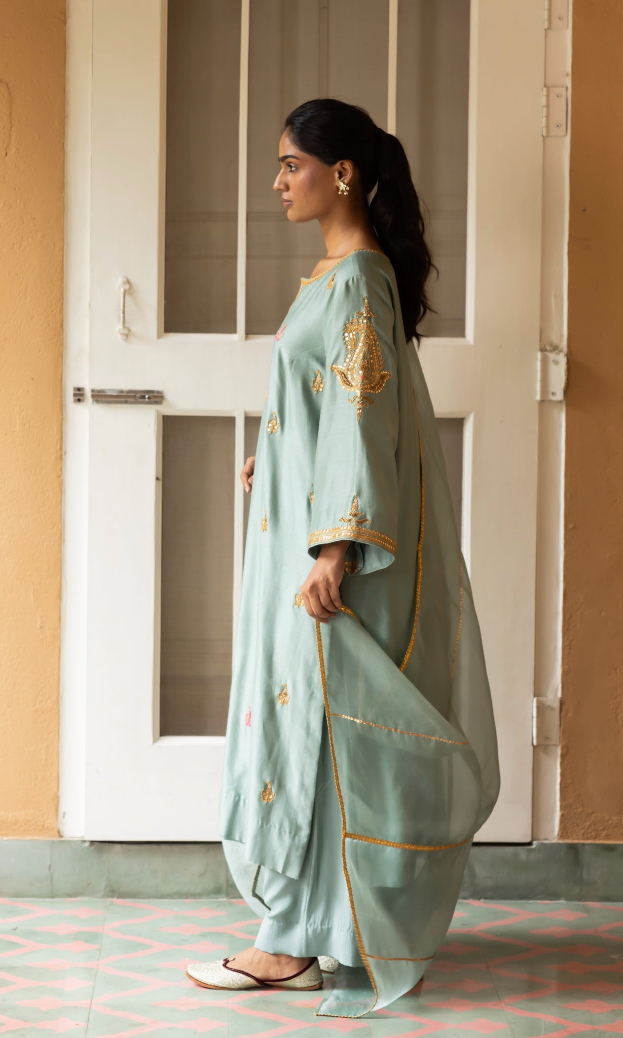 Teal Silk Chanderi long Kurta, Crepe Relaxed Pants and Organza dupatta set with Hand Dori and sequins embroidery