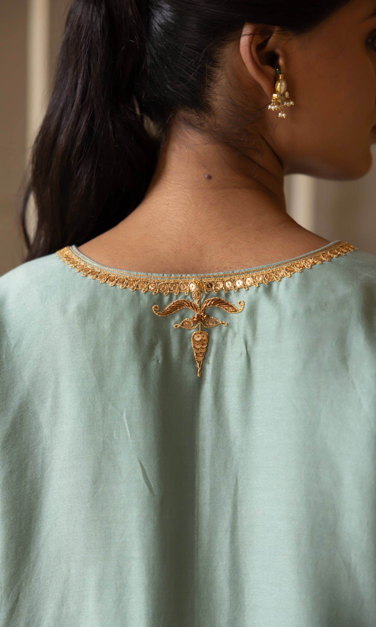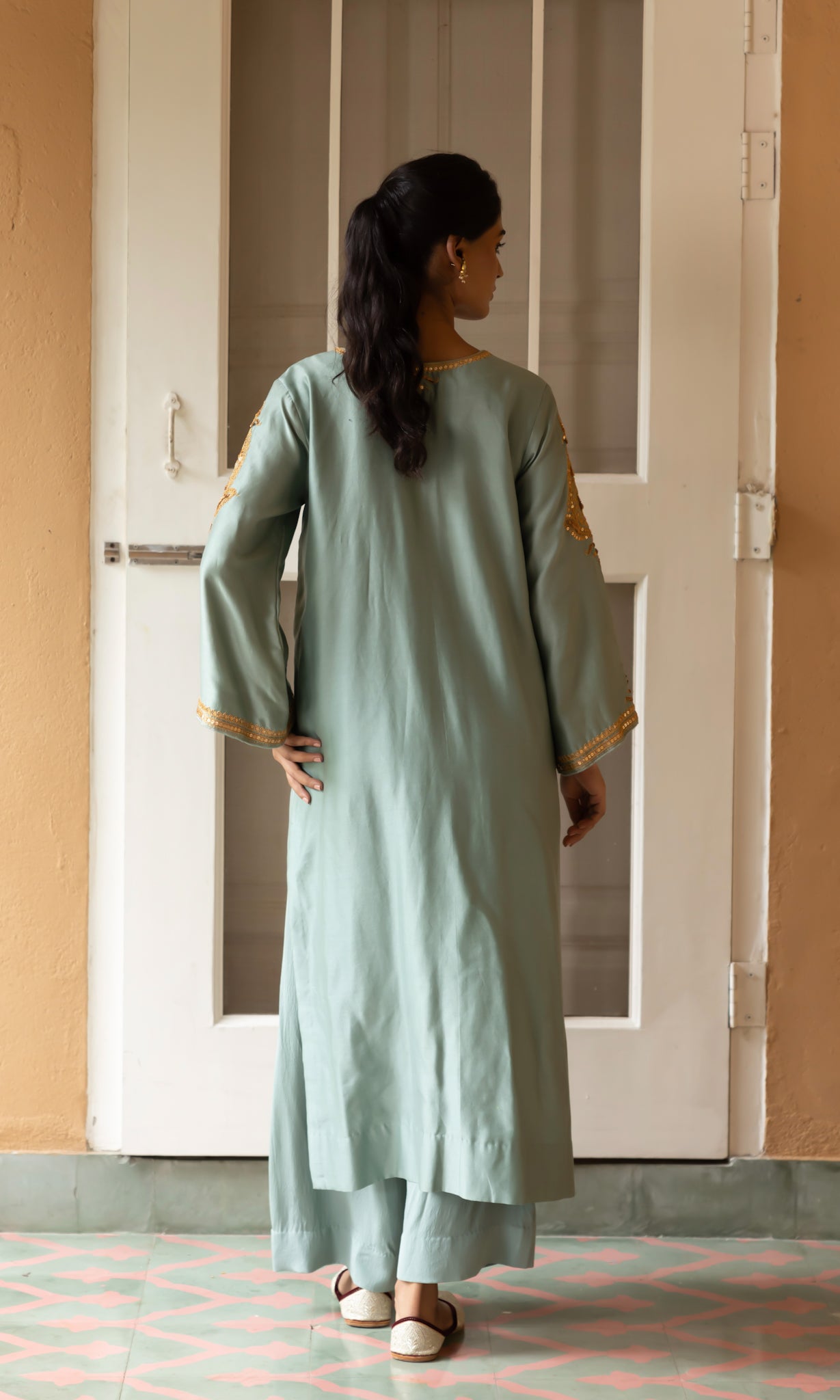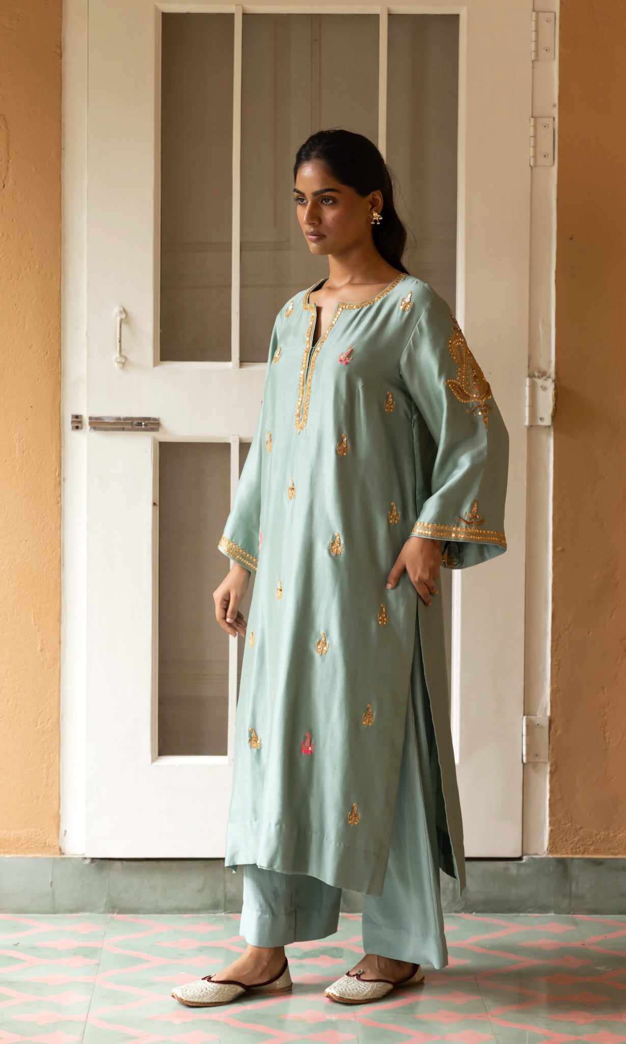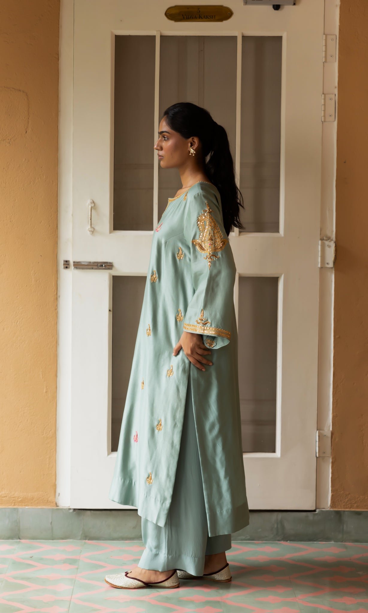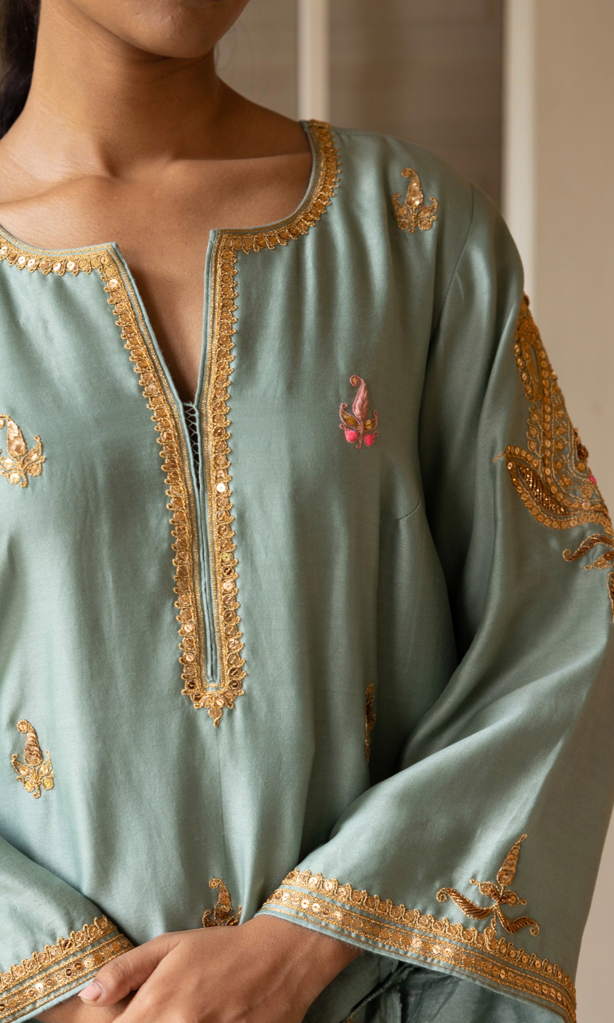 Teal Silk Chanderi long Kurta, Crepe Relaxed Pants and Organza dupatta set with Hand Dori and sequins embroidery