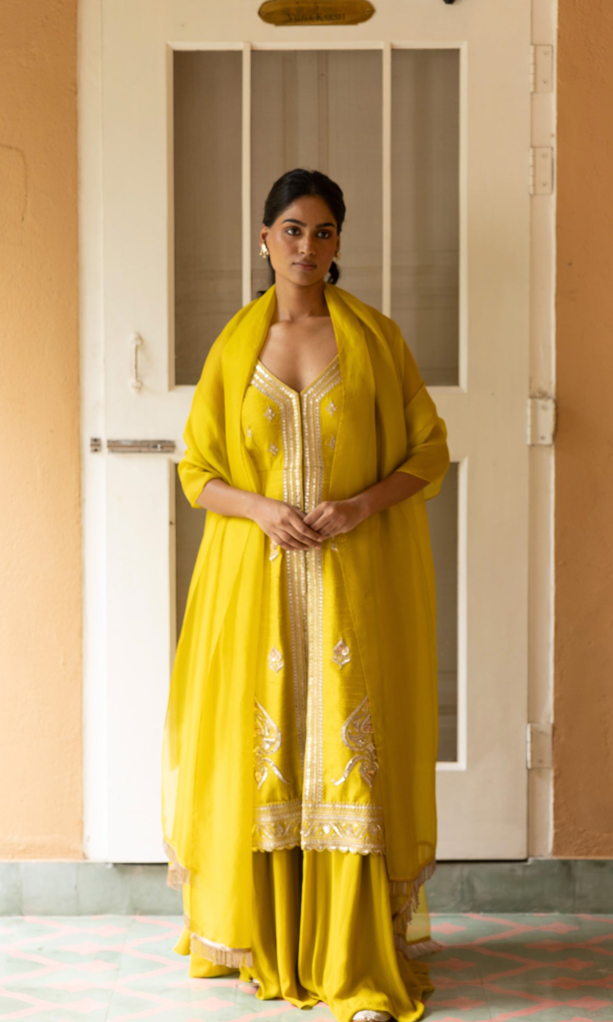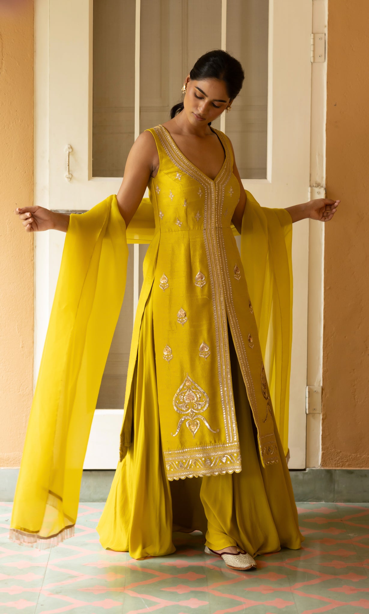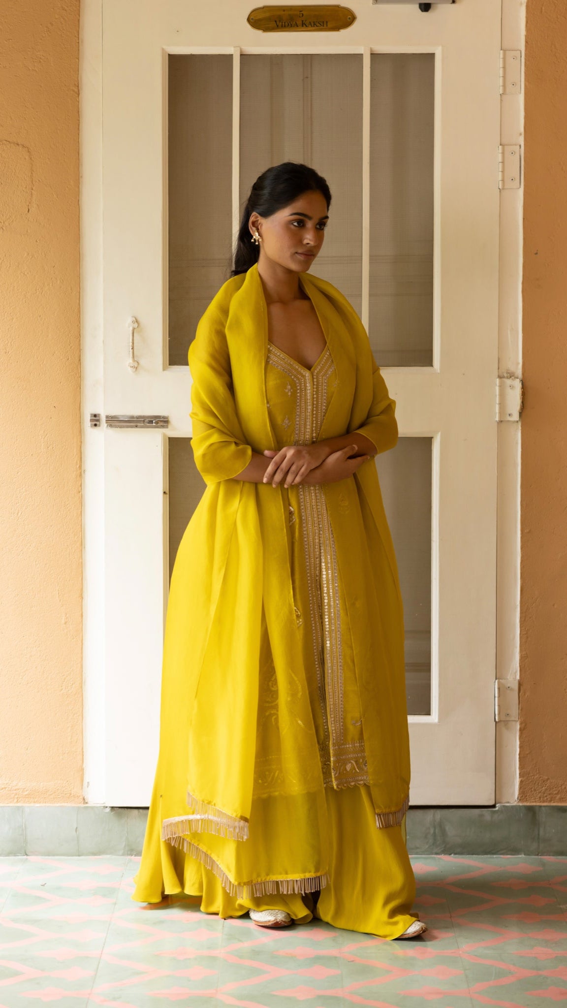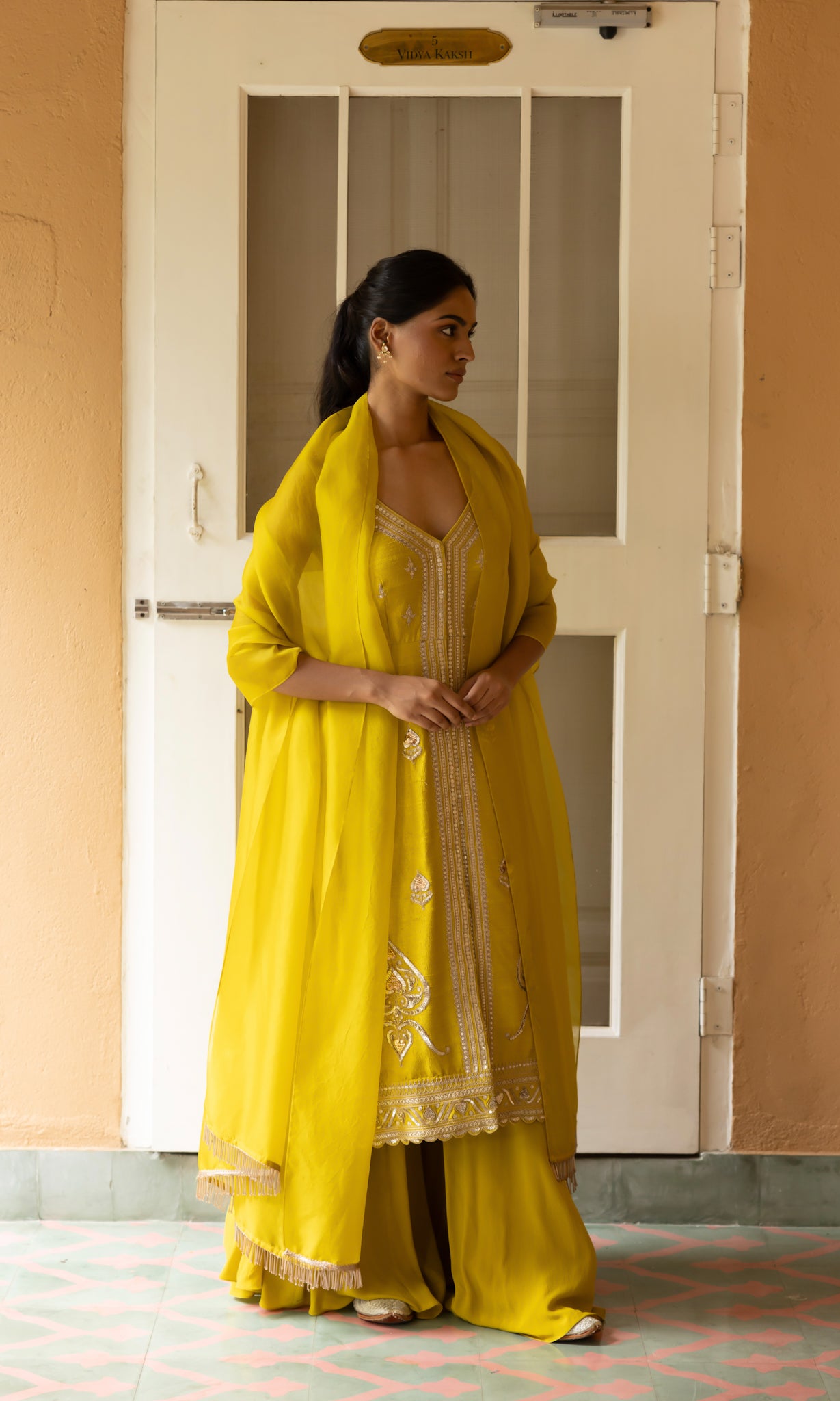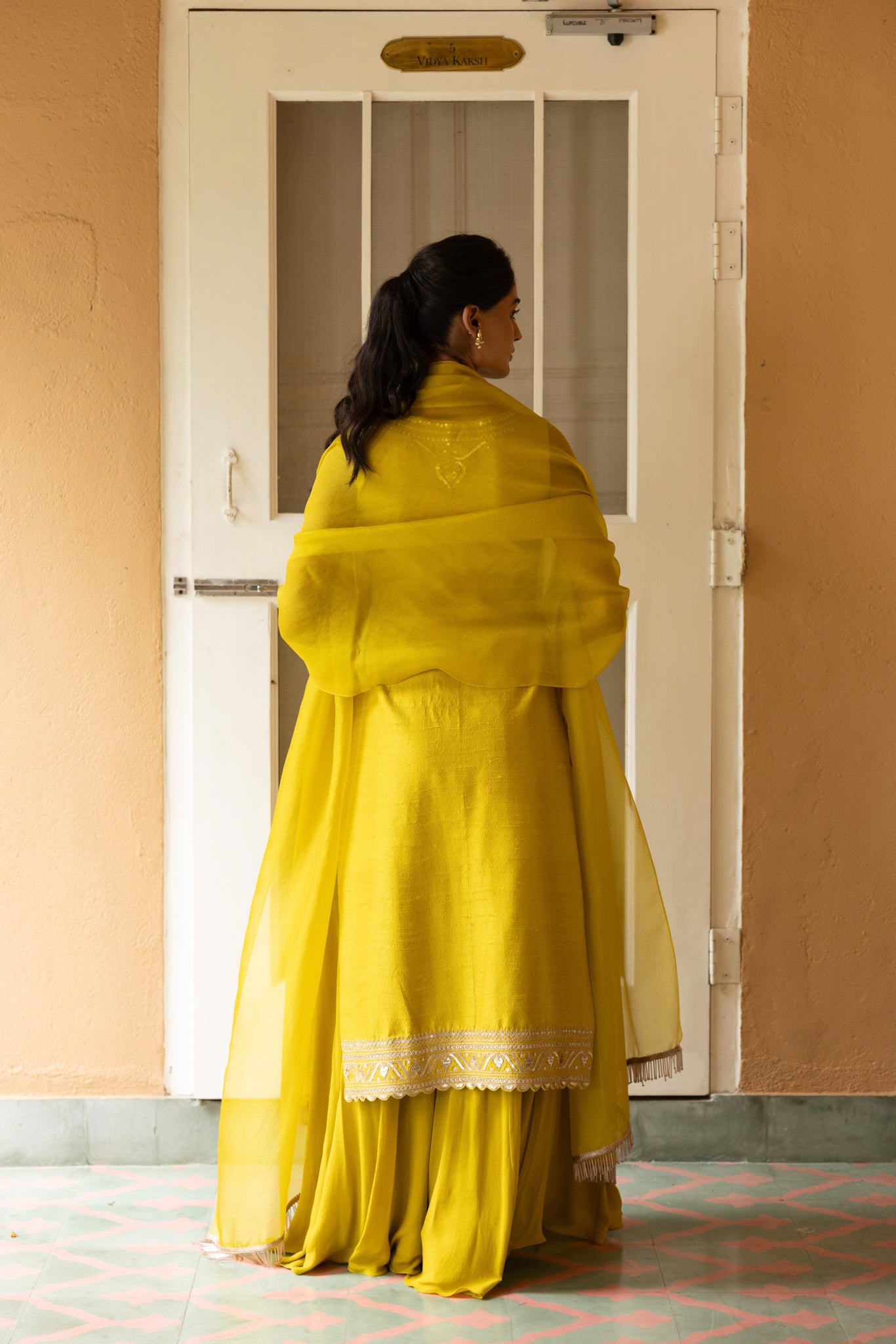 Lime Raw silk Cut sleeves jacket with Hand Dori and sequins embroidery, crepe pallazo and organza dupatta set