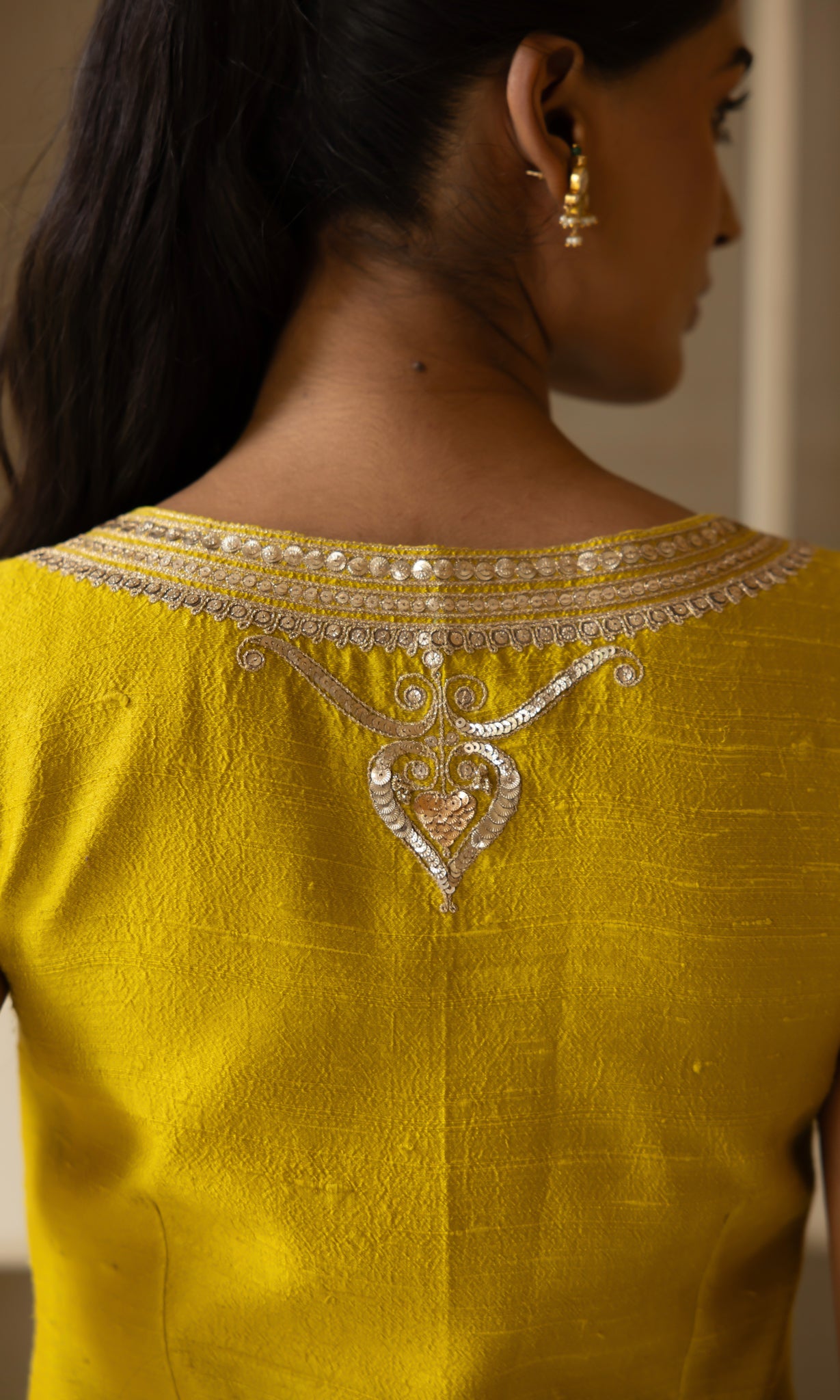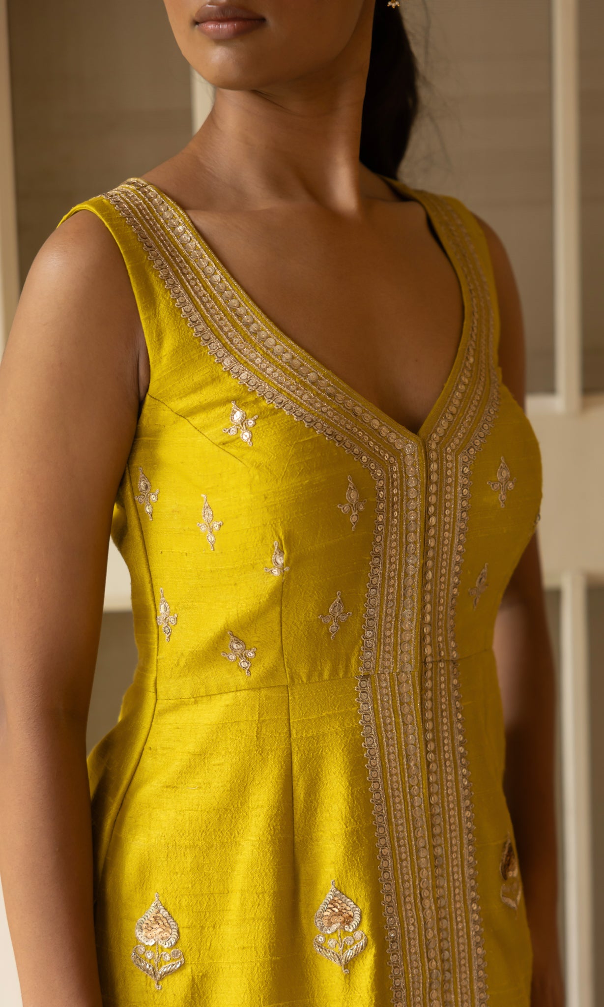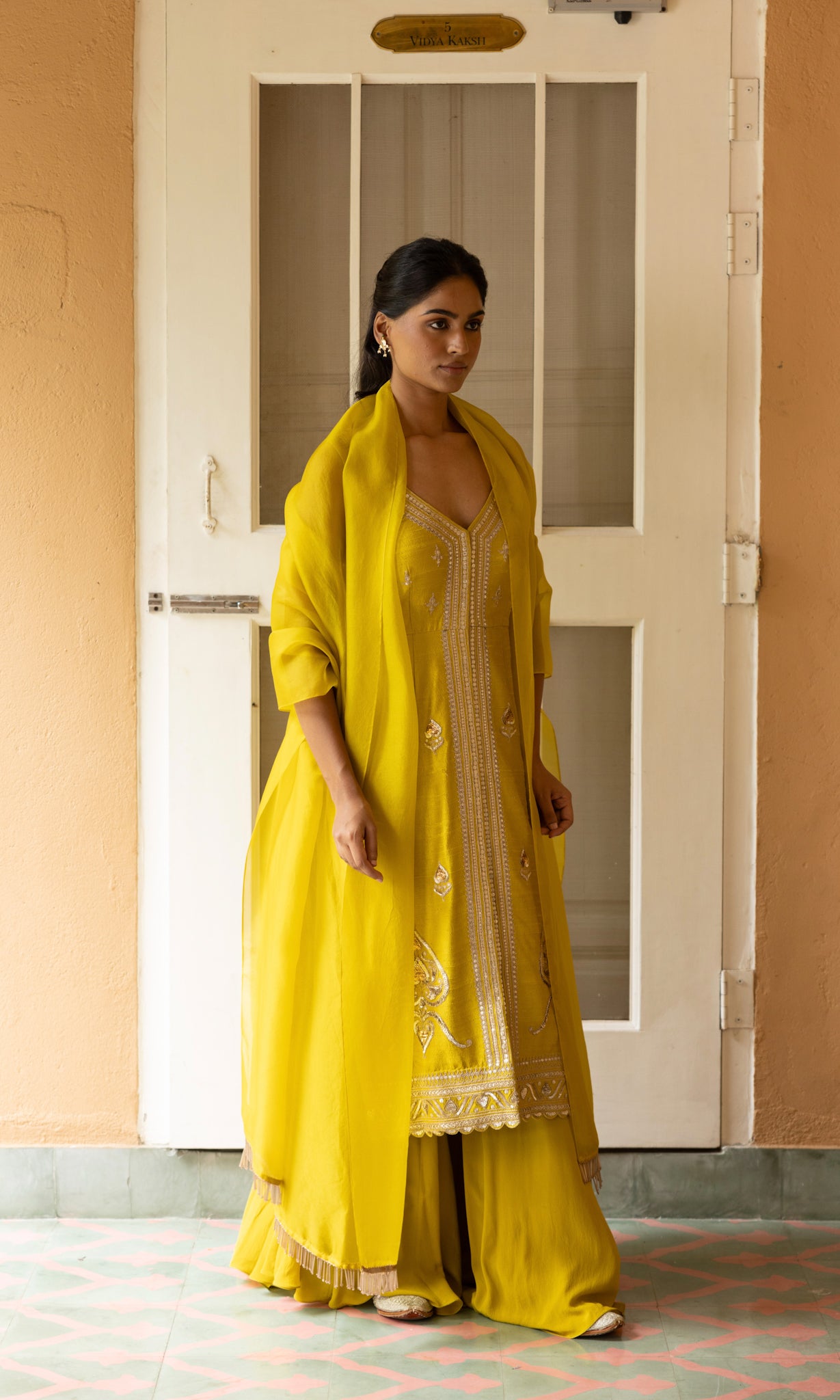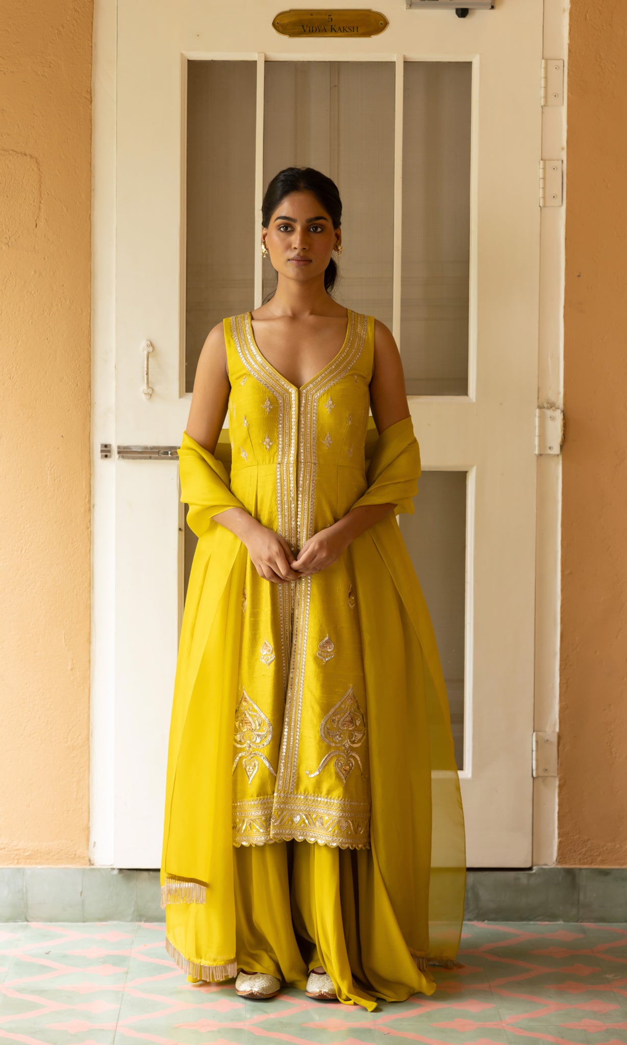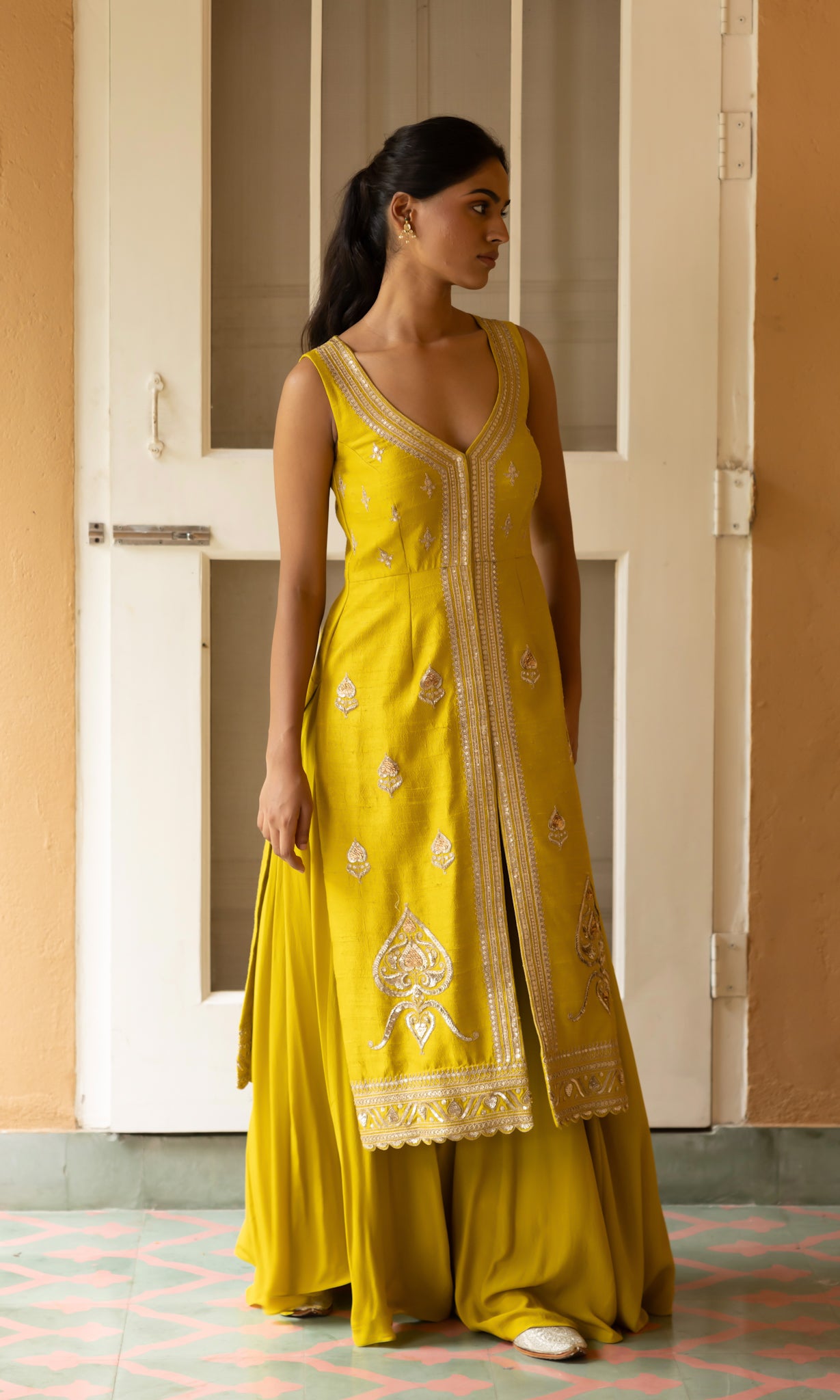 Lime Raw silk Cut sleeves jacket with Hand Dori and sequins embroidery, crepe pallazo and organza dupatta set