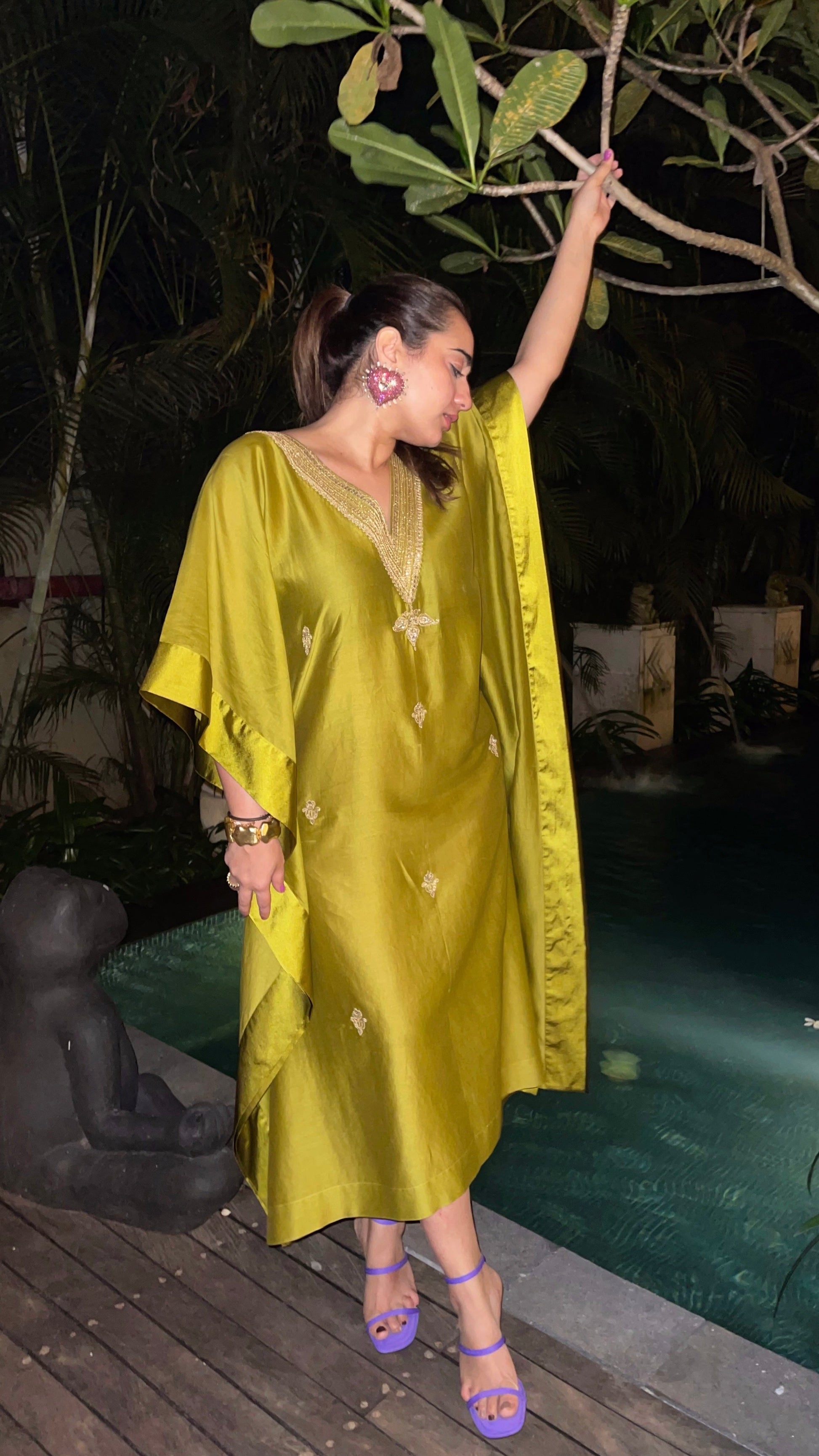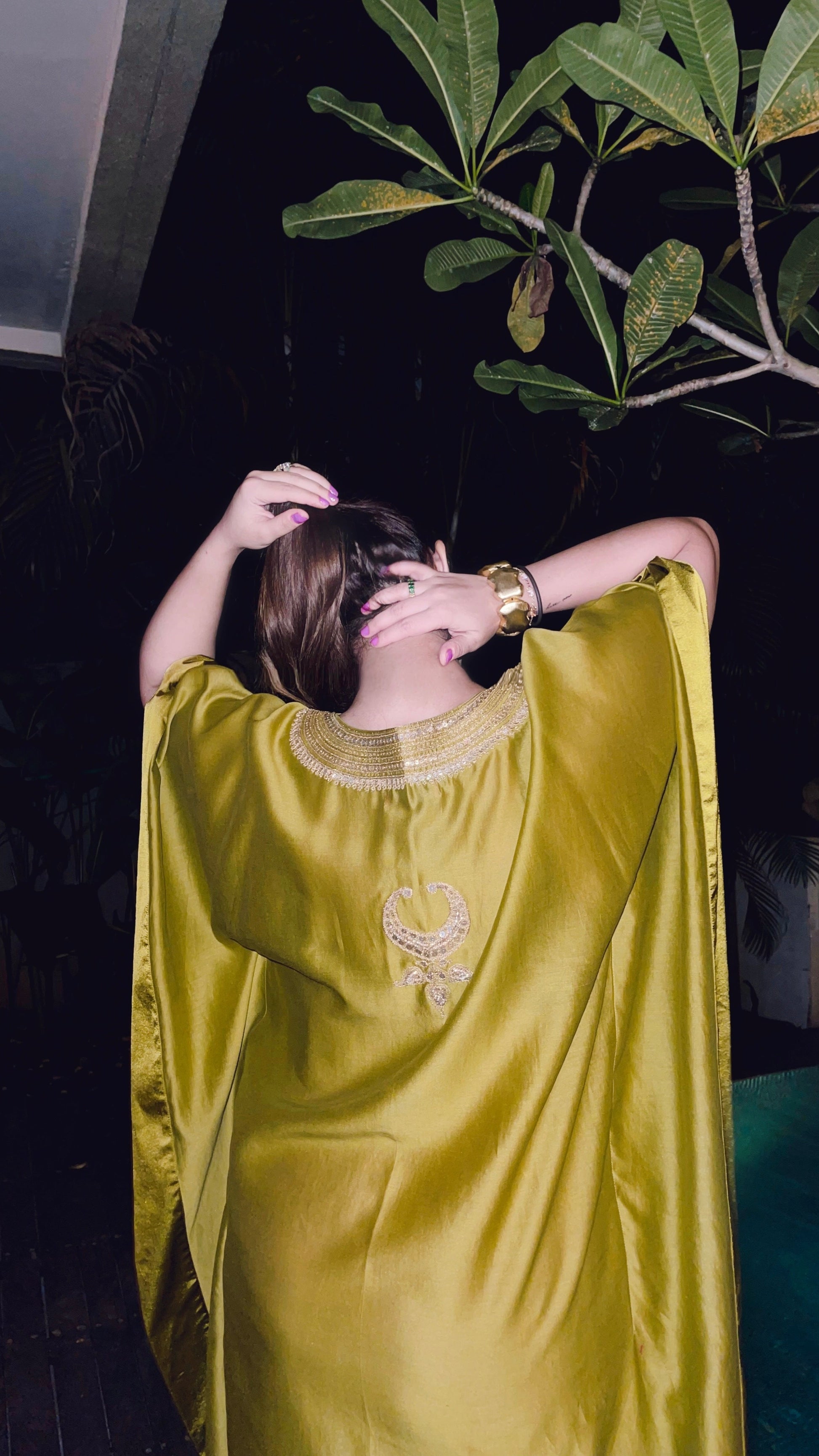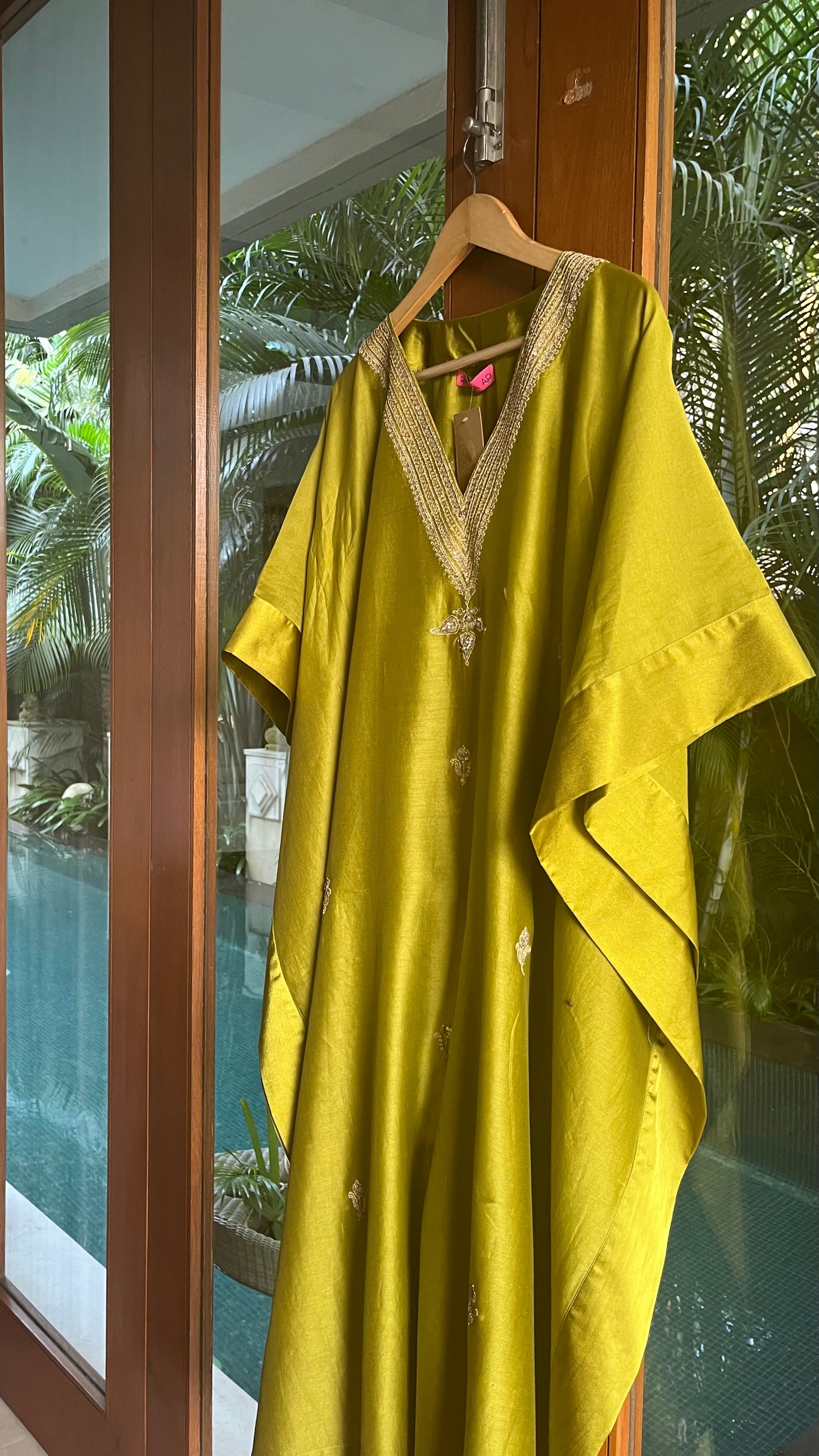 Silk Chanderi and Satin Kaftan with hand Dori, sequins and Naqshi embroidery