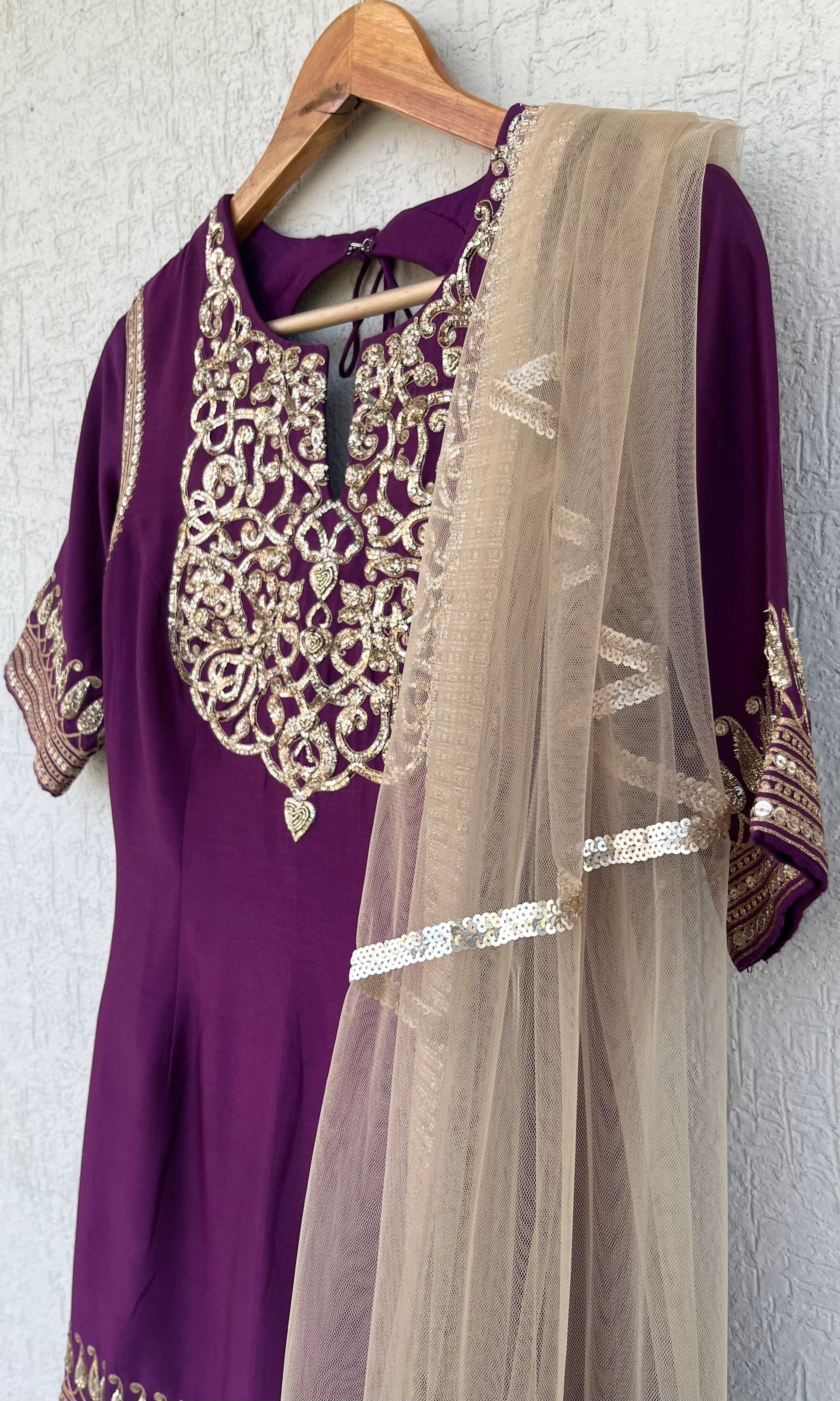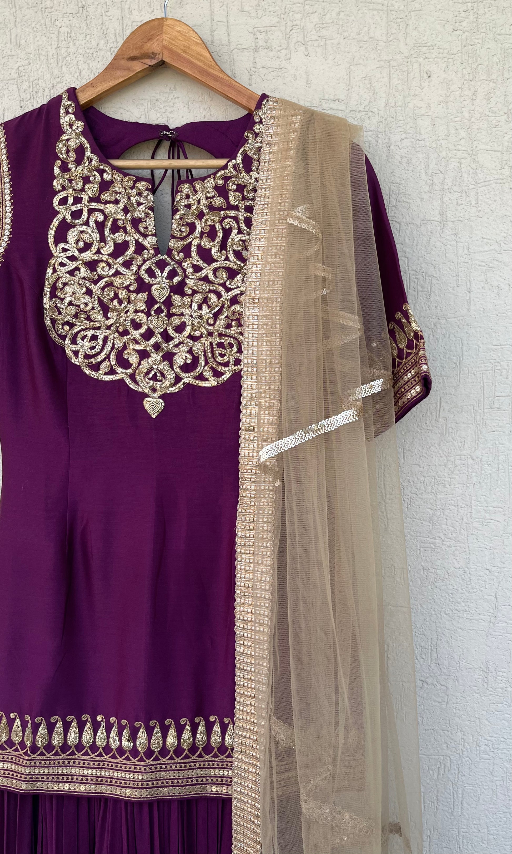 Deep Purple silk Chanderi Kurta, Georgette Gharara and net dupatta set with pitta and aari embroidery