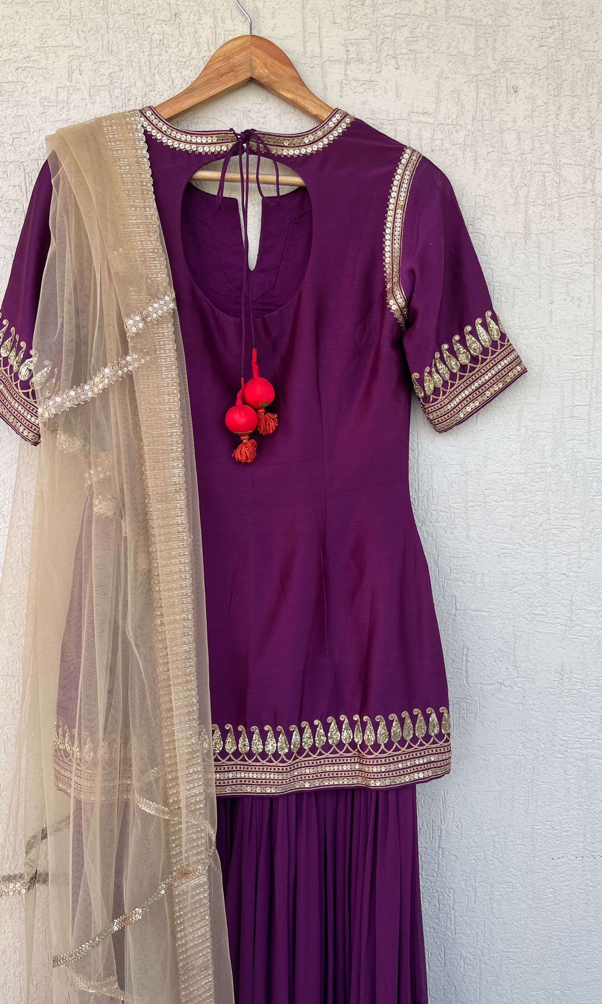 DEEP PURPLE SHORT KURTA GHARARA AND DUPATTA SET