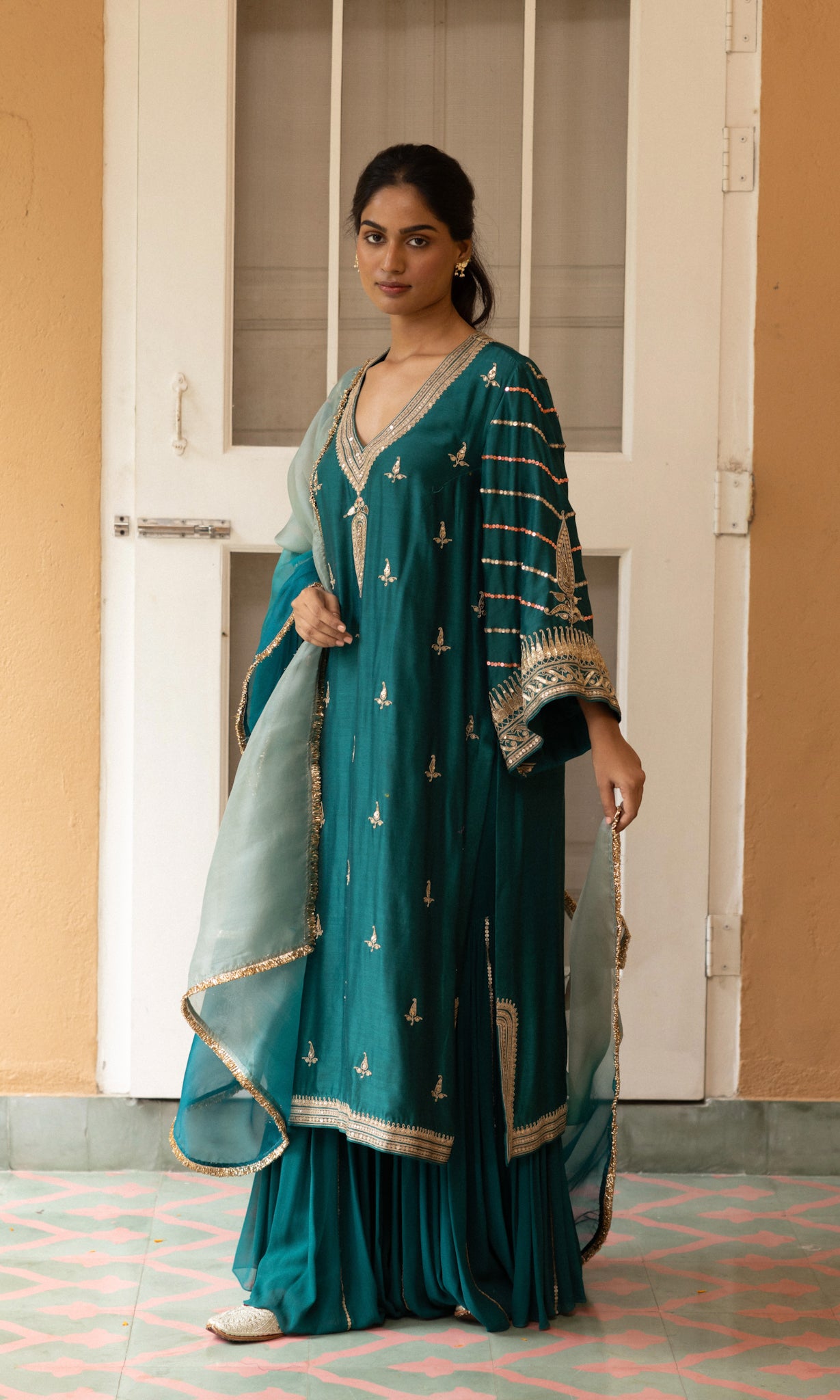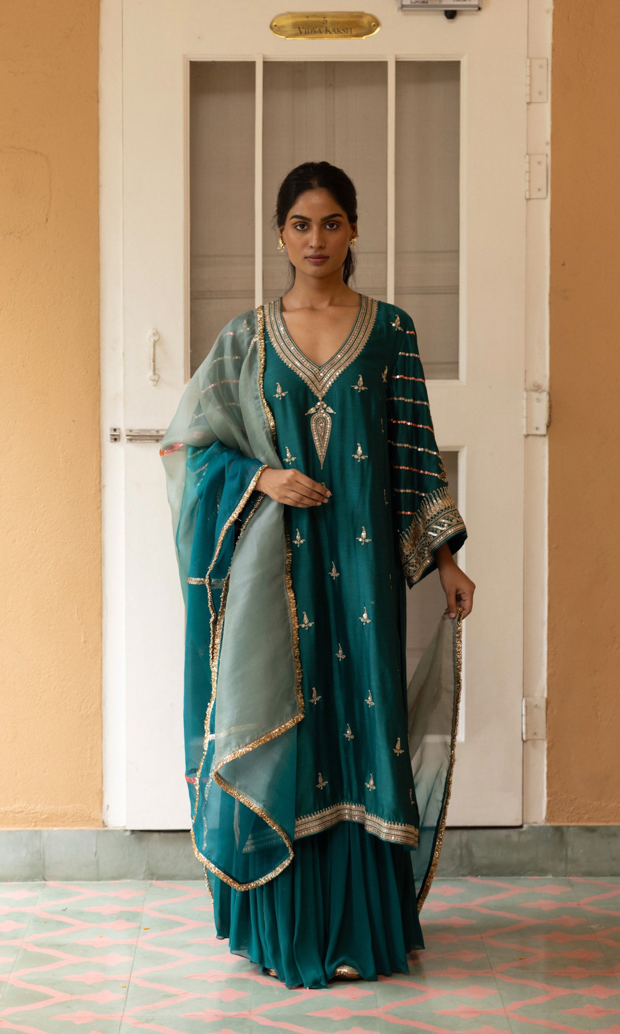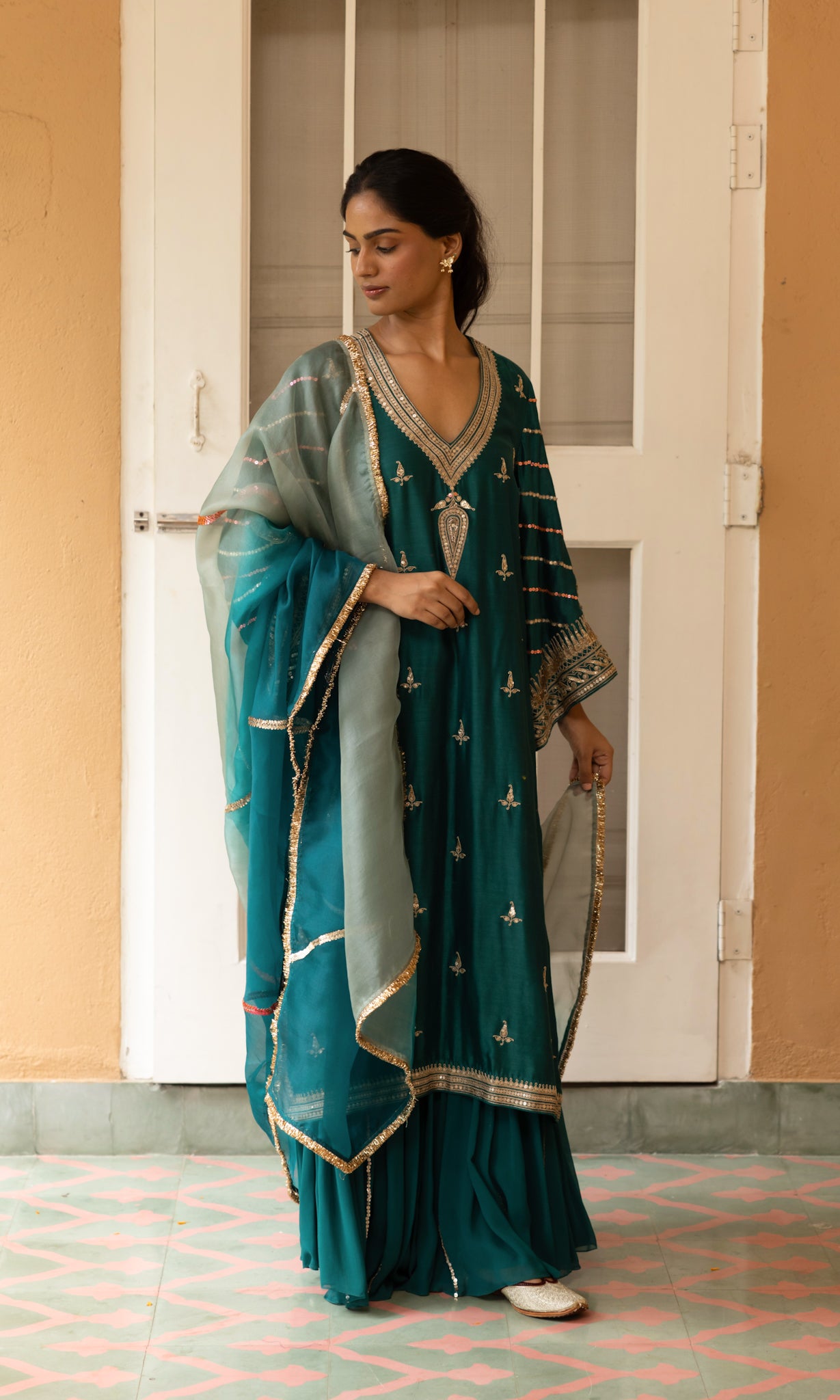 Bottle green Silk Chanderi Long Kurta, Georgette pallazo and Ombré organza dupatta set with Hand Dori and sequins embroidery
