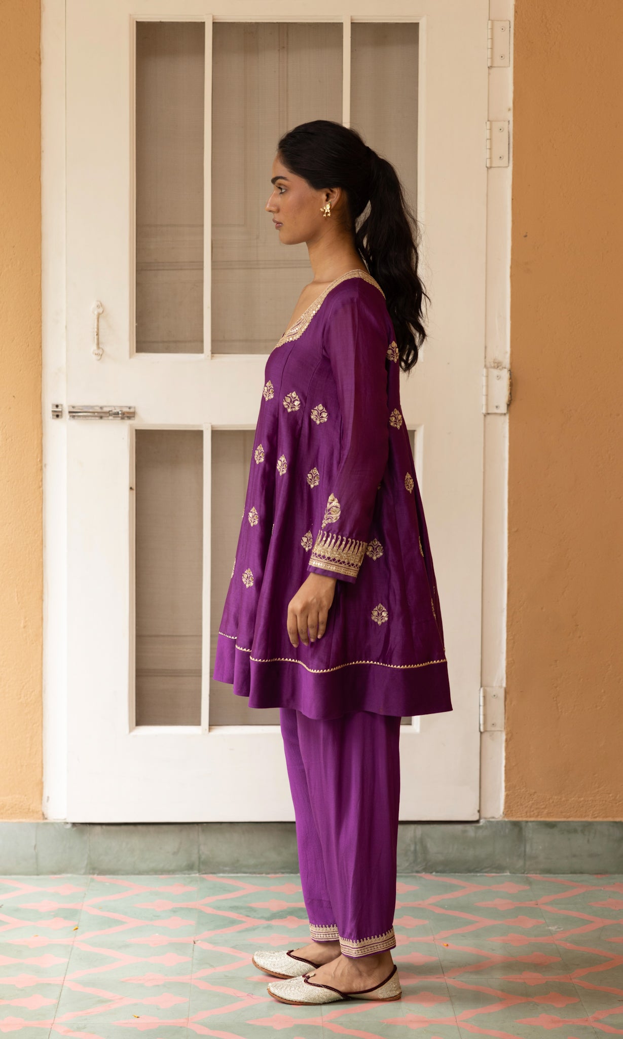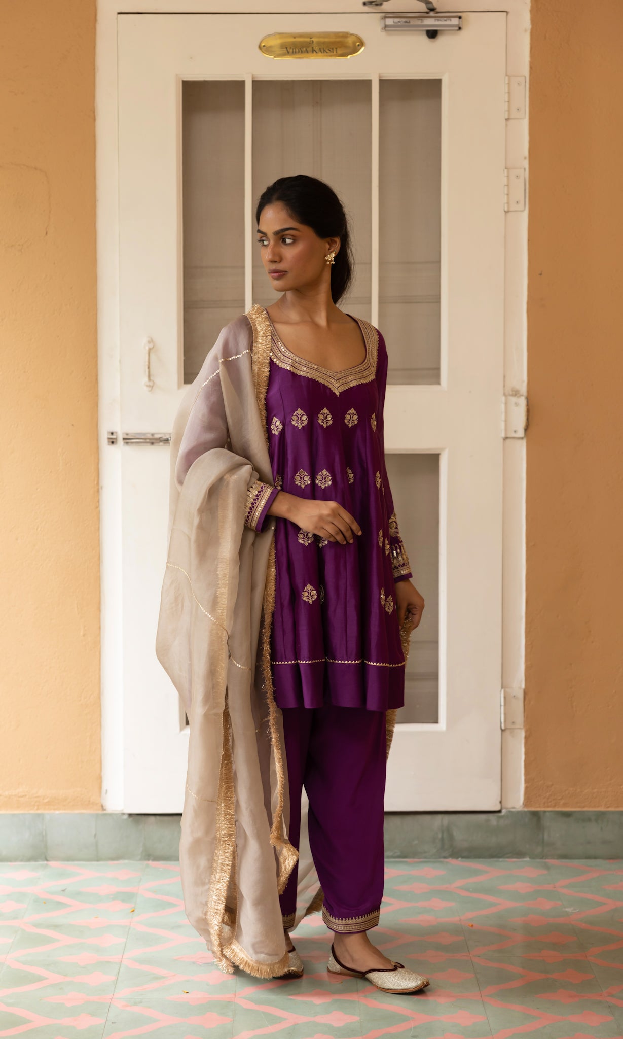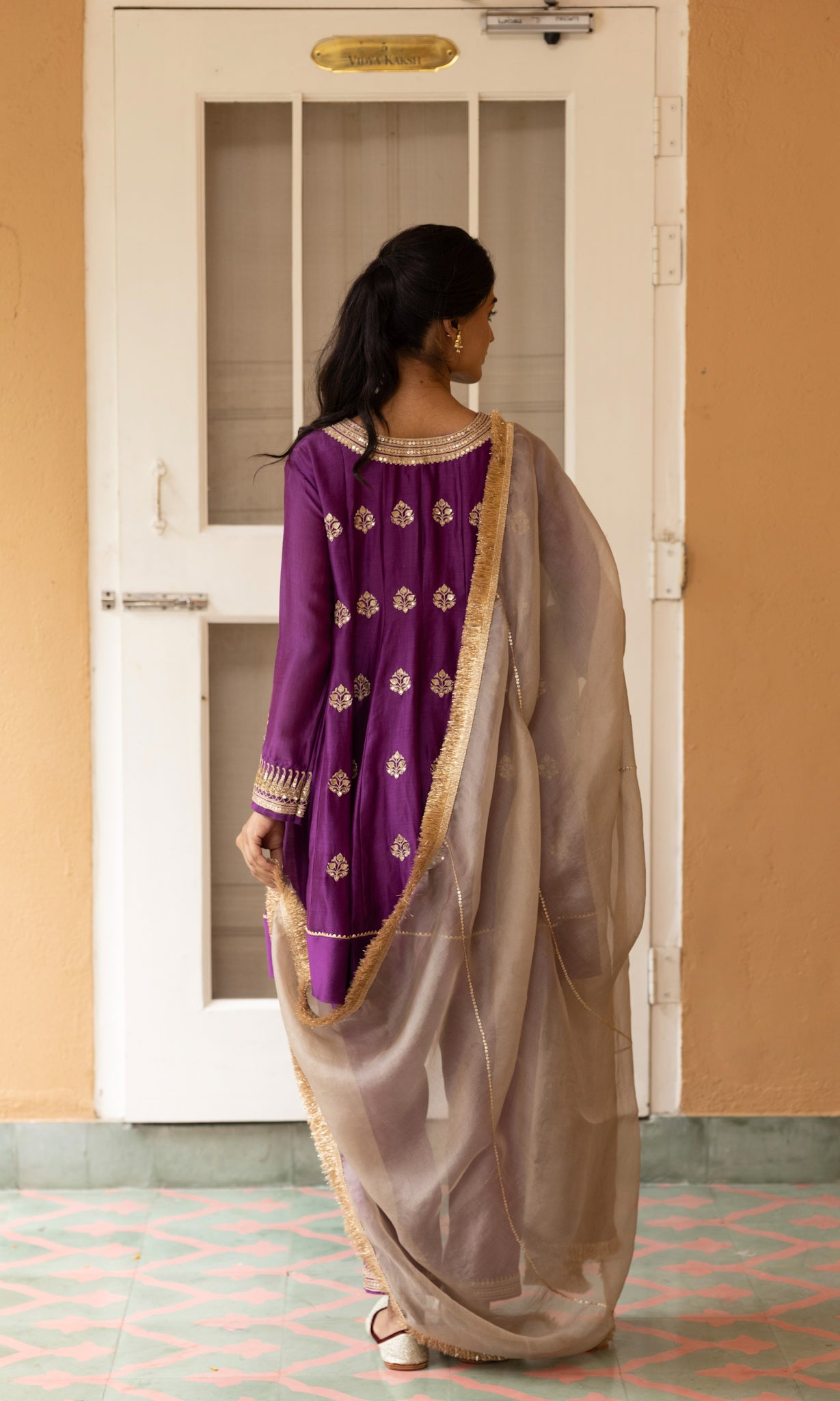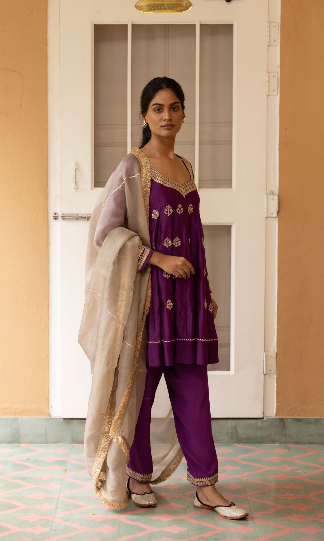 16-Kali Silk Chanderi Short Kurta, Crepe tapered salwars and Beige-grey Organza dupatta set with Hand Dori, zari and sequins embroidery