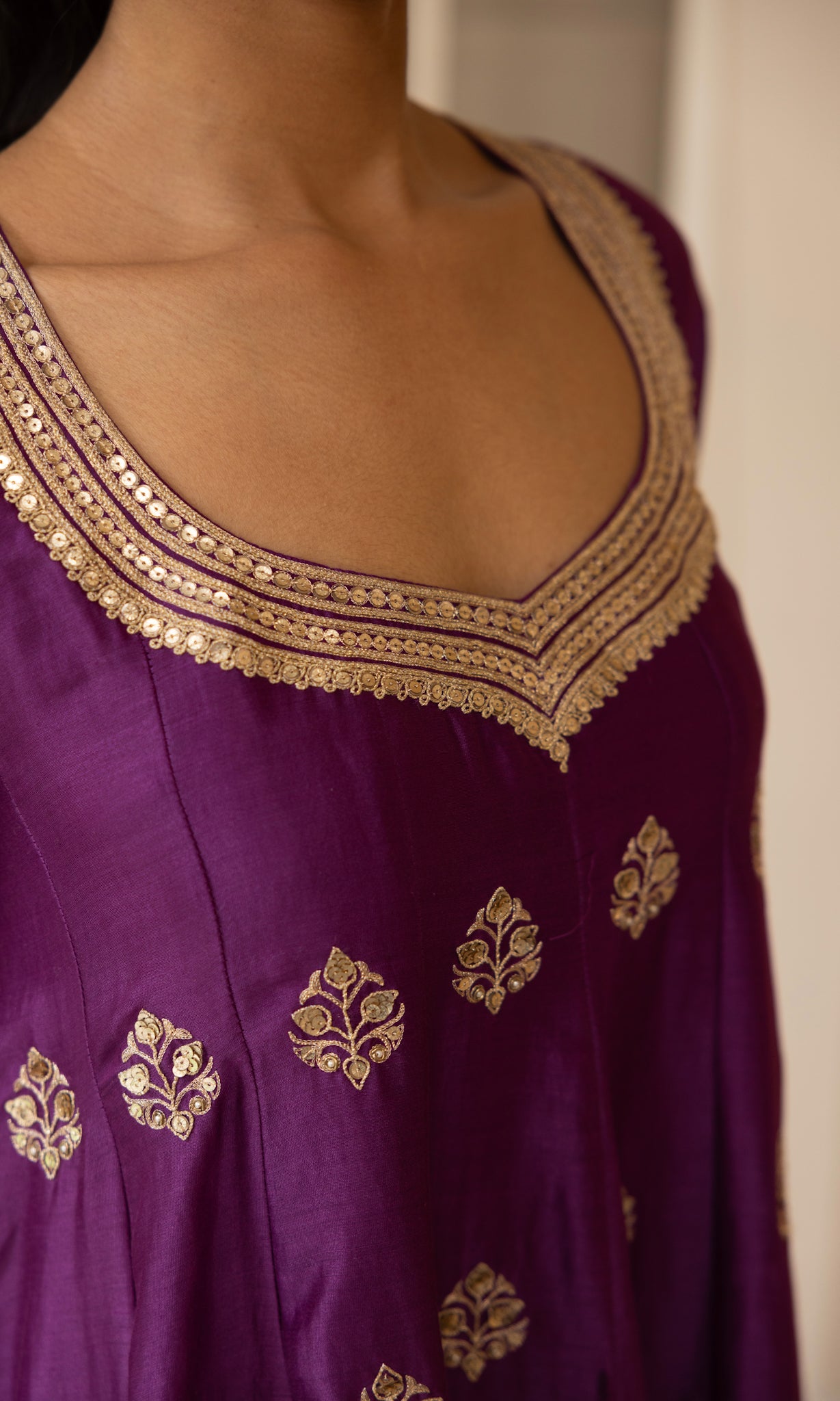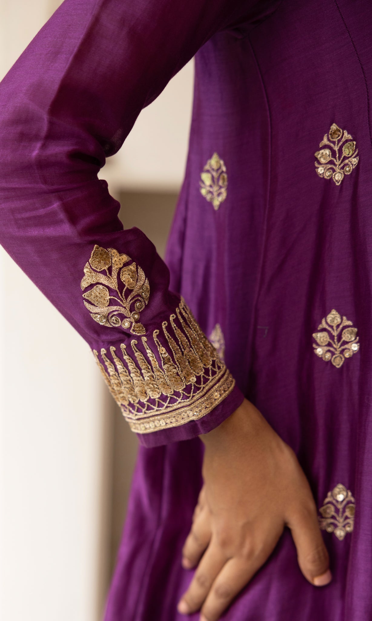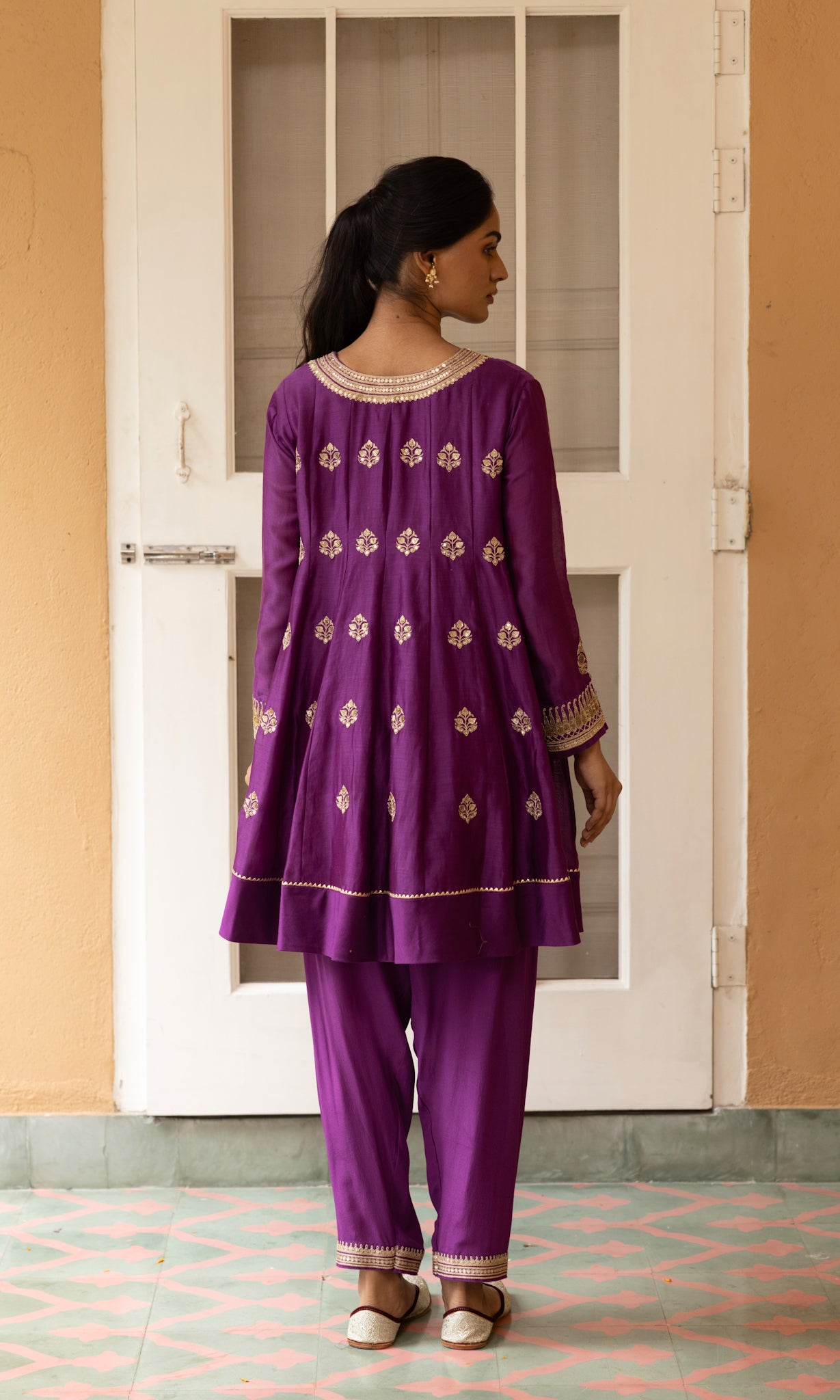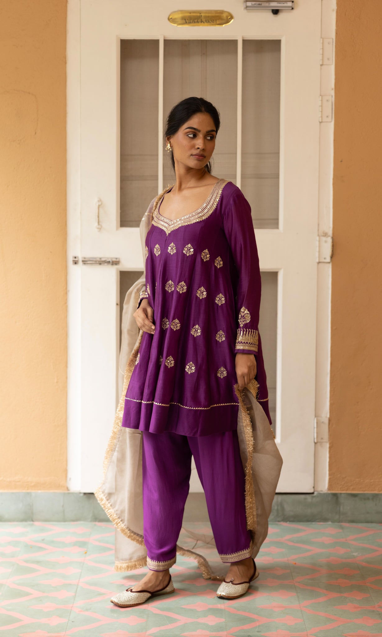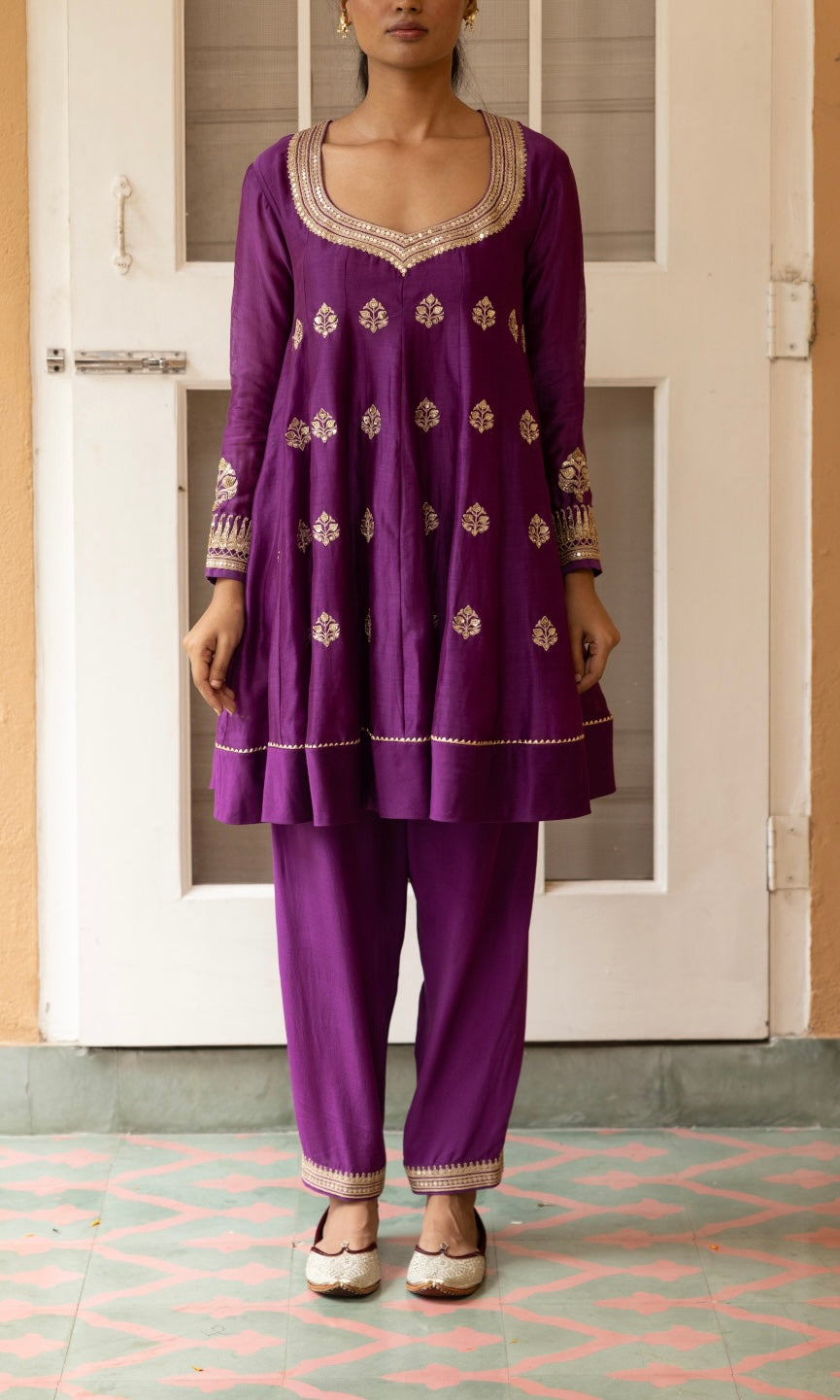 16-Kali Silk Chanderi Short Kurta, Crepe tapered salwars and Beige-grey Organza dupatta set with Hand Dori, zari and sequins embroidery