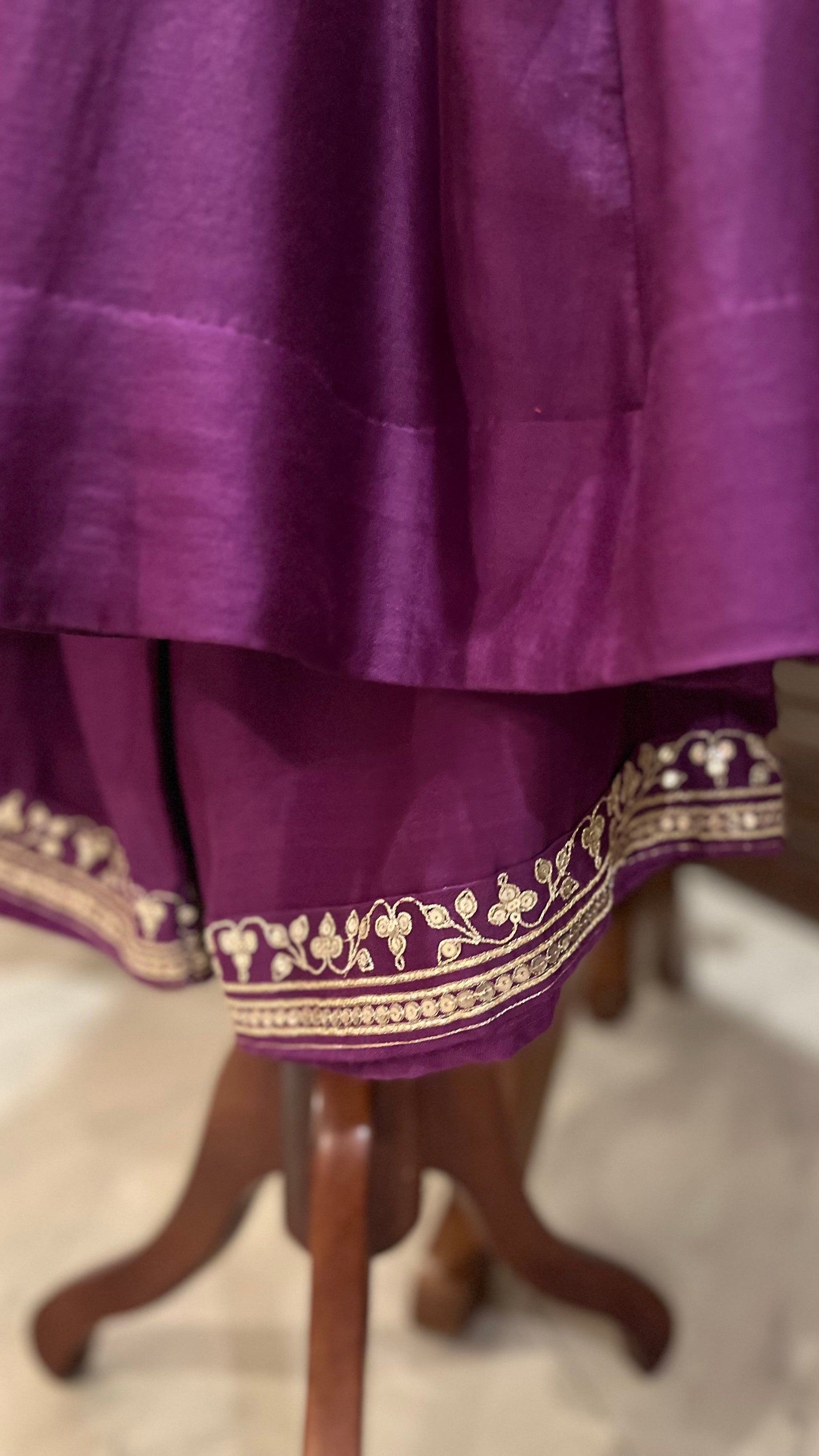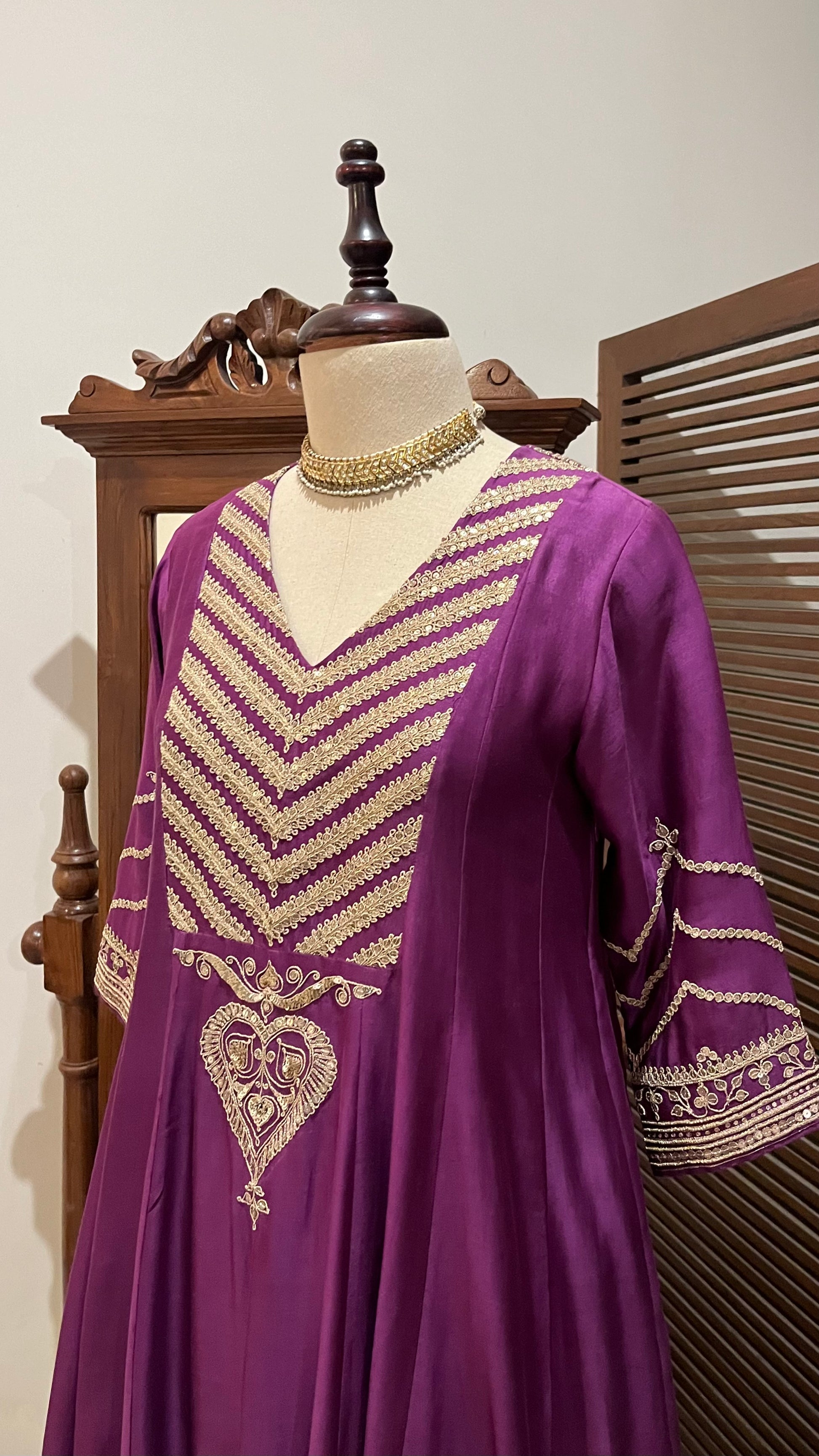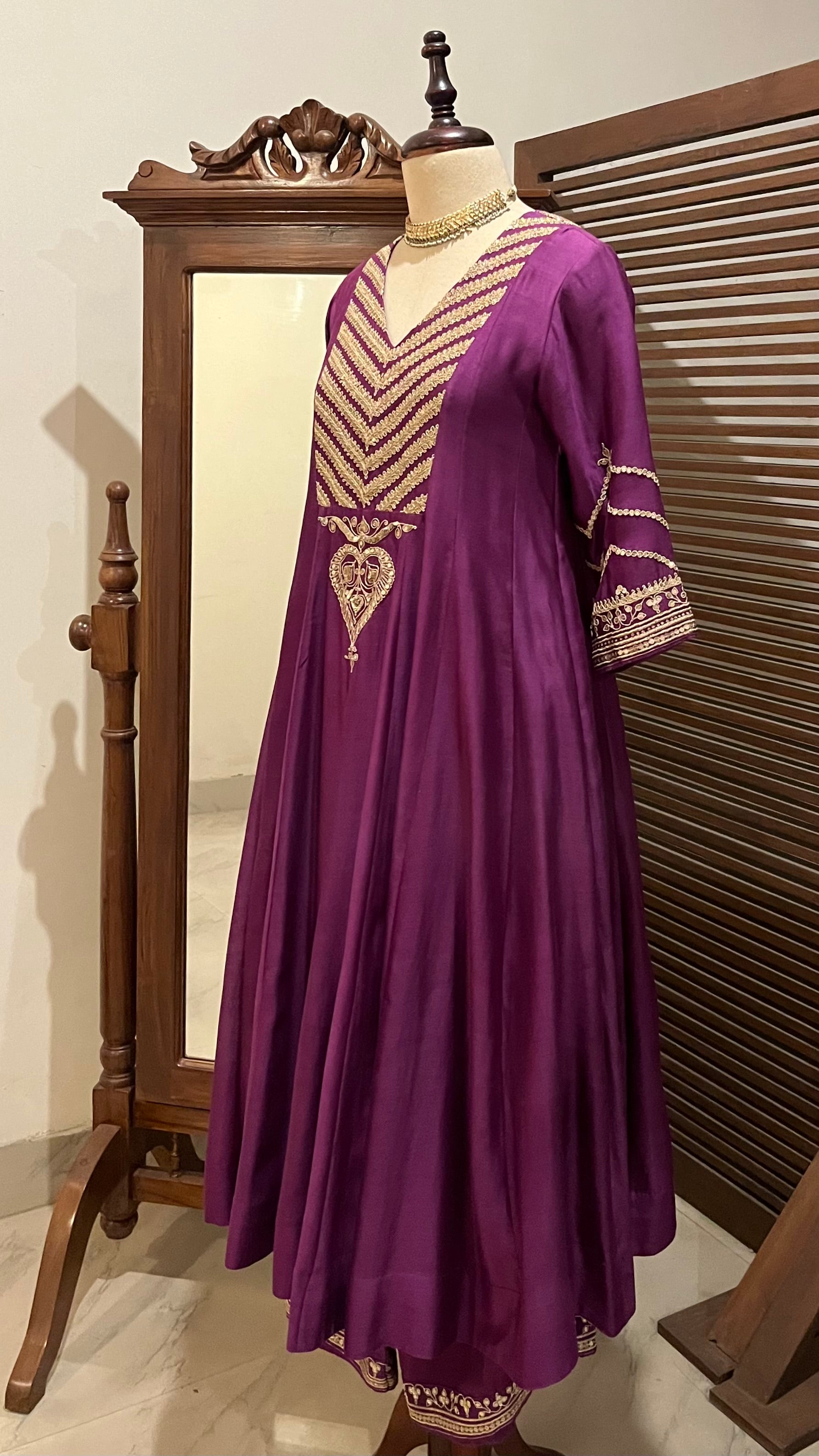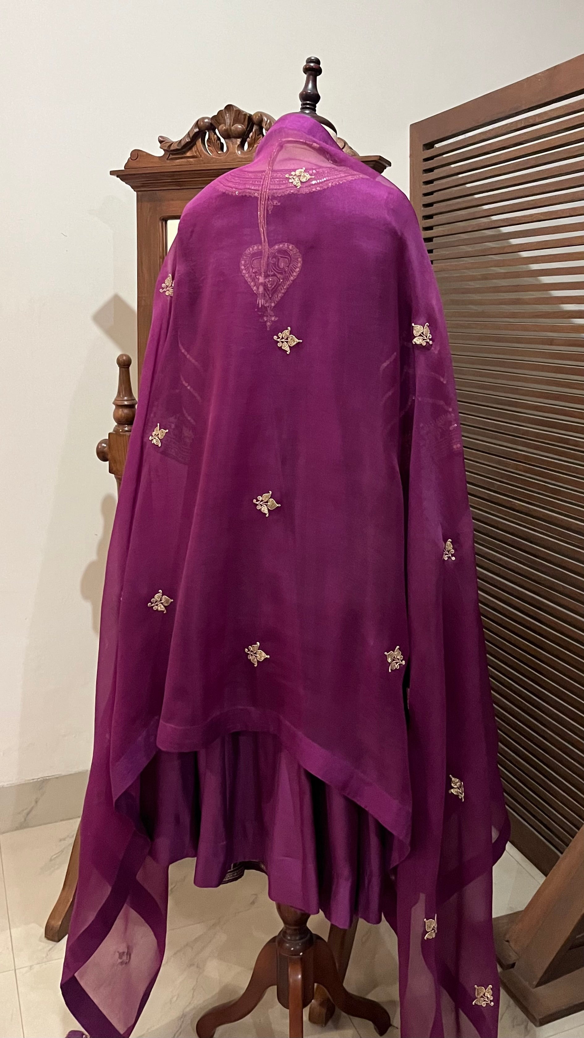 Purple Chanderi Kalidaar kurta, relaxed pants and organza dupatta with hand dori and sequins embroidery