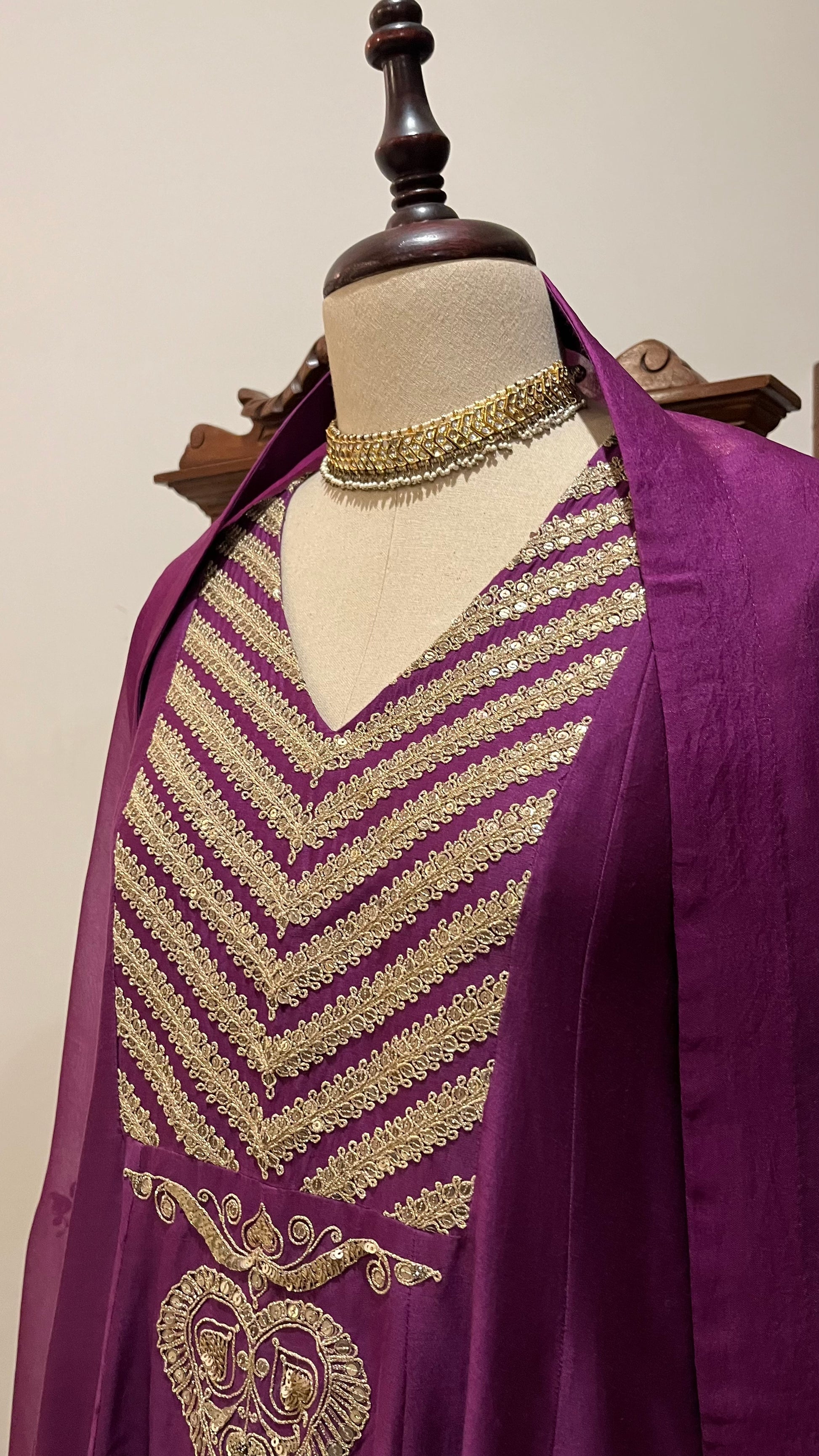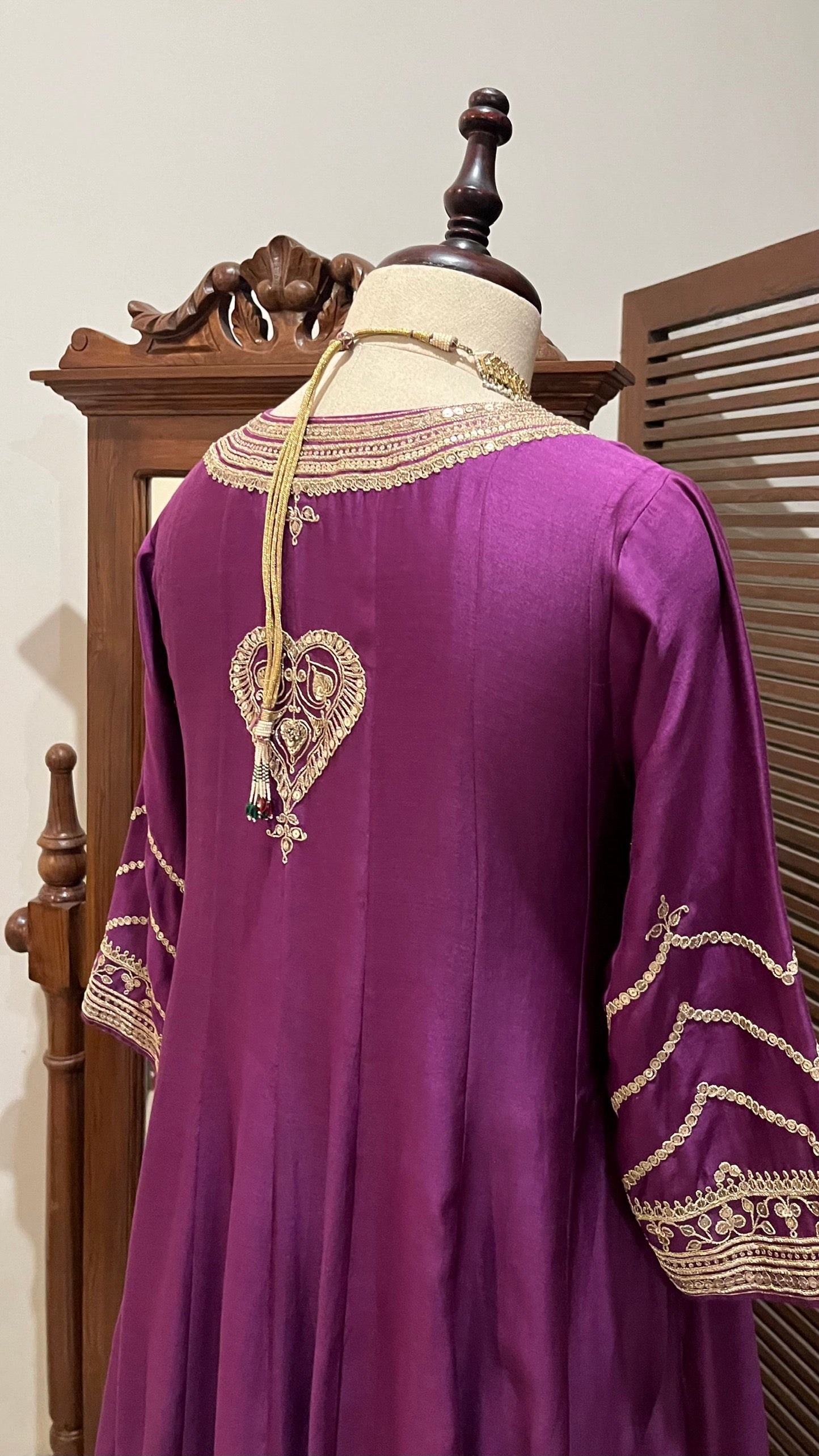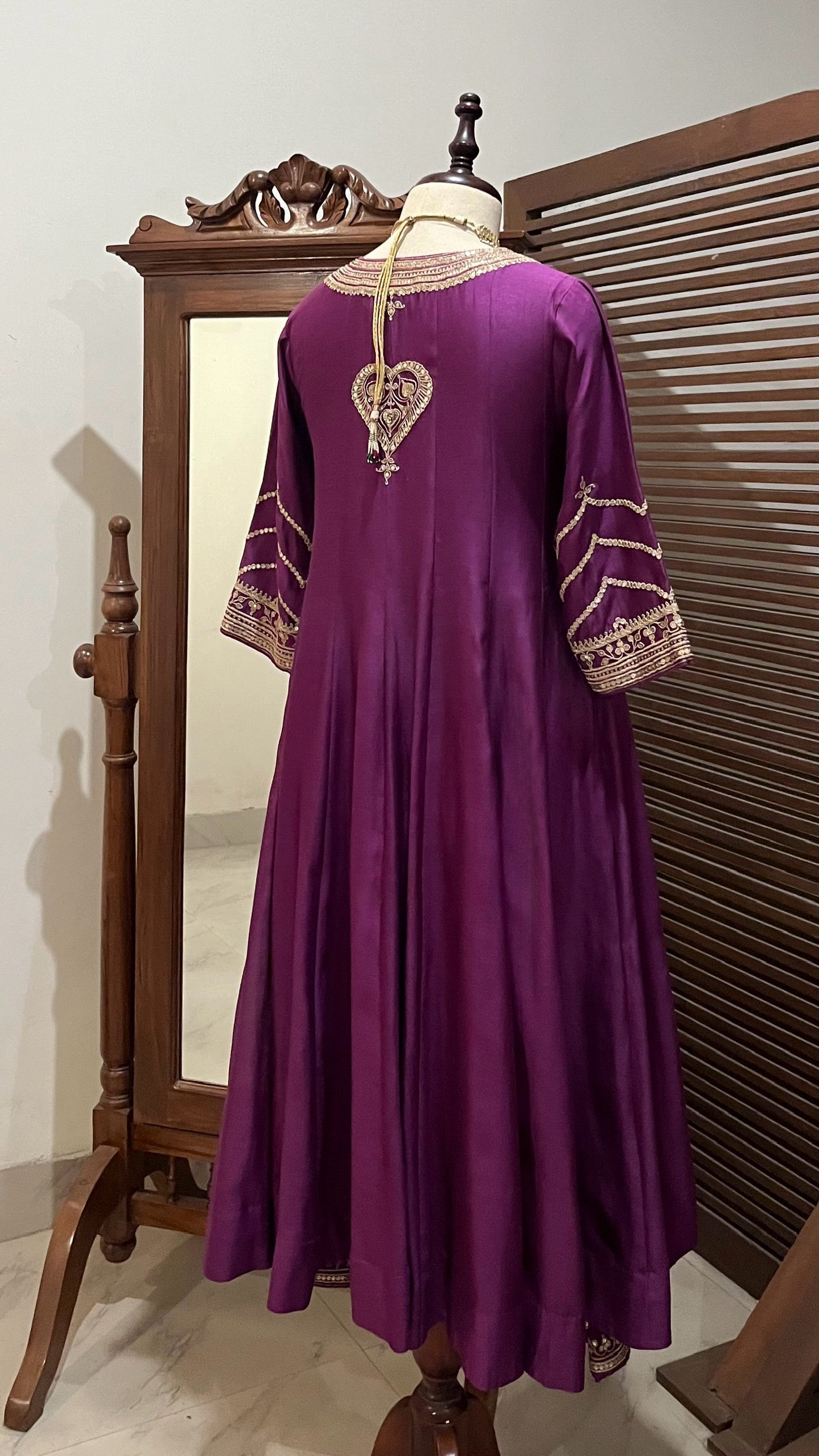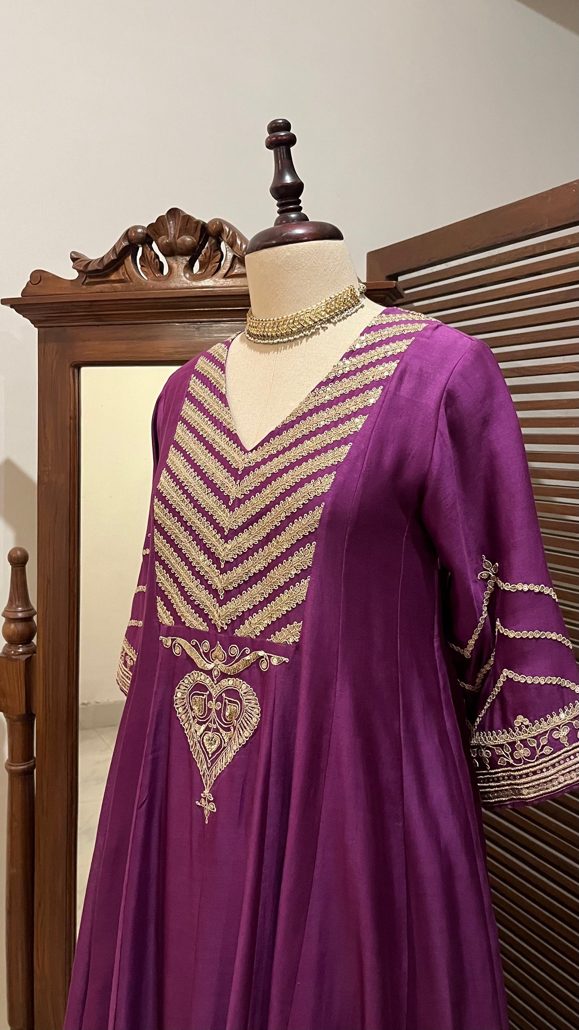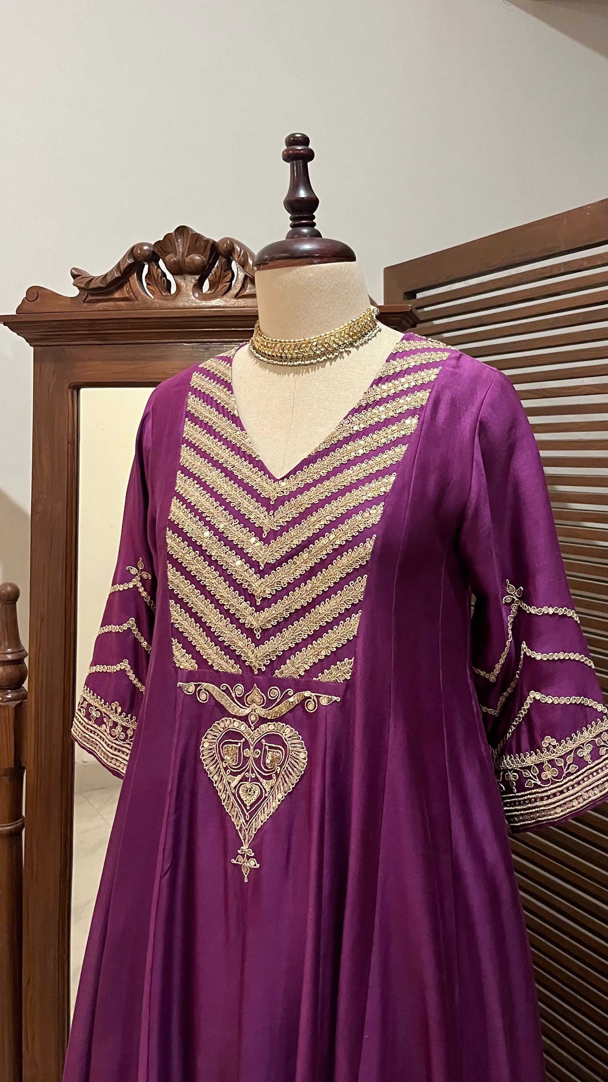 Purple Chanderi Kalidaar kurta, relaxed pants and organza dupatta with hand dori and sequins embroidery