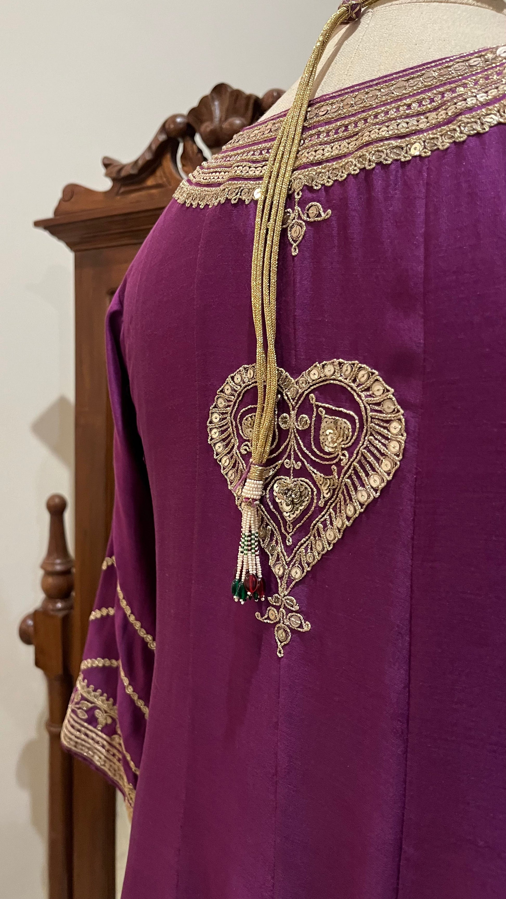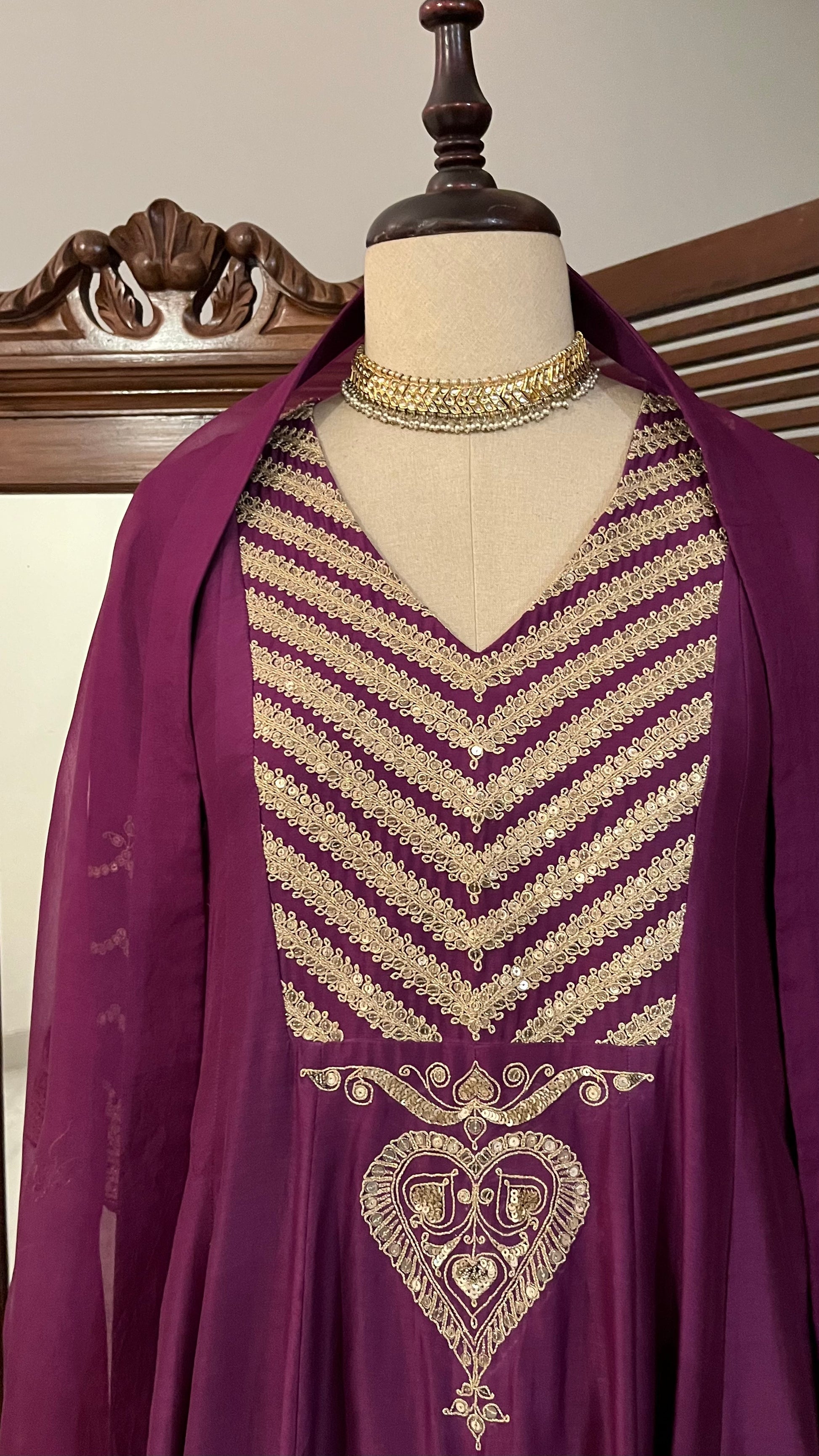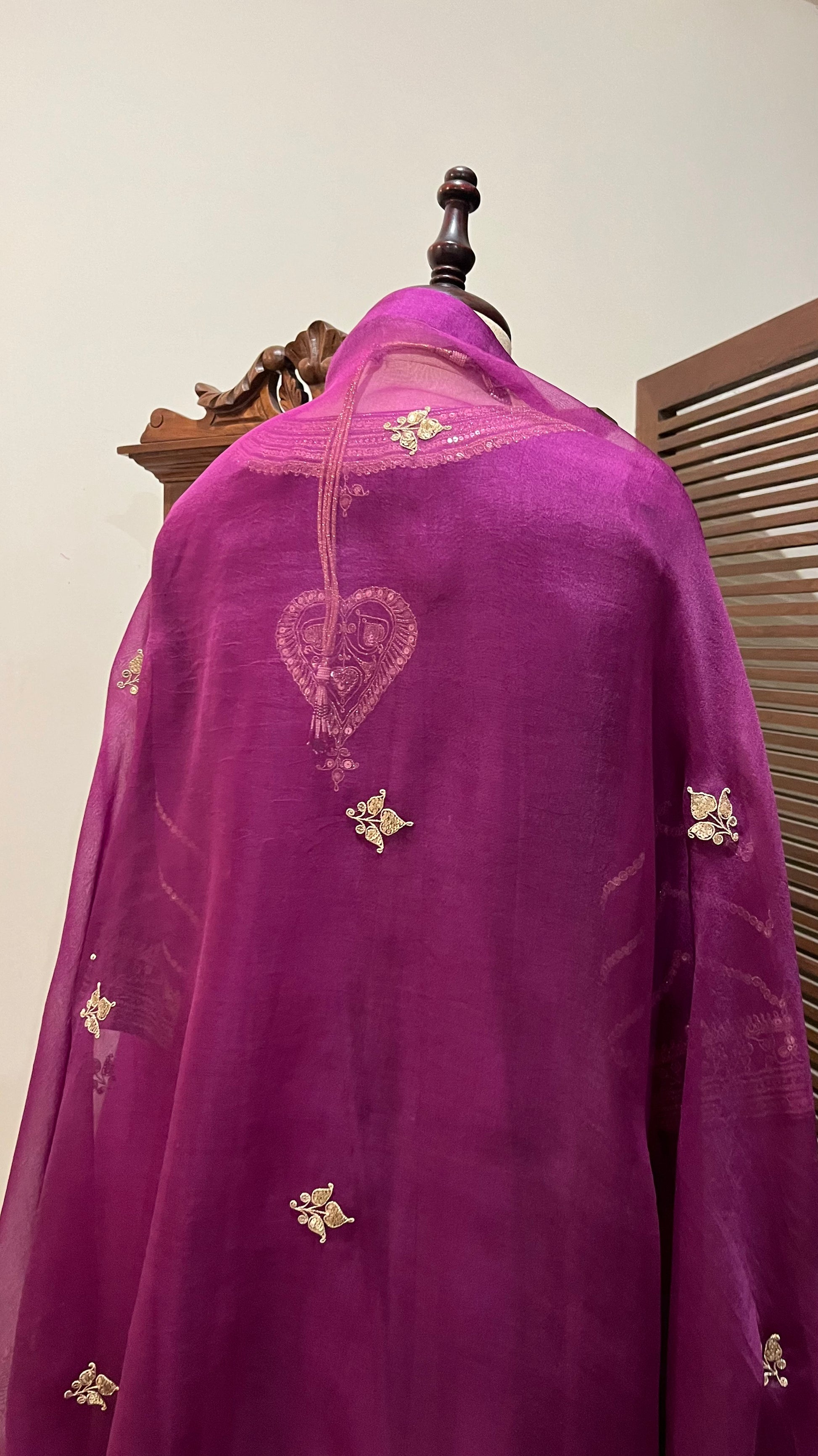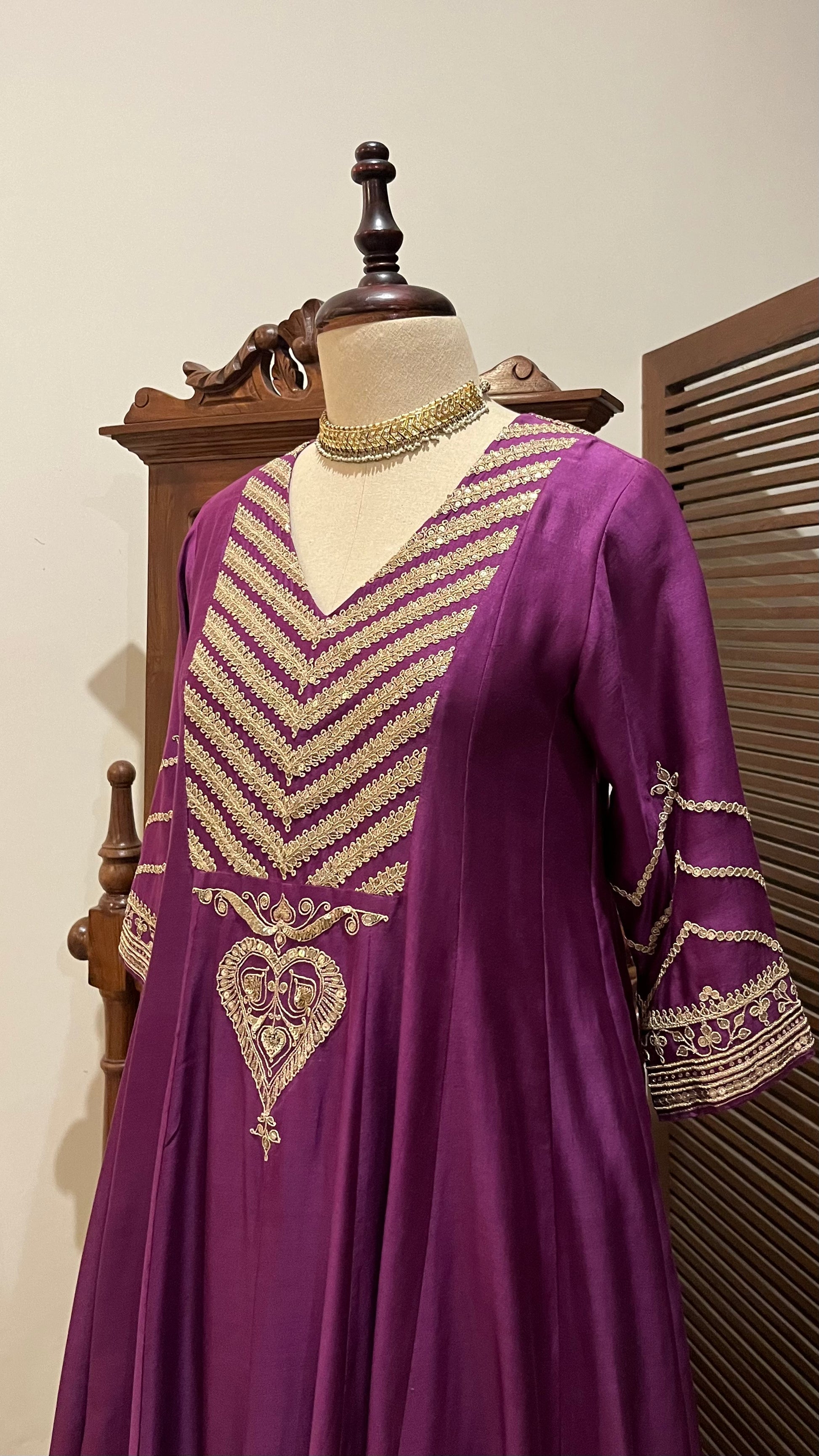 Purple Chanderi Kalidaar kurta, relaxed pants and organza dupatta with hand dori and sequins embroidery