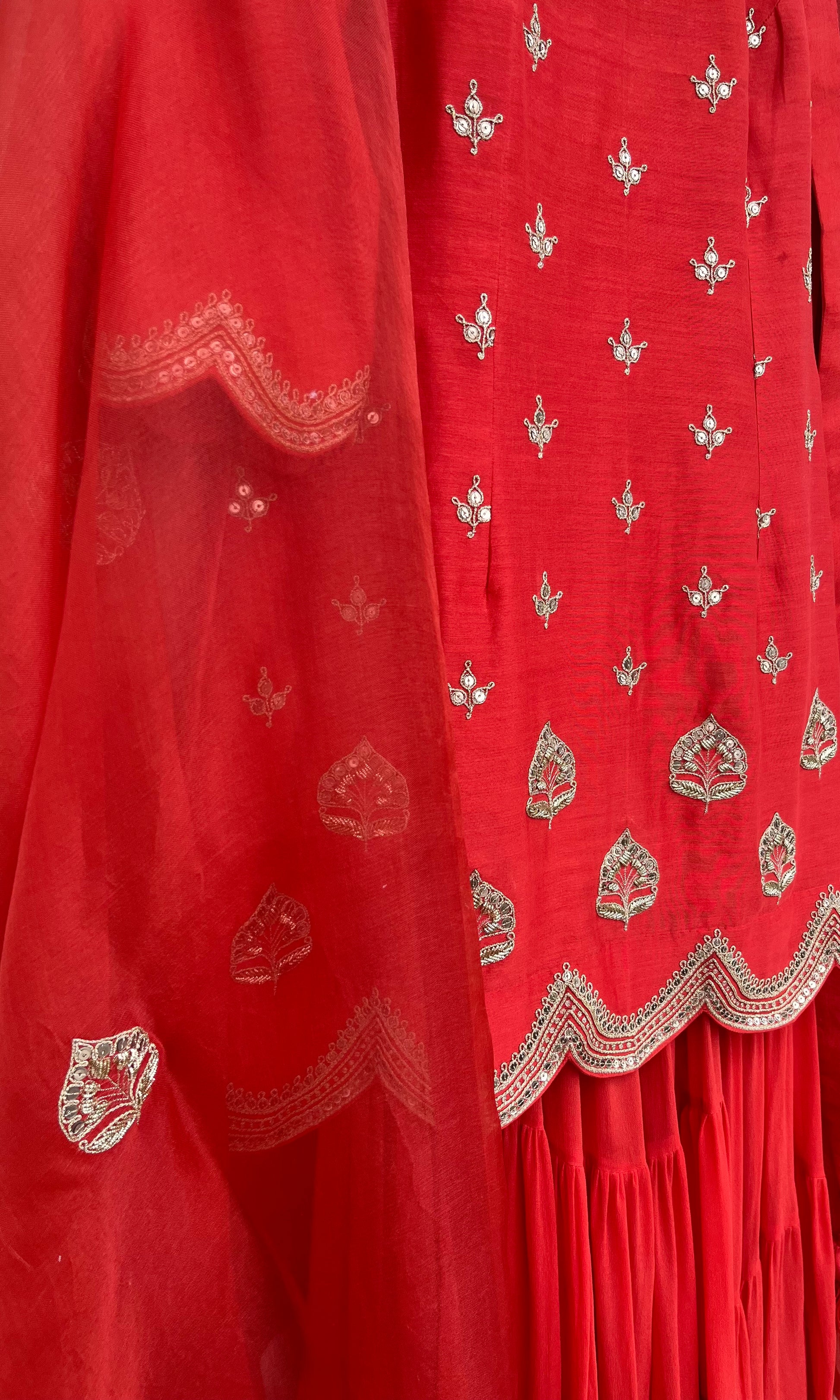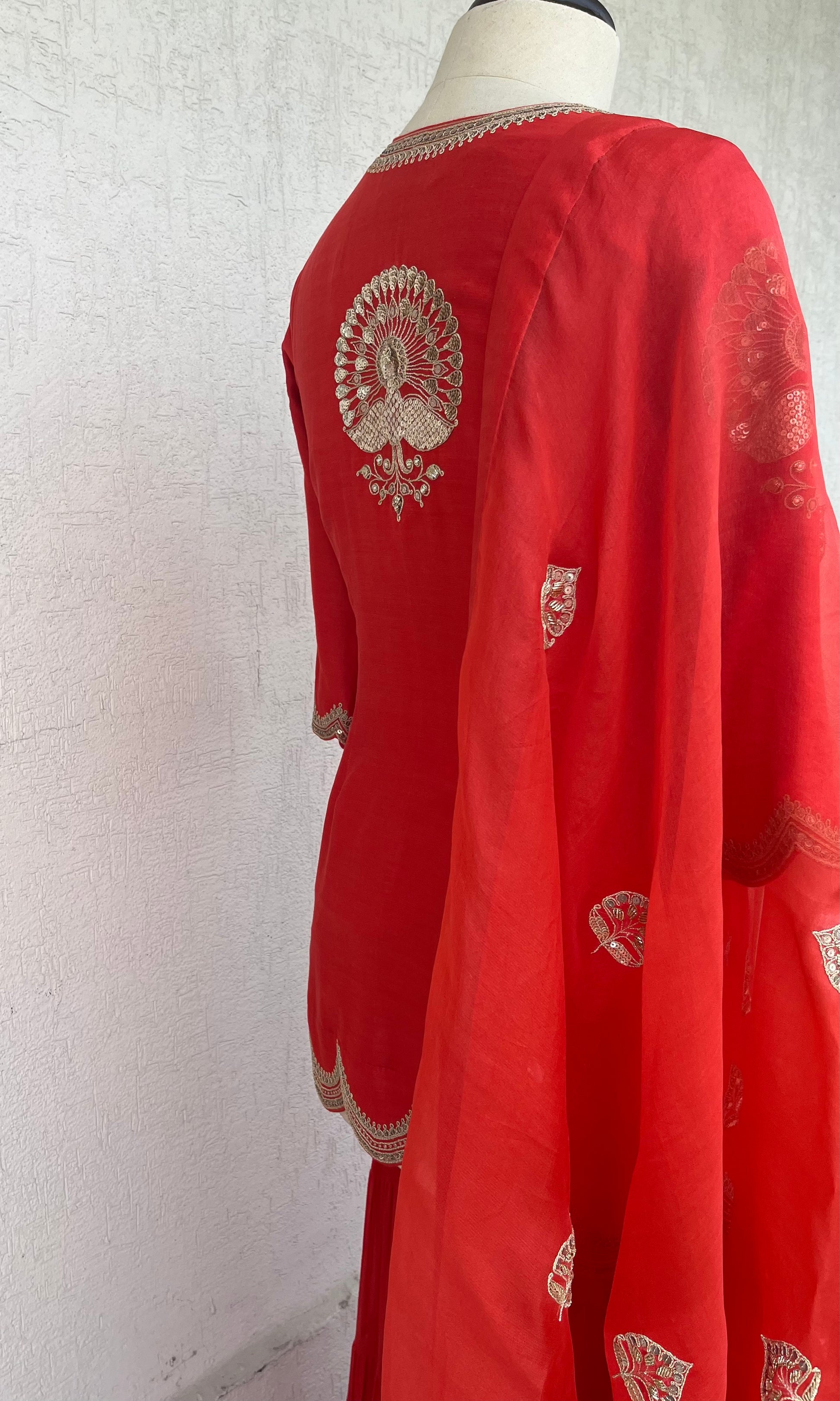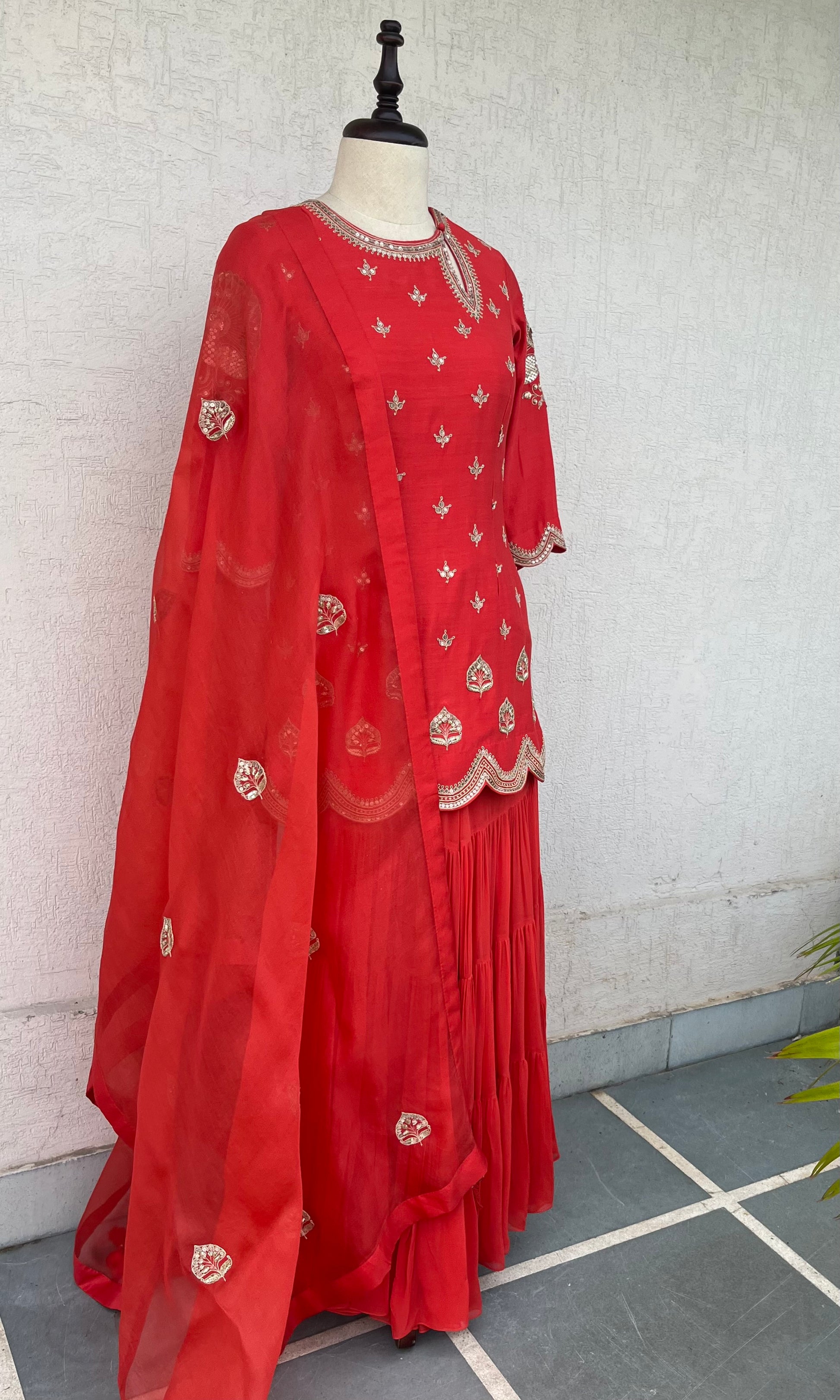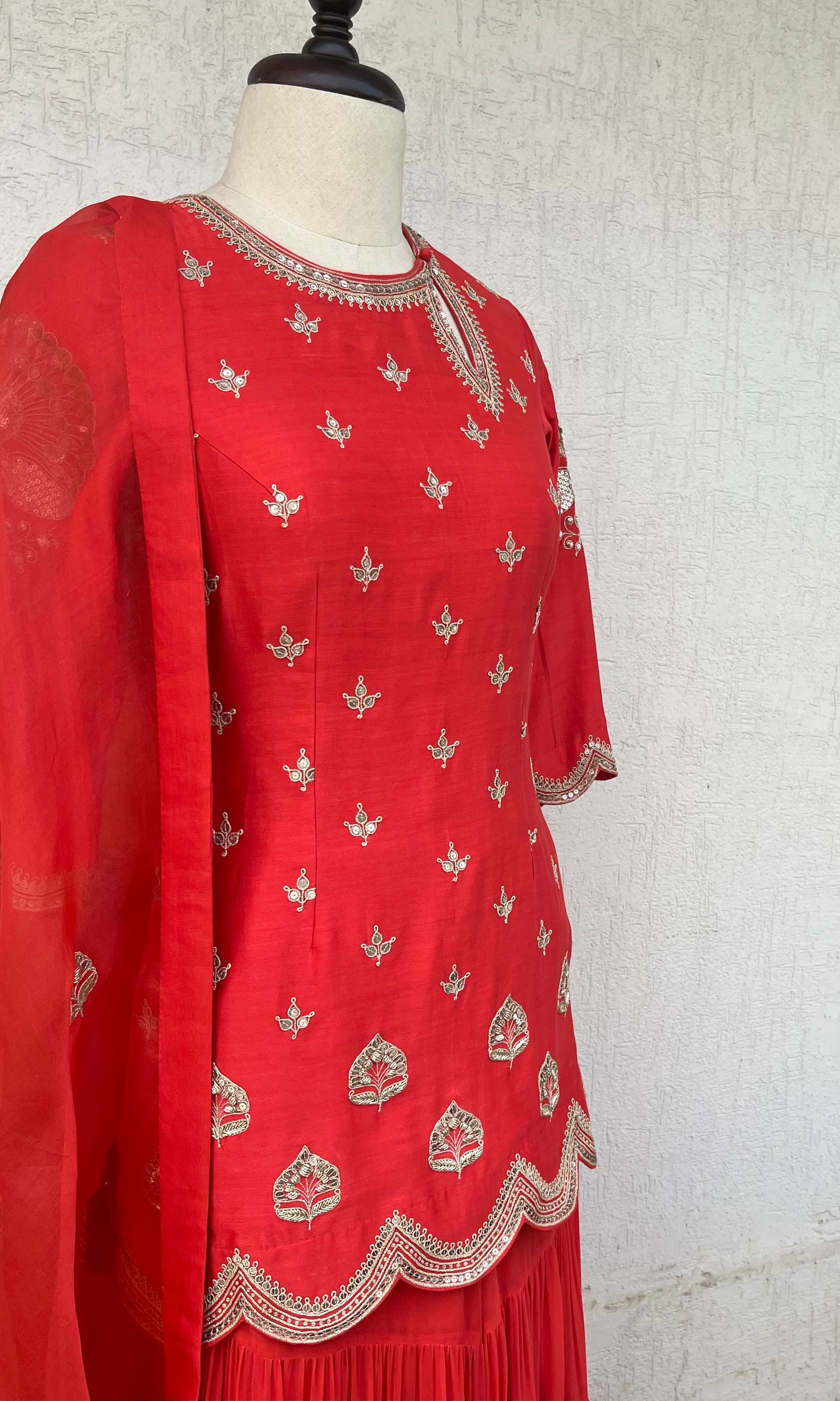 Silk Chanderi short Kurta with side key hole neckline. Comes along with Georgette layered Gharara and Organza Dupatta. Kurta and Dupatta have Hand Dori, sequins and Naqshi embroidery