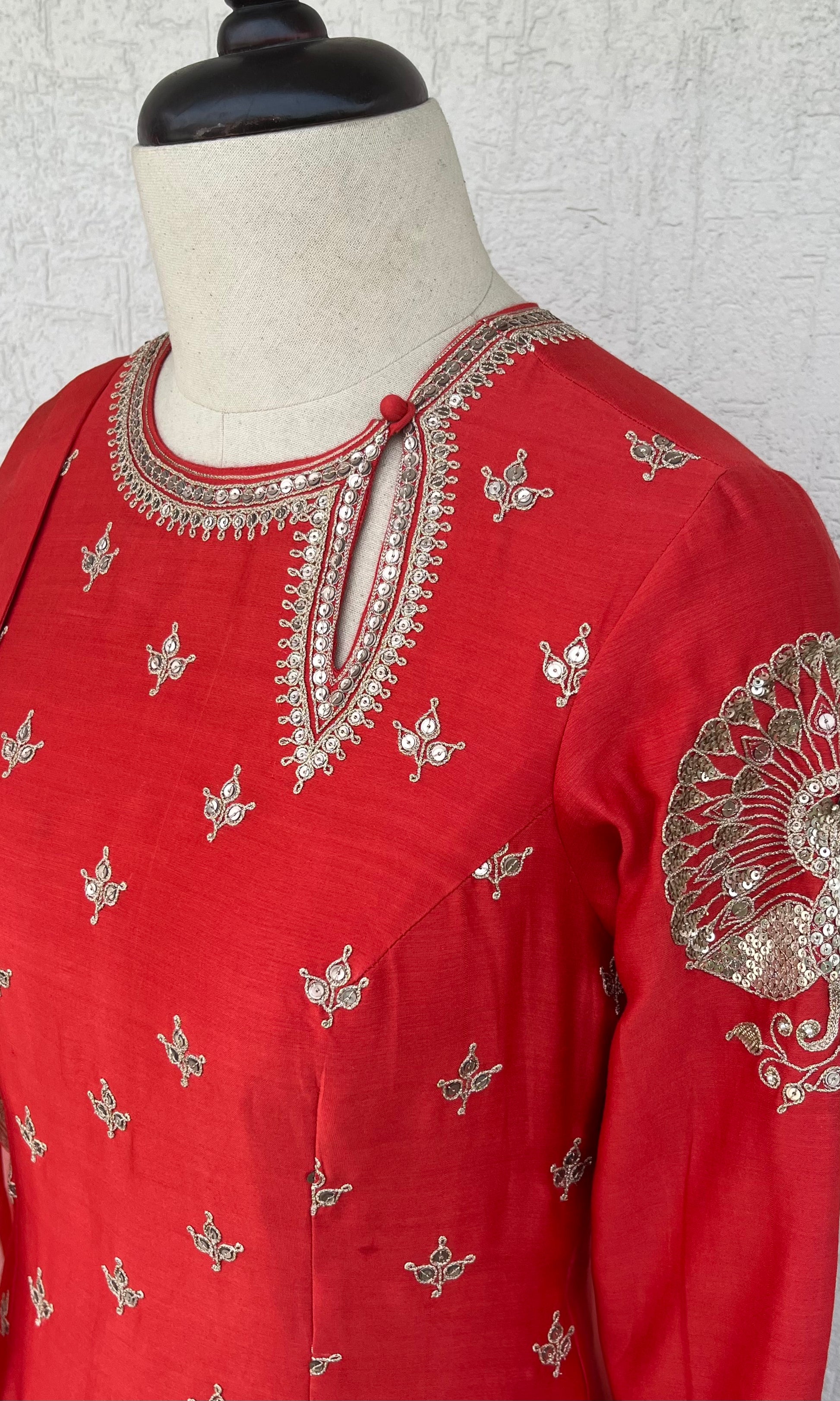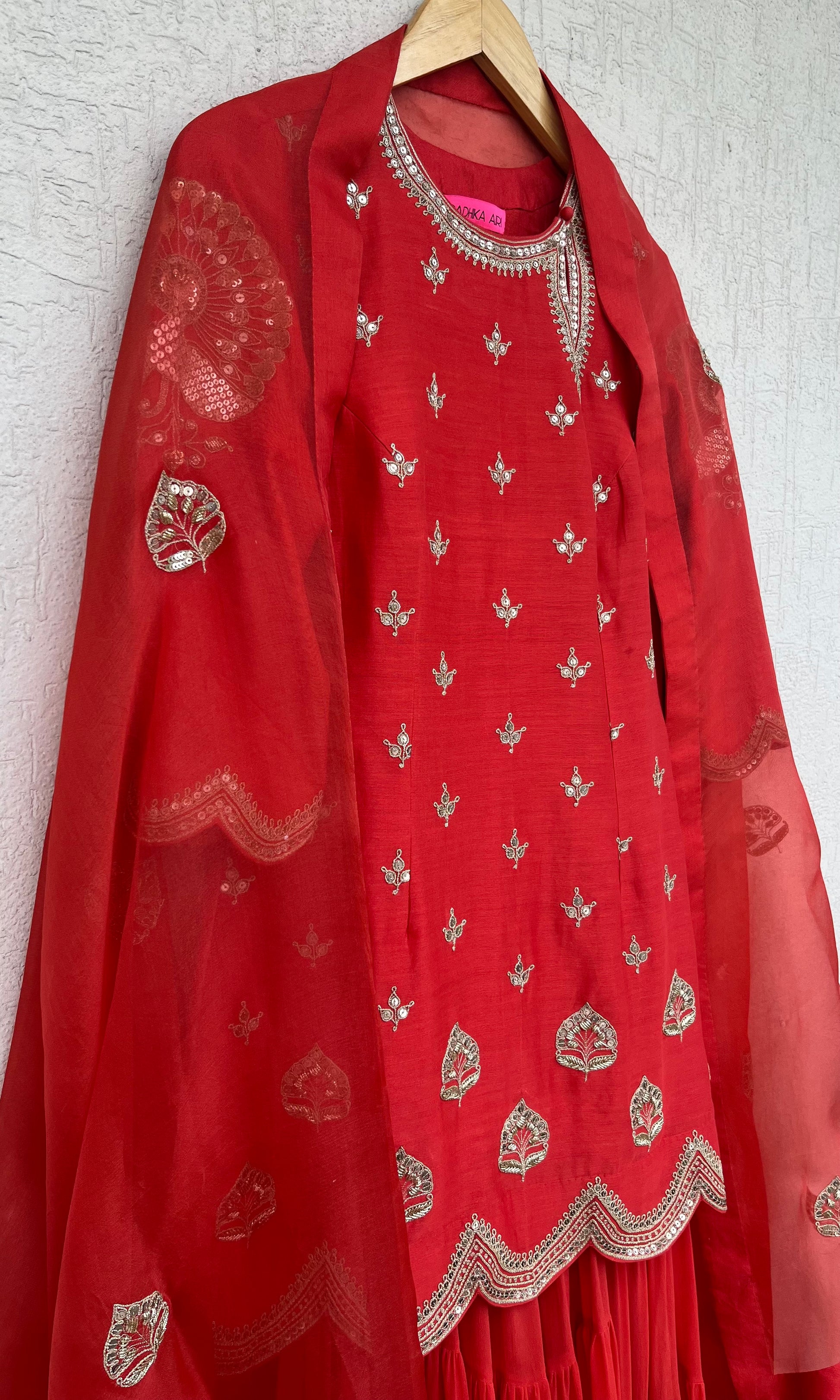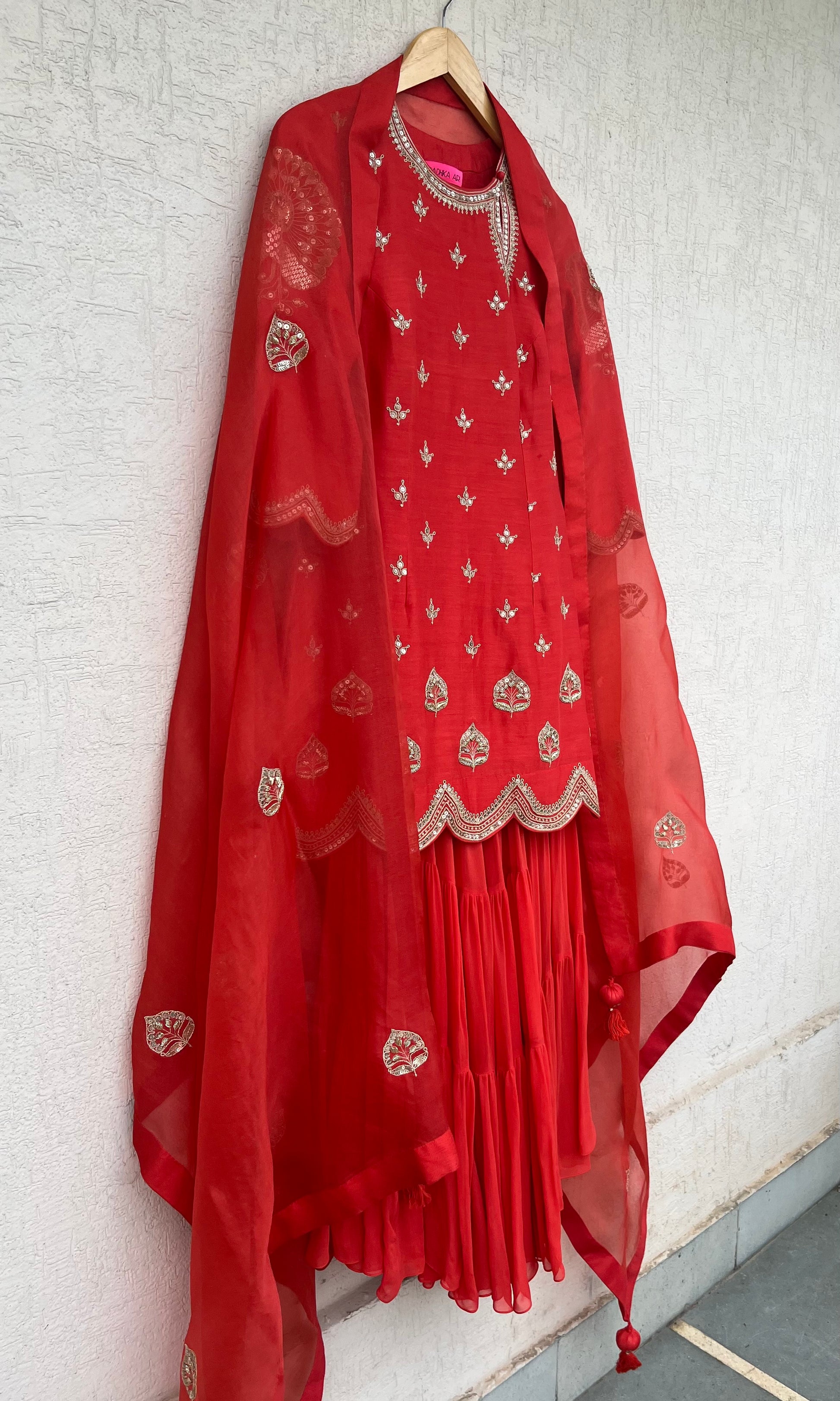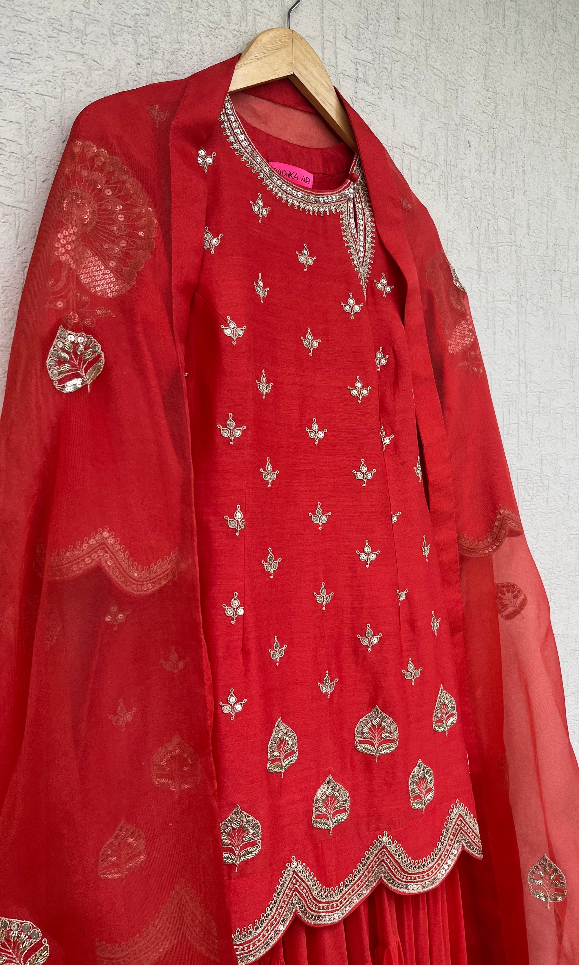 Silk Chanderi short Kurta with side key hole neckline. Comes along with Georgette layered Gharara and Organza Dupatta. Kurta and Dupatta have Hand Dori, sequins and Naqshi embroidery