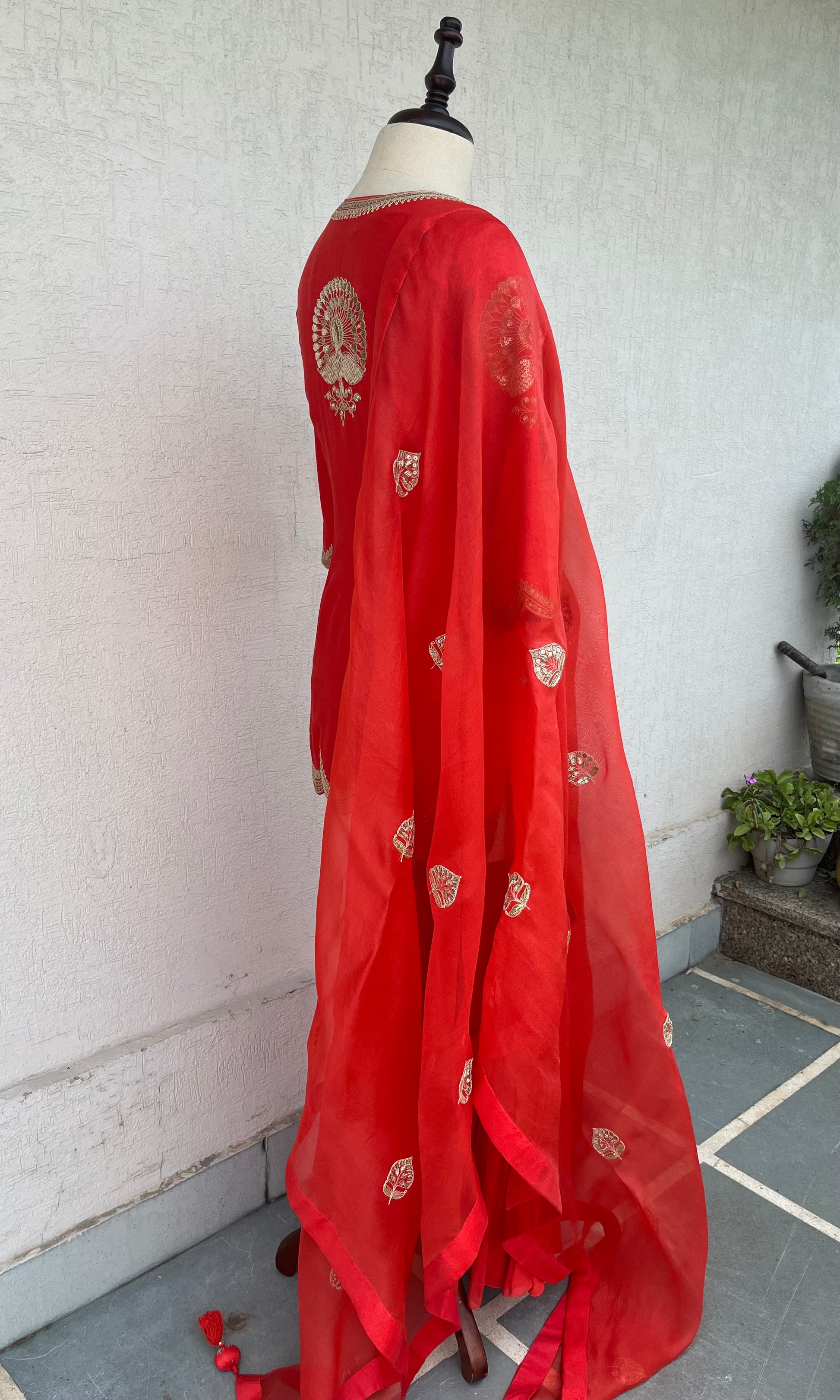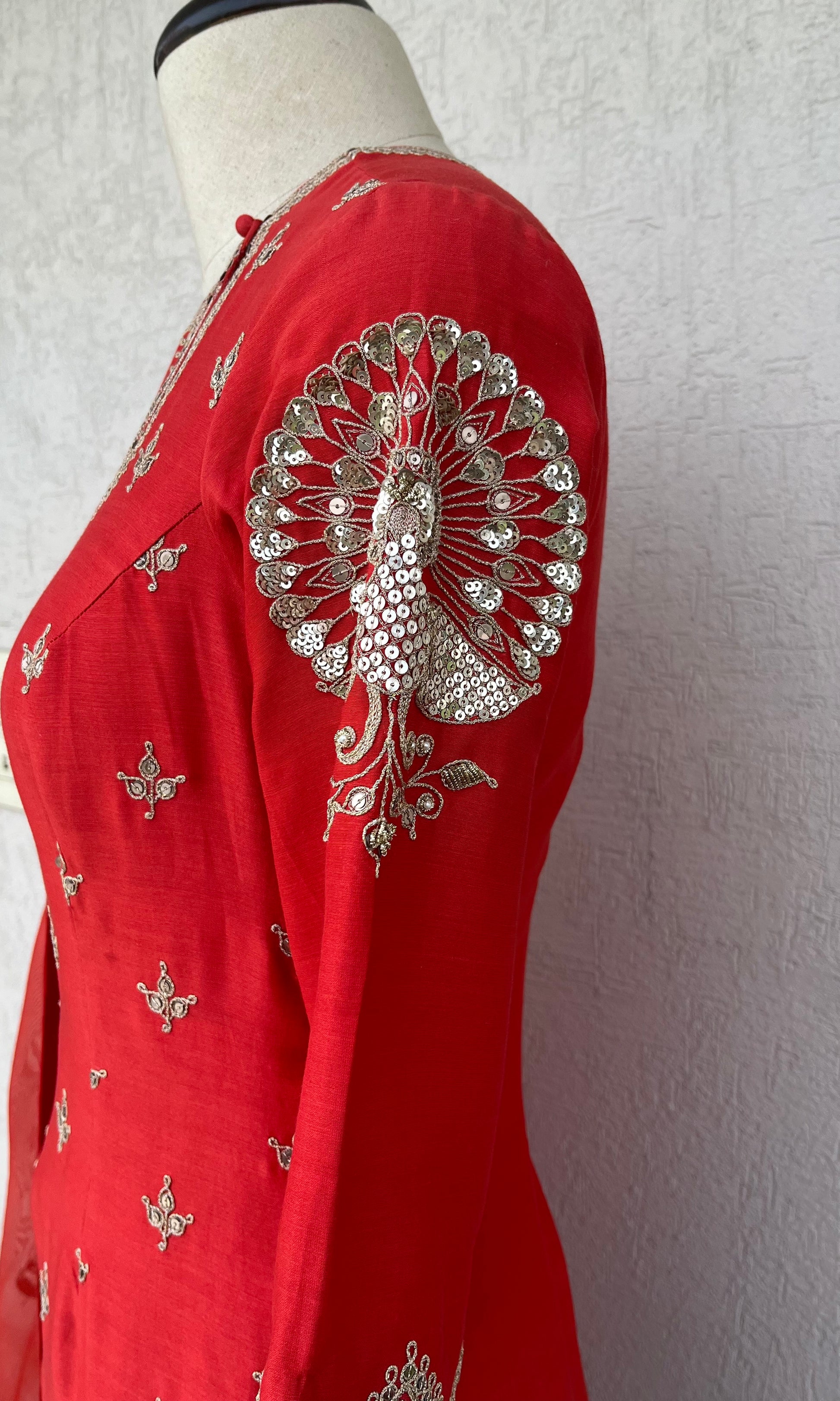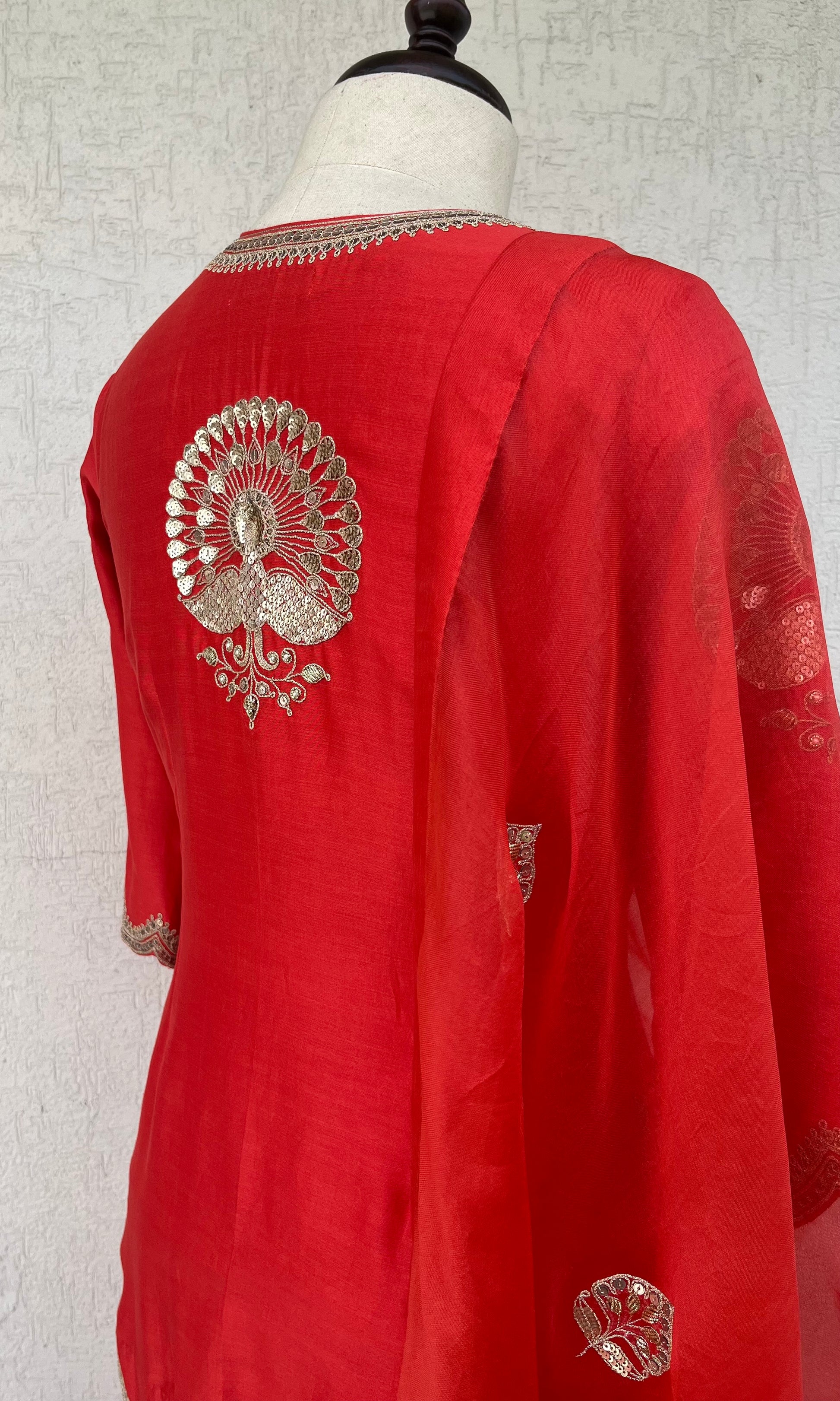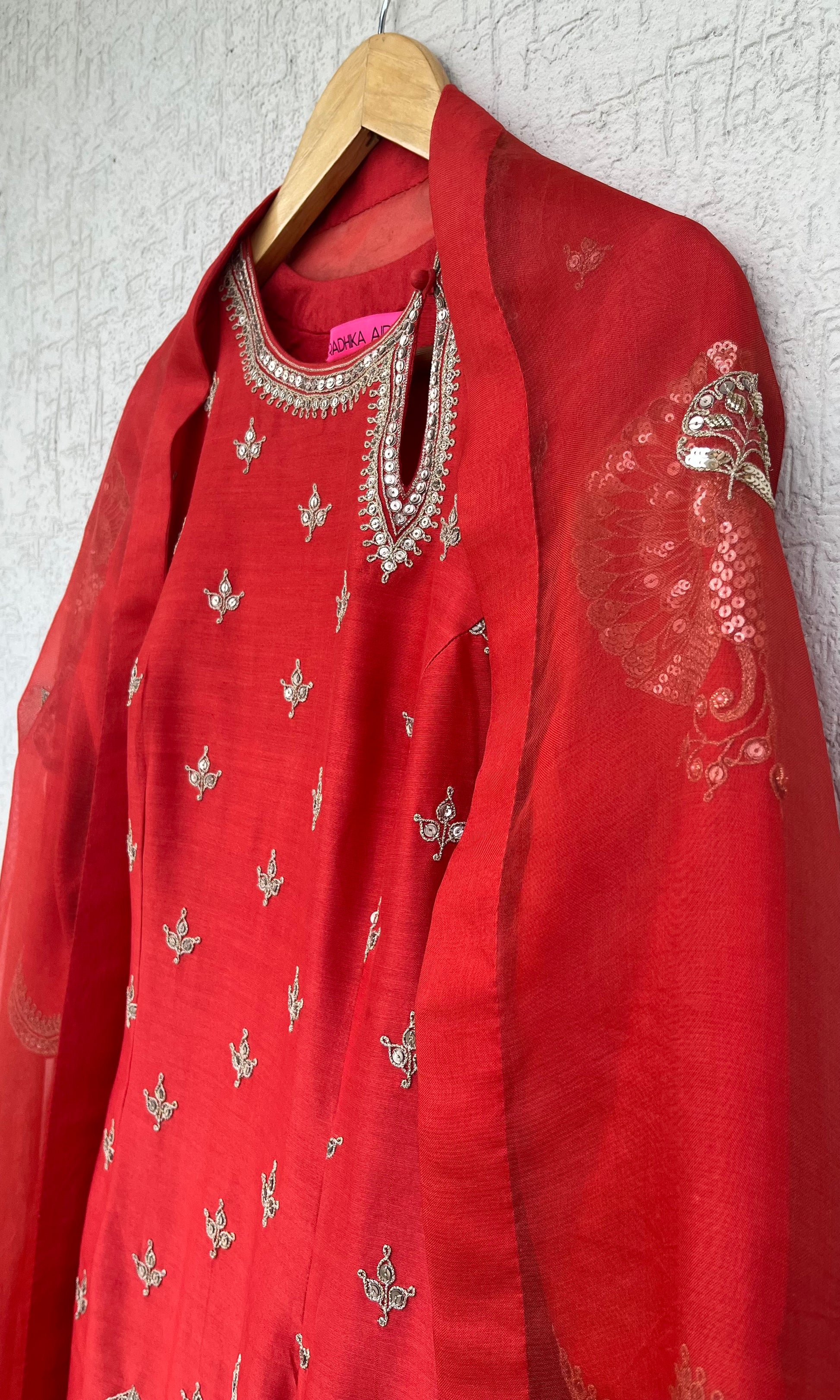 Silk Chanderi short Kurta with side key hole neckline. Comes along with Georgette layered Gharara and Organza Dupatta. Kurta and Dupatta have Hand Dori, sequins and Naqshi embroidery