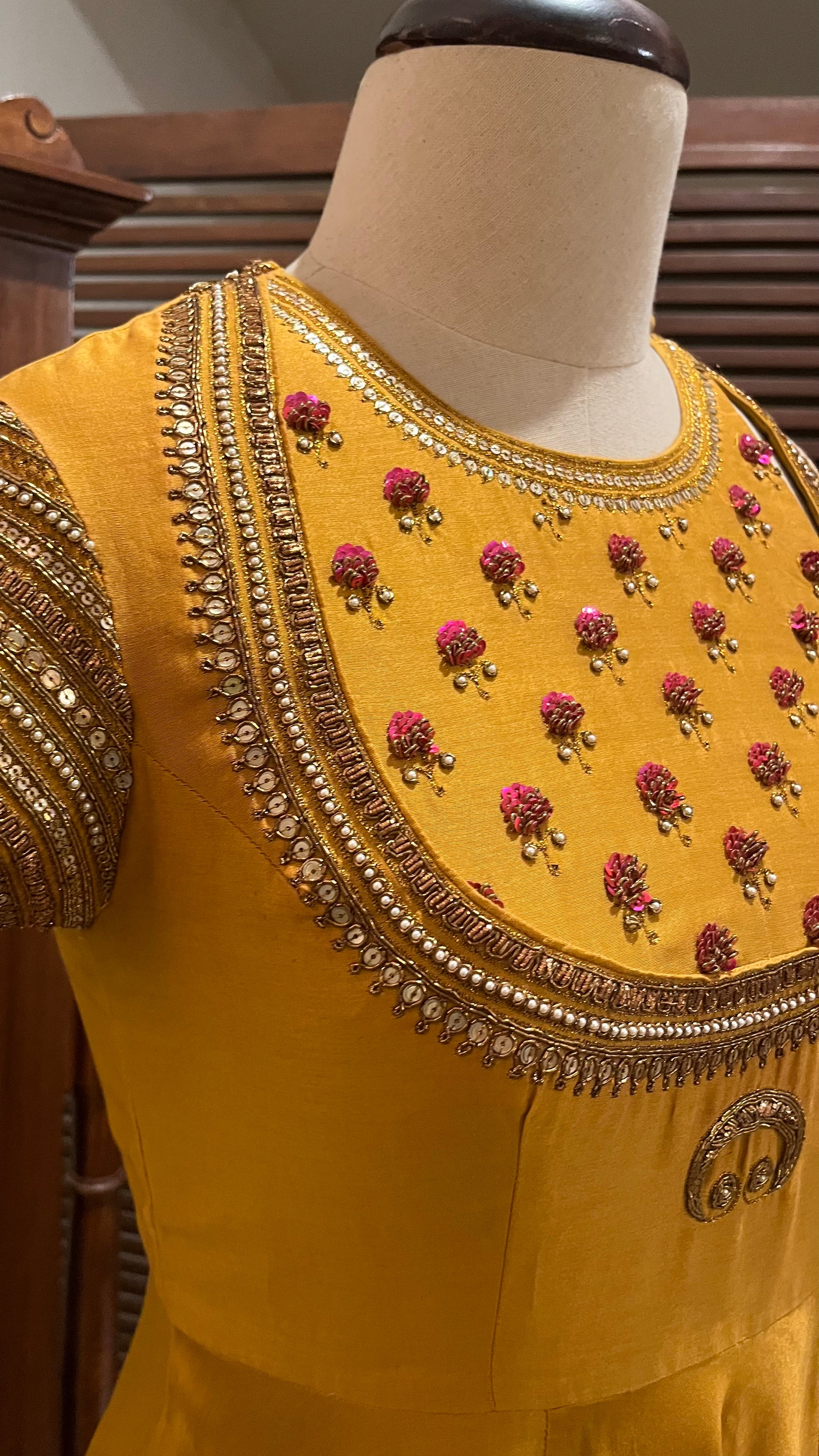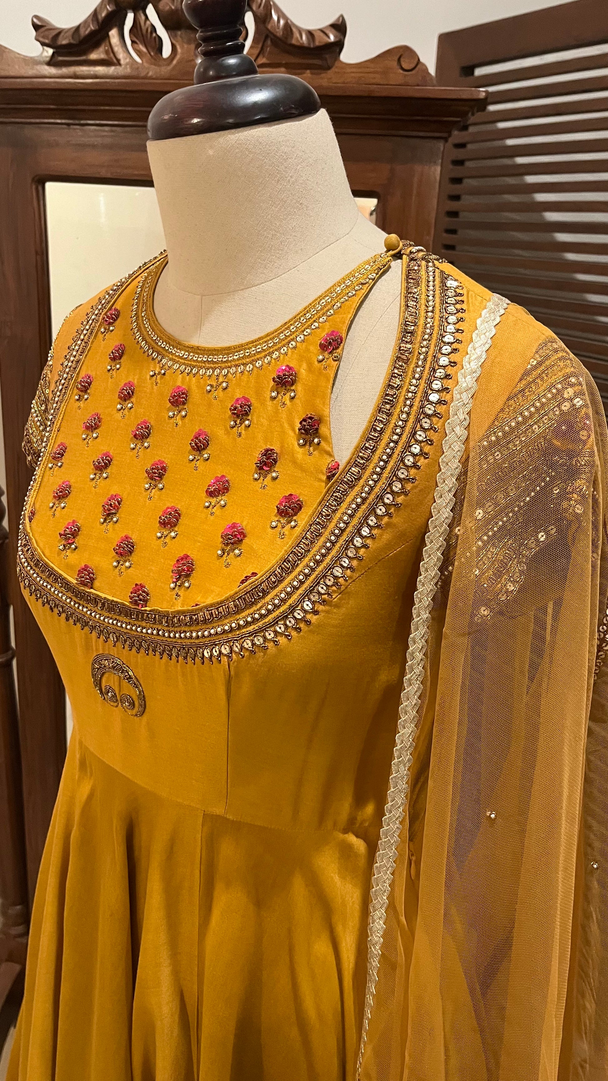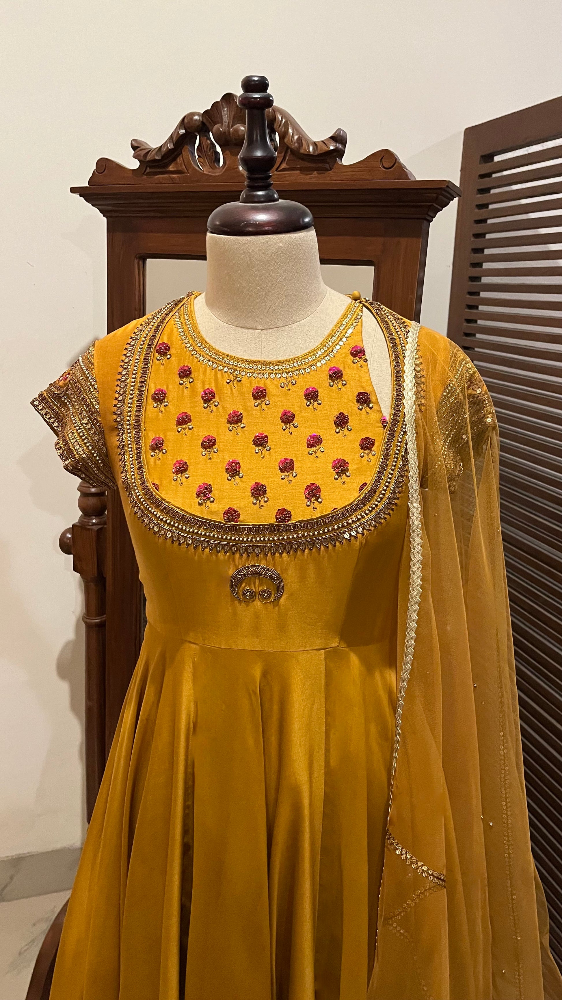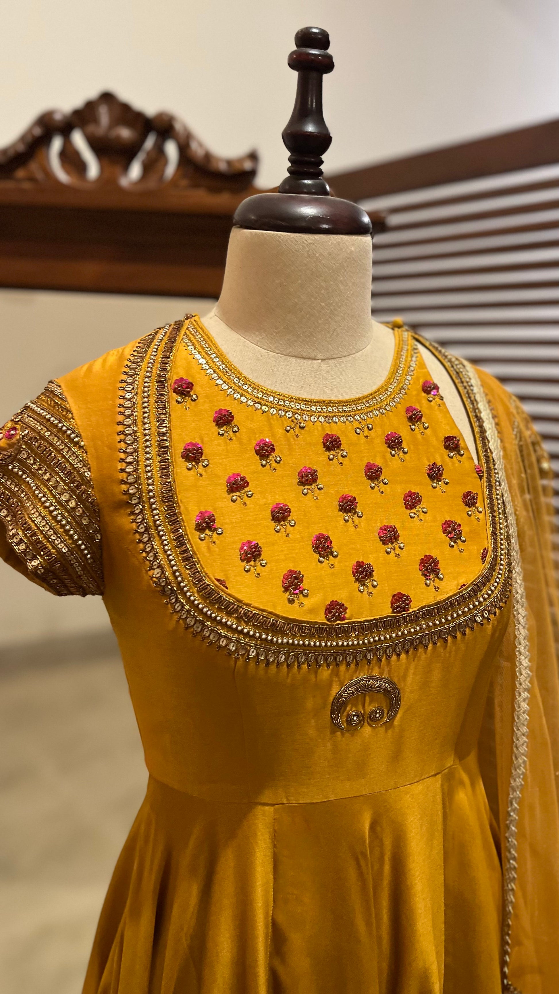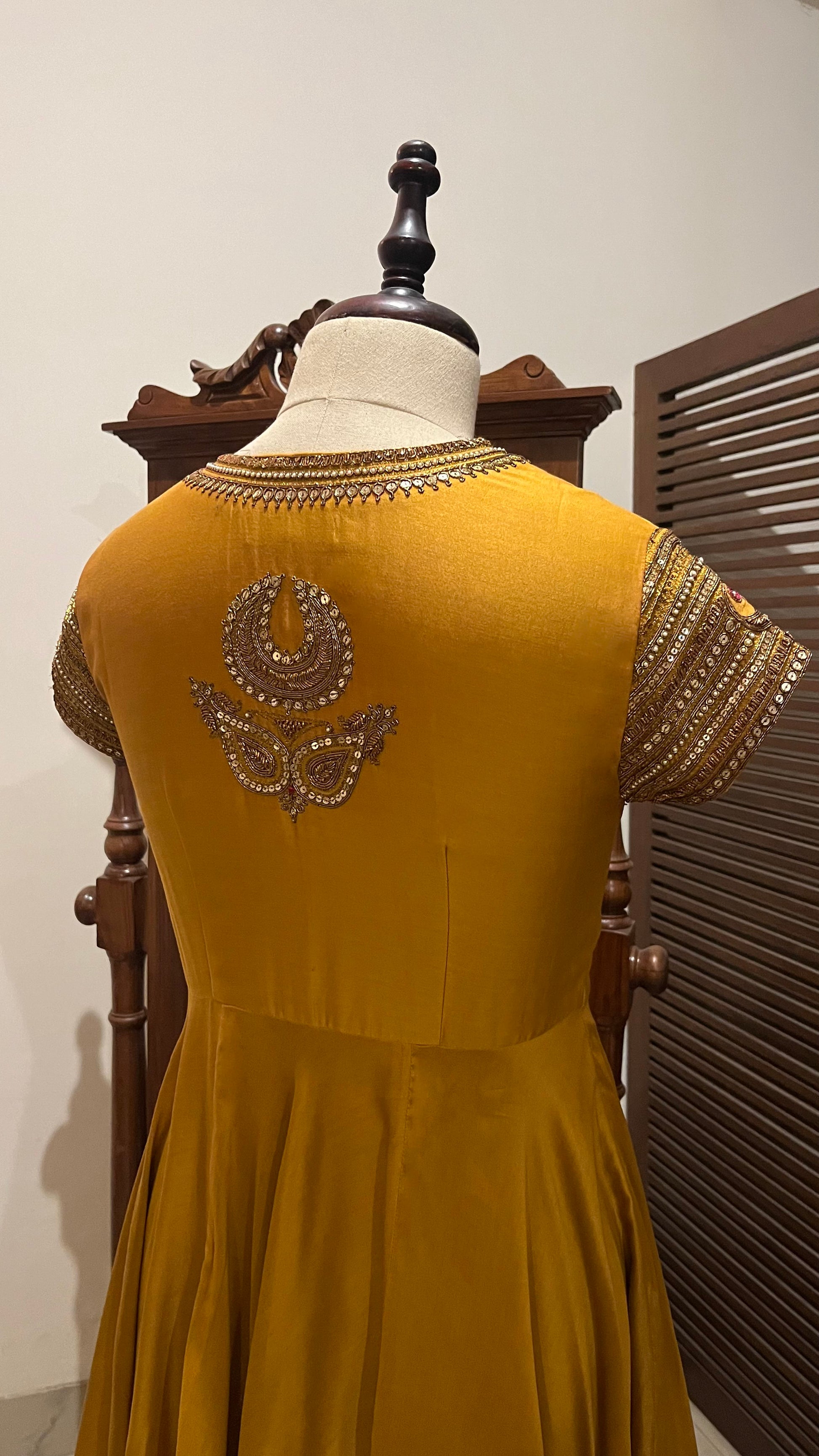 Mustard Chanderi Anarkali with hand dabka, Naqshi and sequins embroidery.