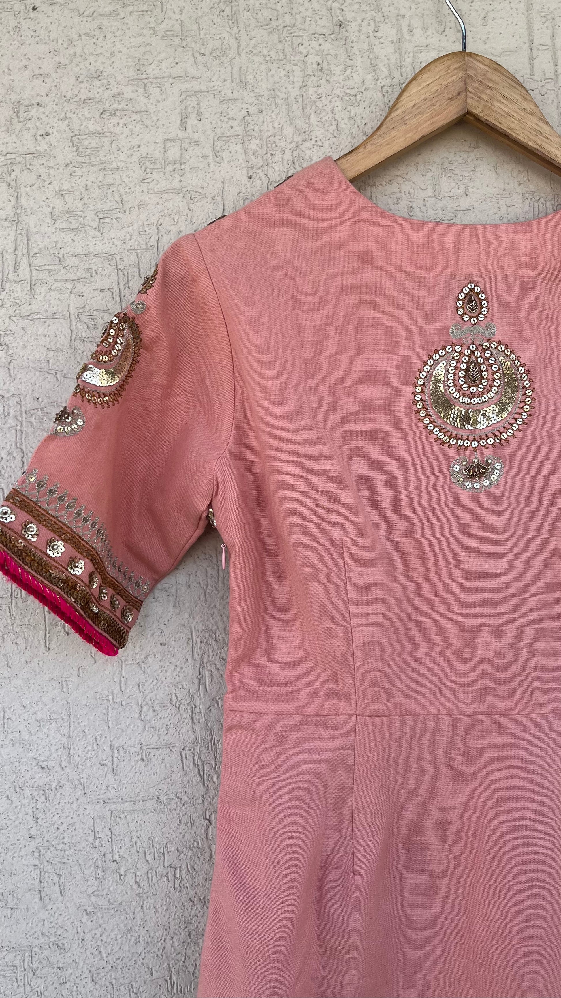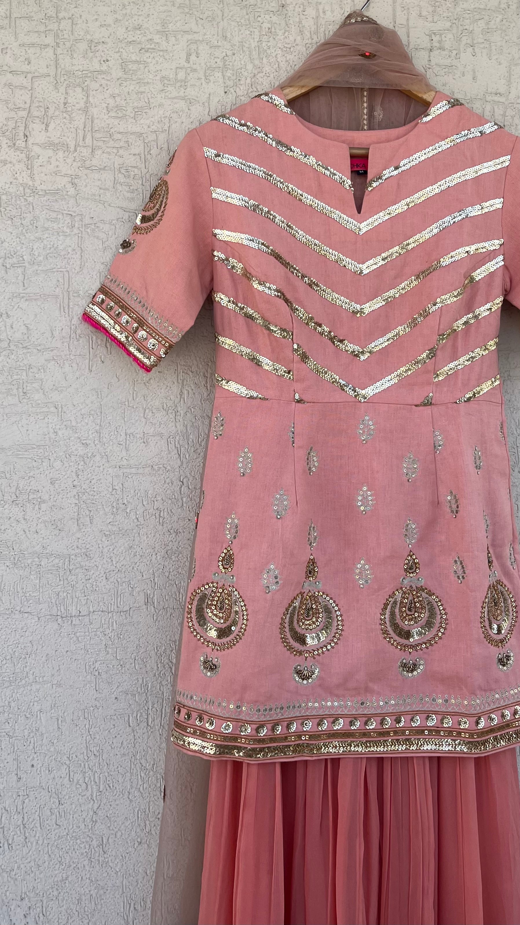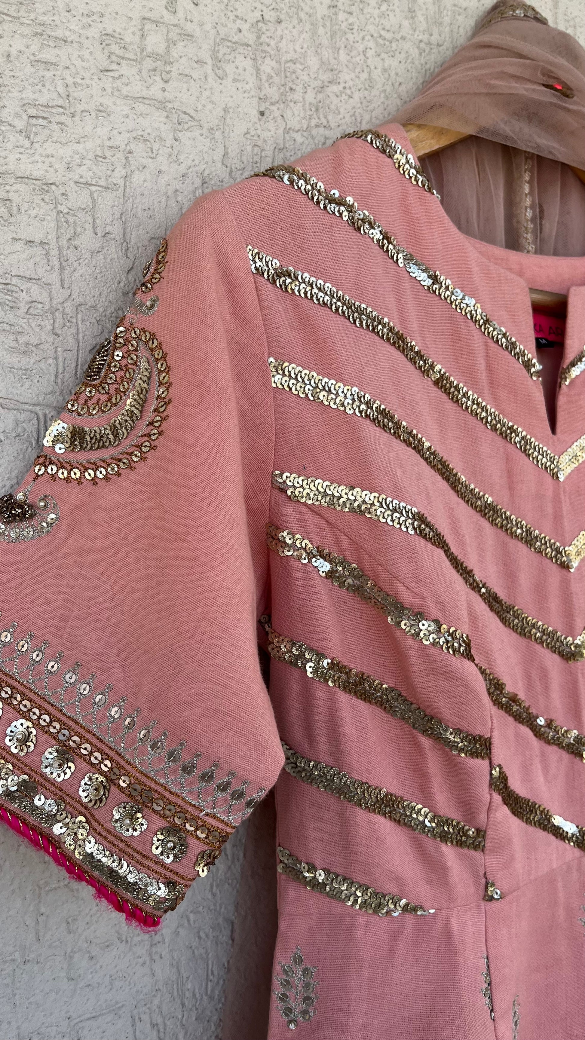 Peach Linen short kurta, Georgette Gharara and net dupatta set with hand aari and sequins embroidery