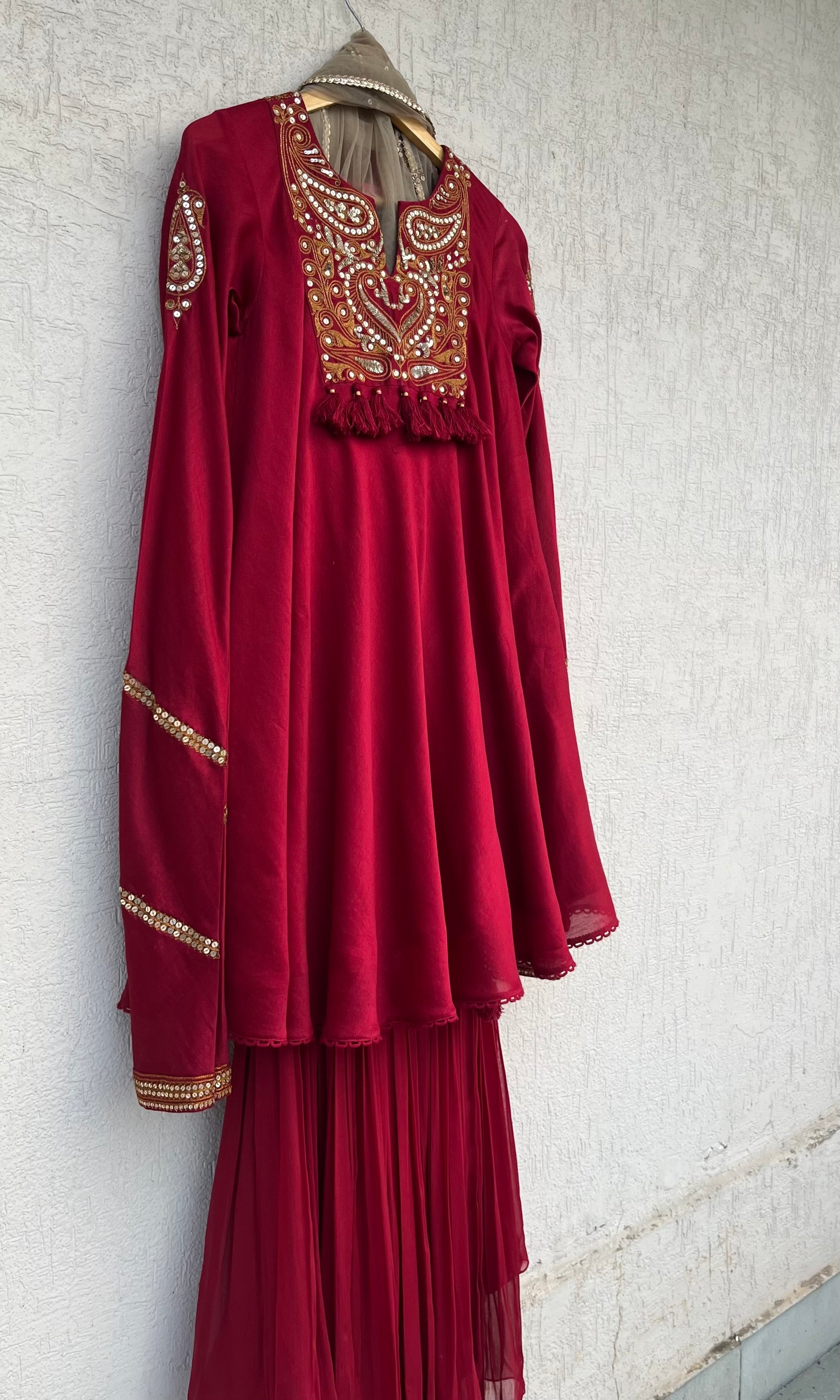 Ruby Red Silk Chanderi Kurta, Georgette Gharara and net dupatta set with bronze hand aari and sequins embroidery