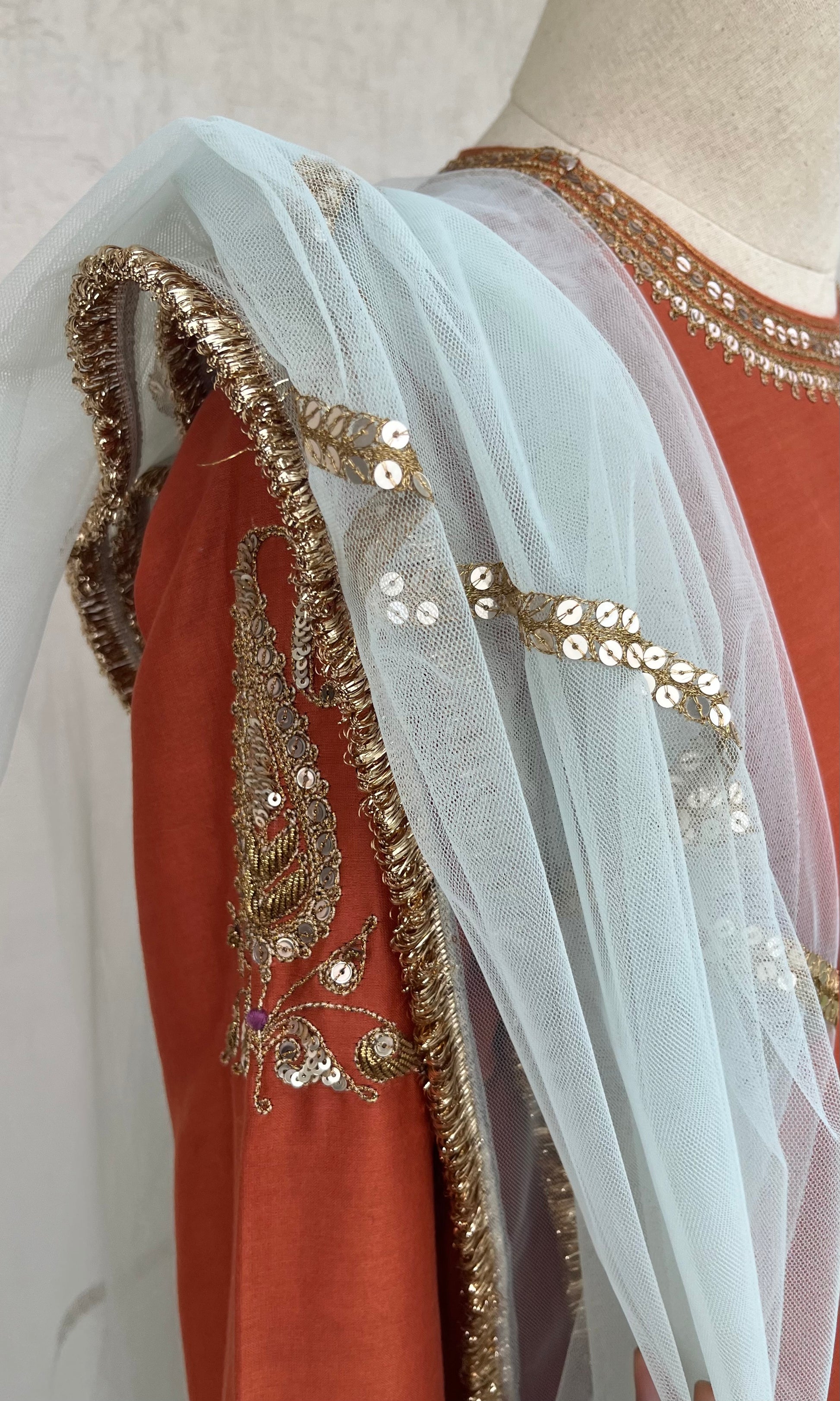 Silk Chanderi Kurta and relaxed pants set with Hand Dori and sequins embroidery. Comes with a chalk blue embroidered net dupatta.