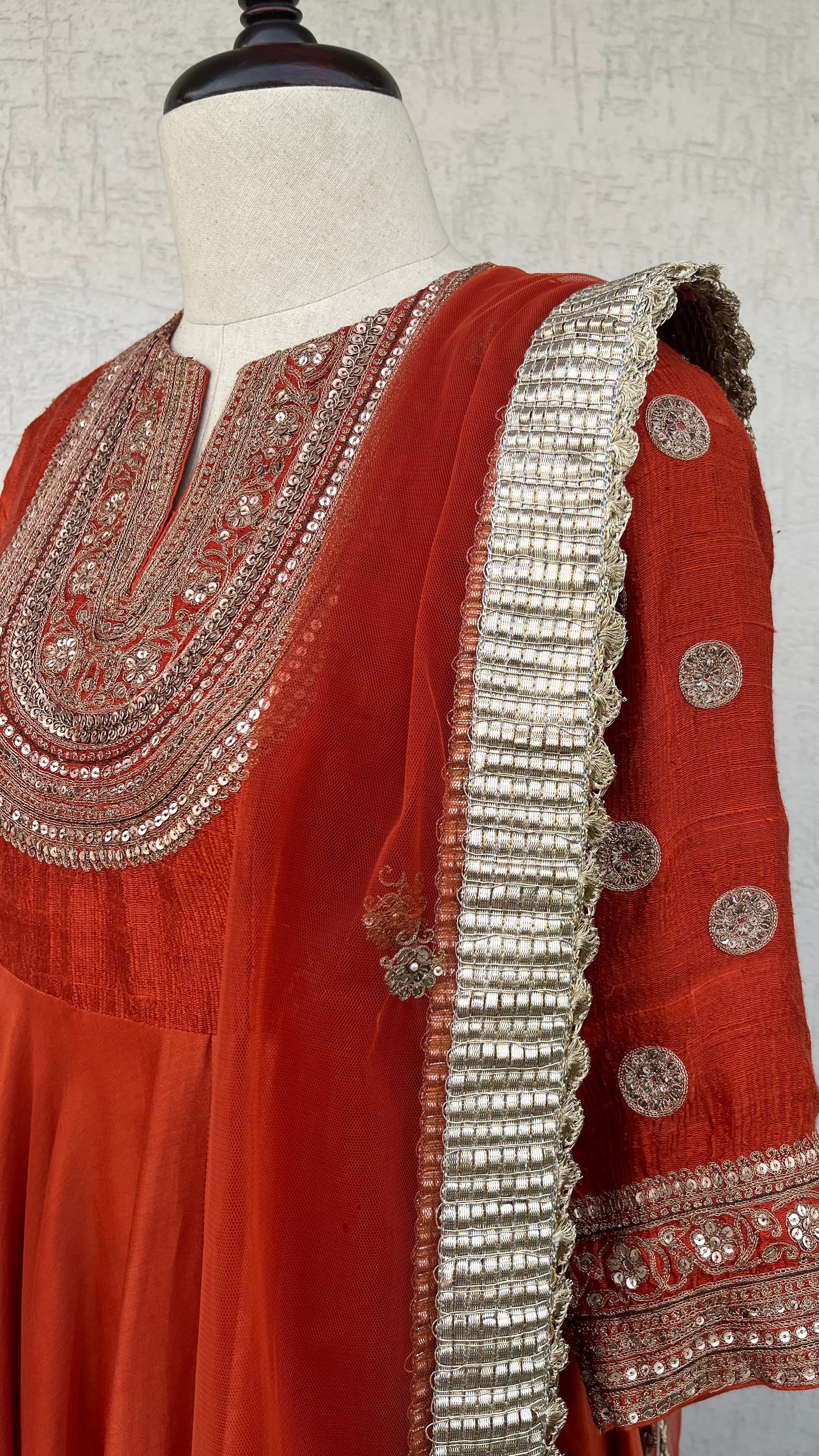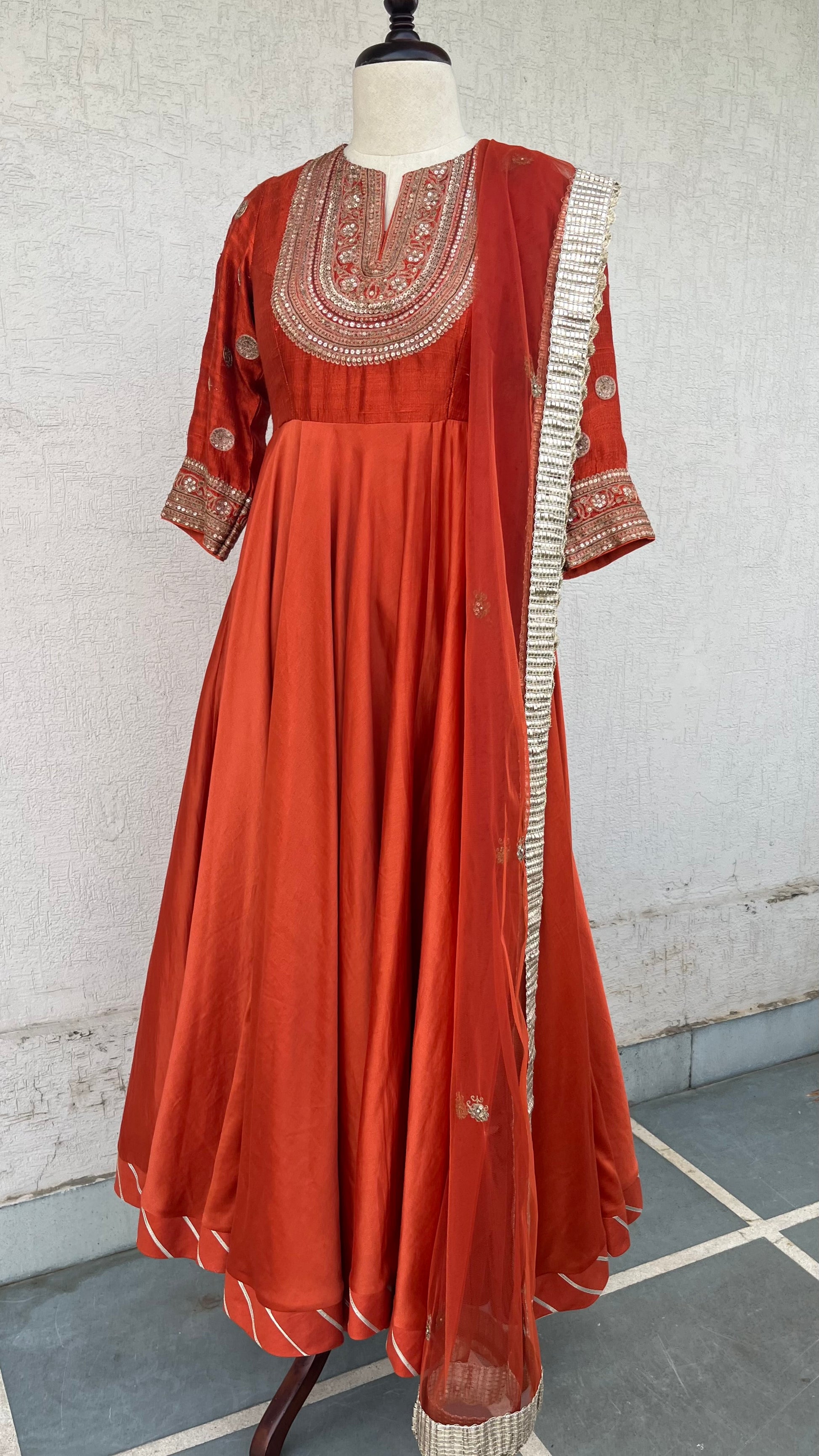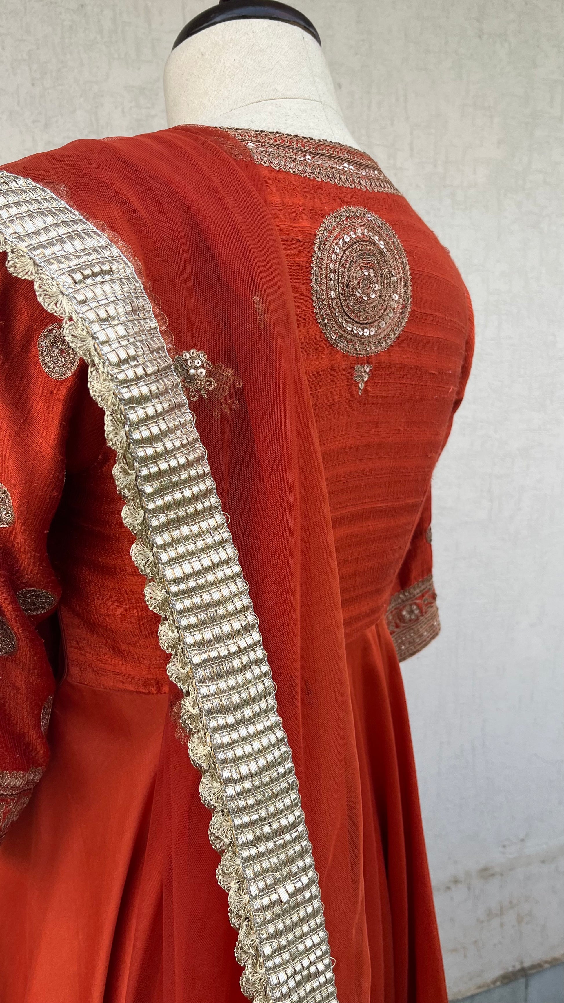 Rust Anarkali with Raw silk yoke and Chanderi Ghera and net dupatta with Hand delicate aari and sequins embroidery.