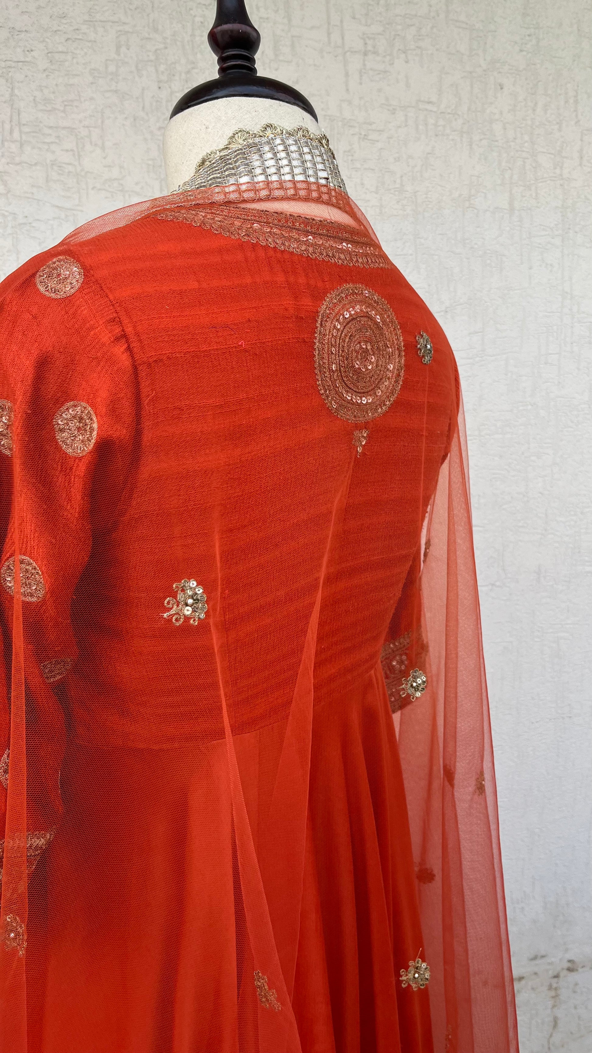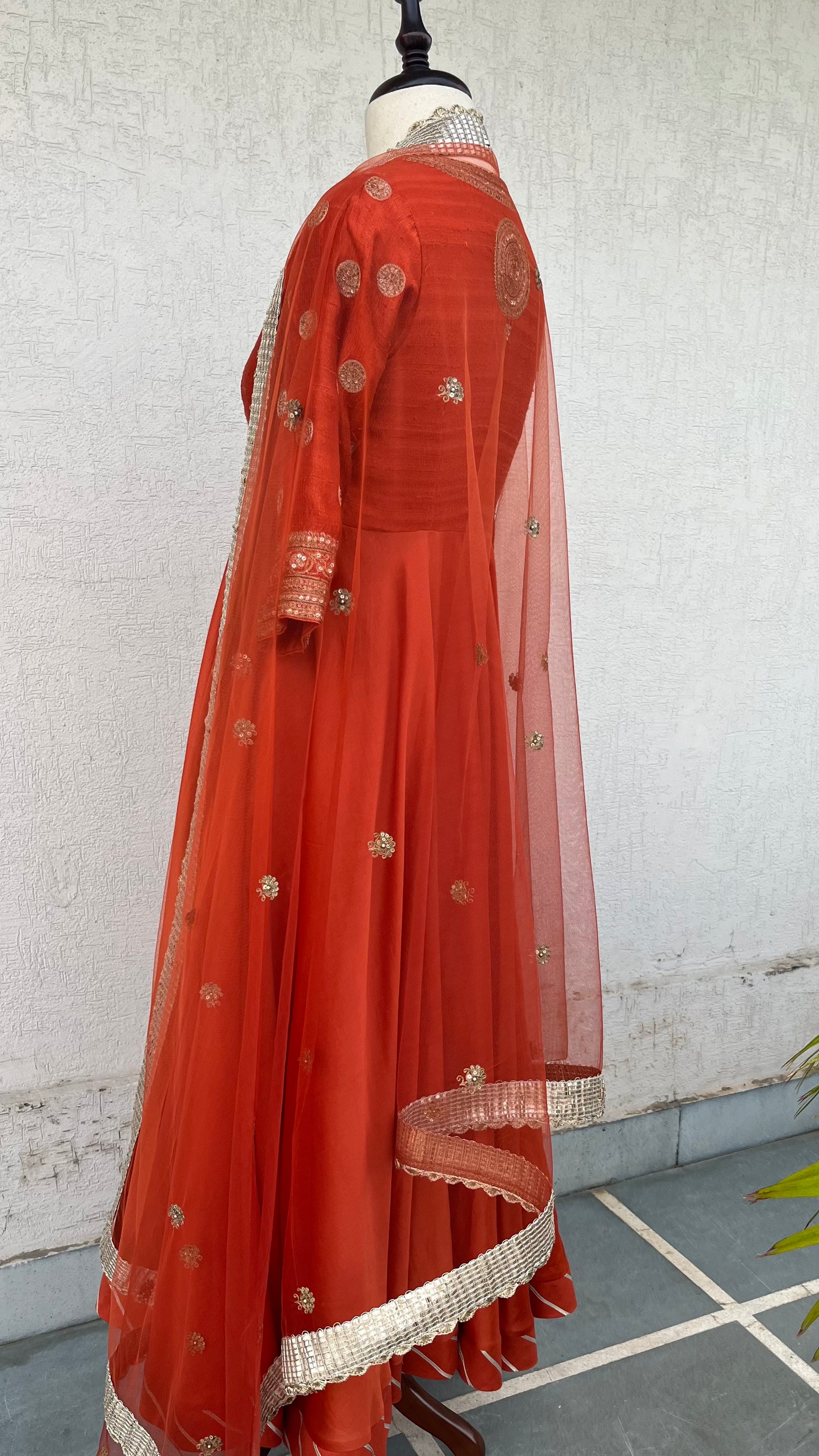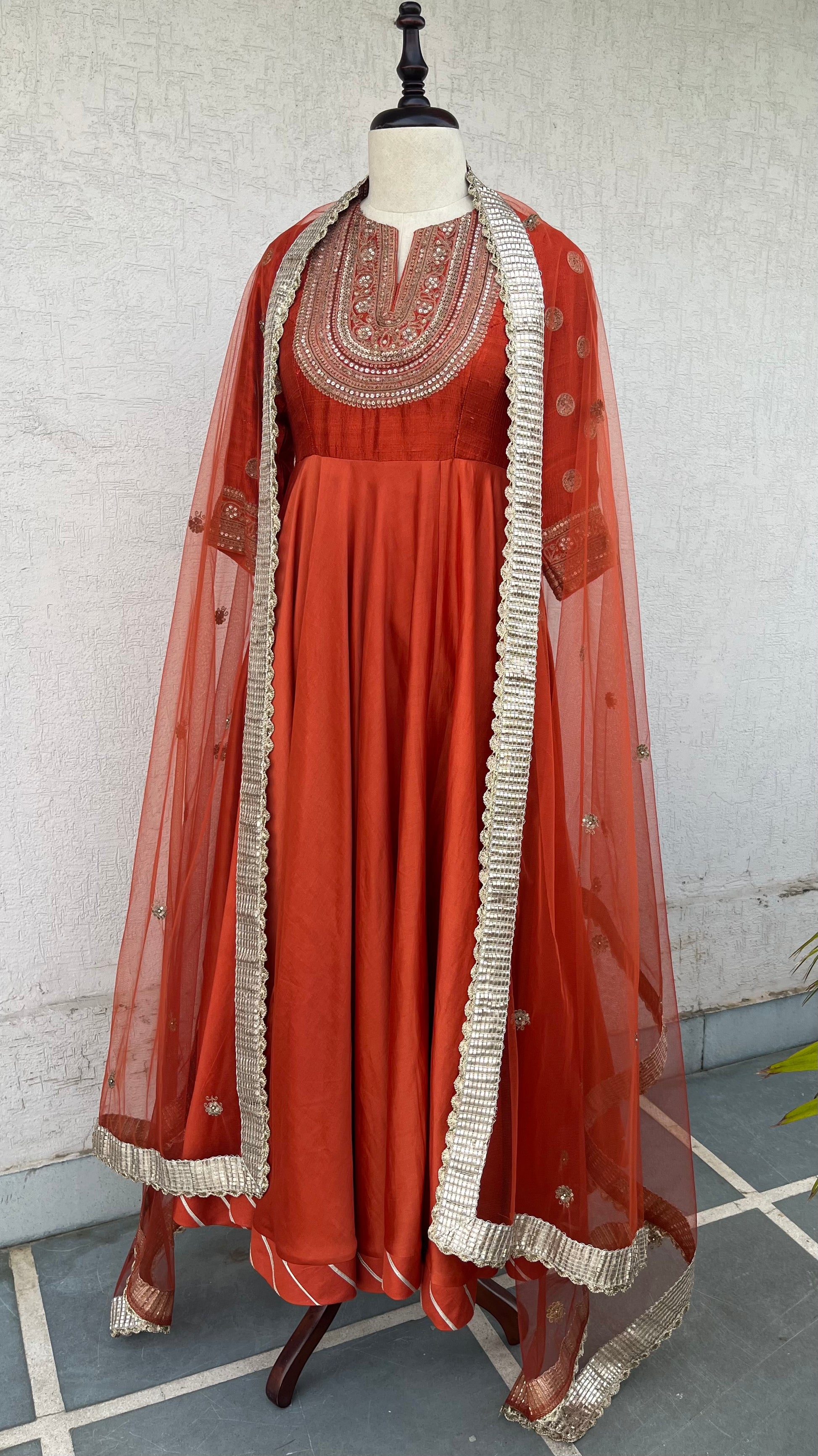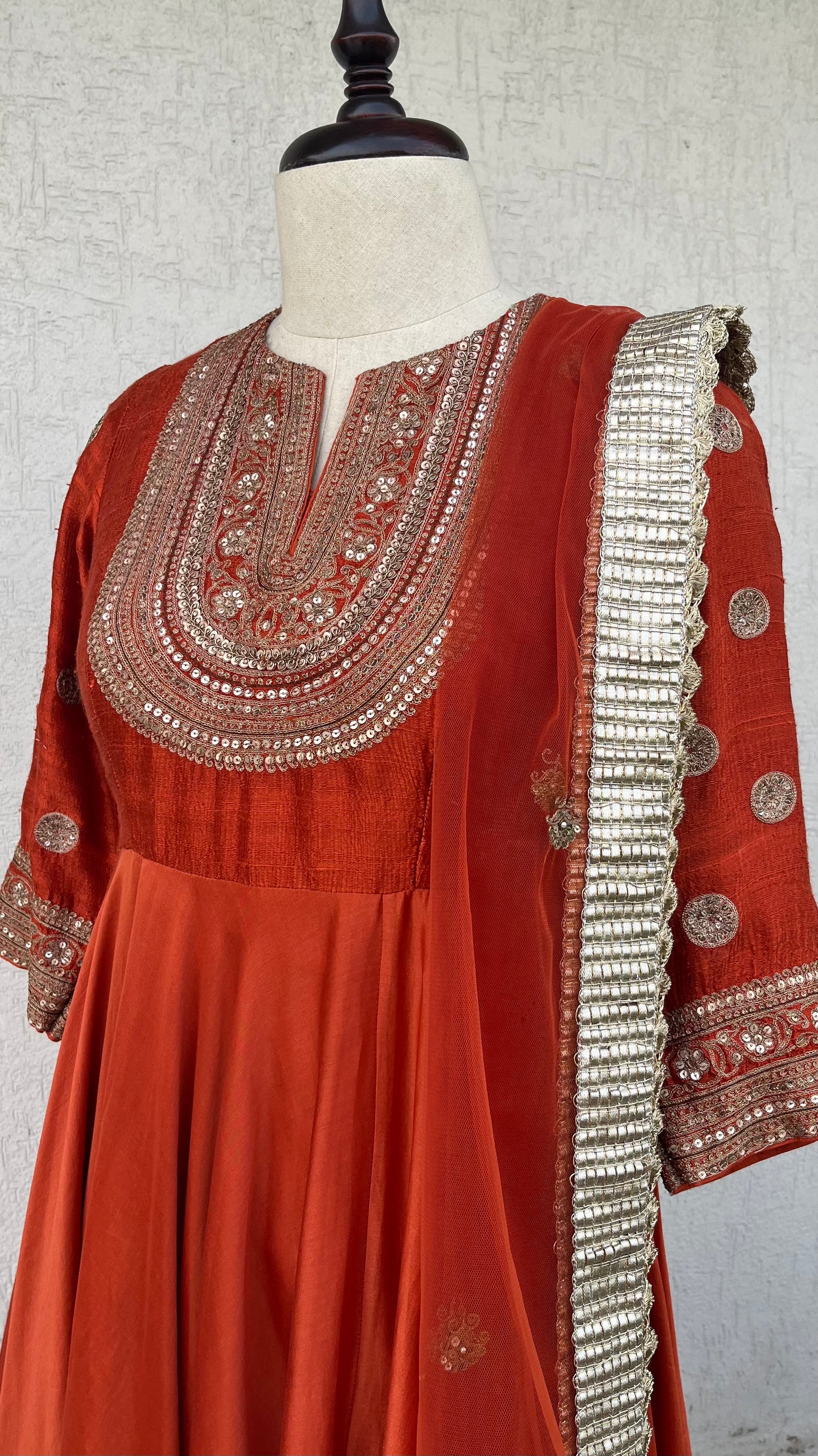 Rust Anarkali with Raw silk yoke and Chanderi Ghera and net dupatta with Hand delicate aari and sequins embroidery.