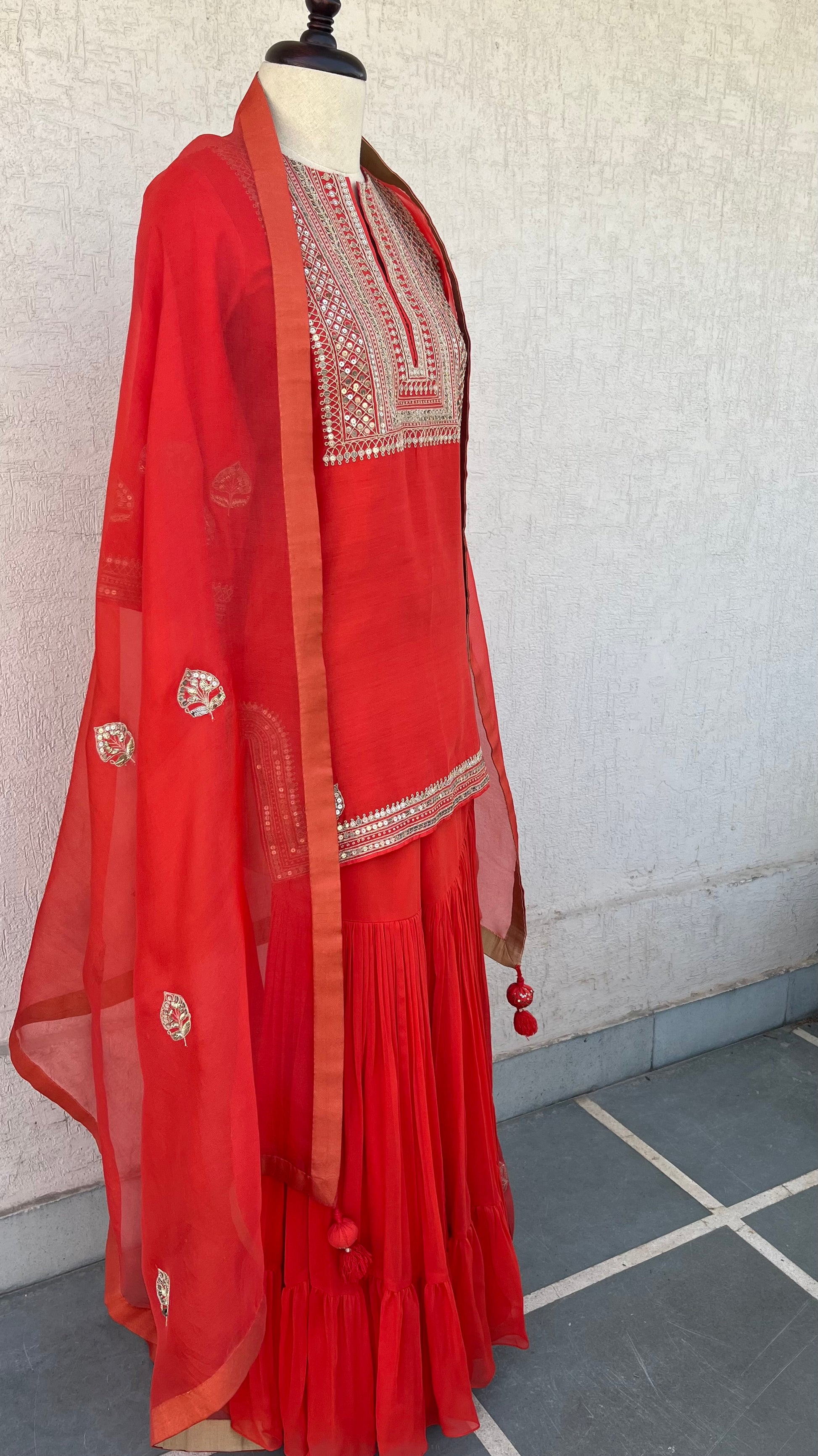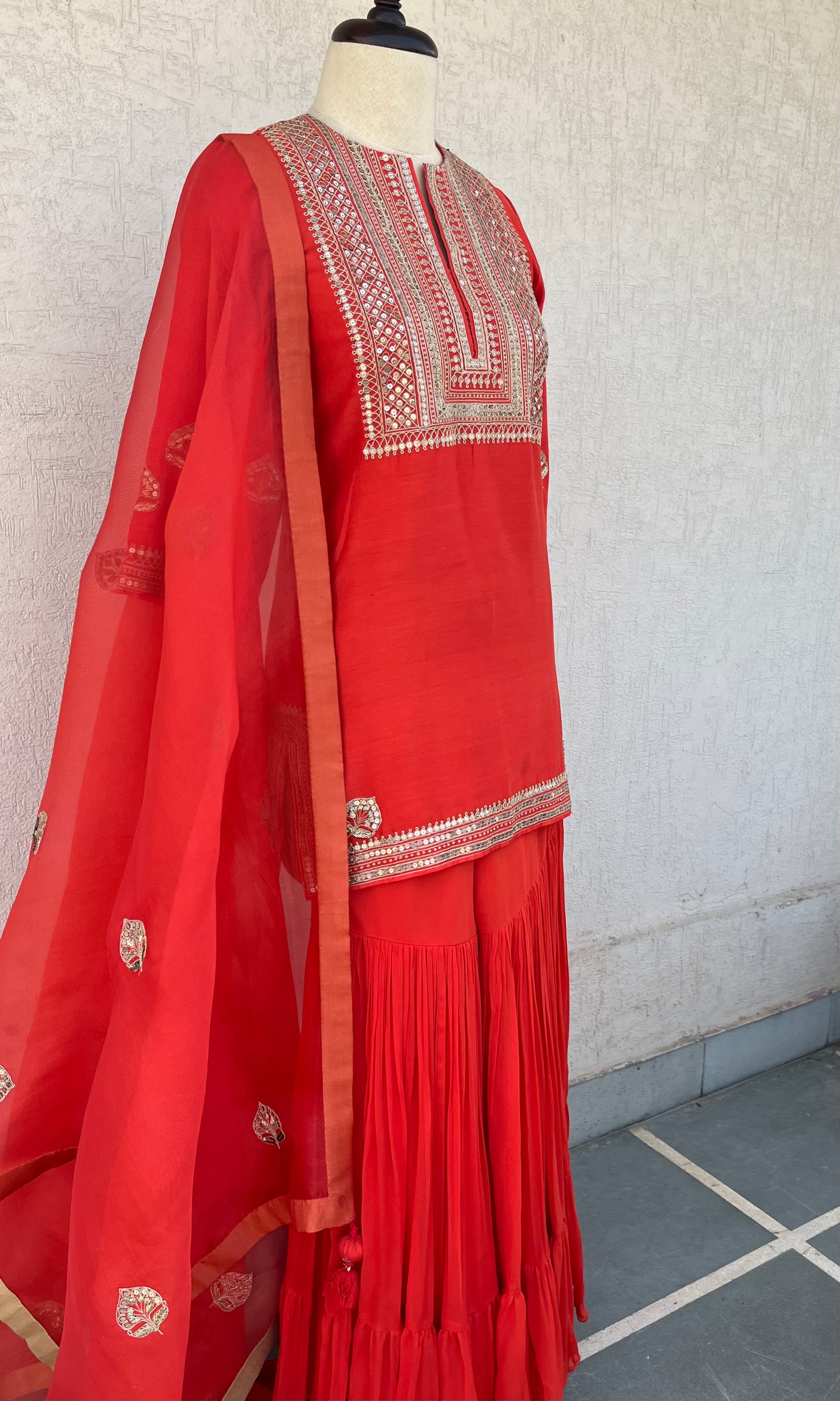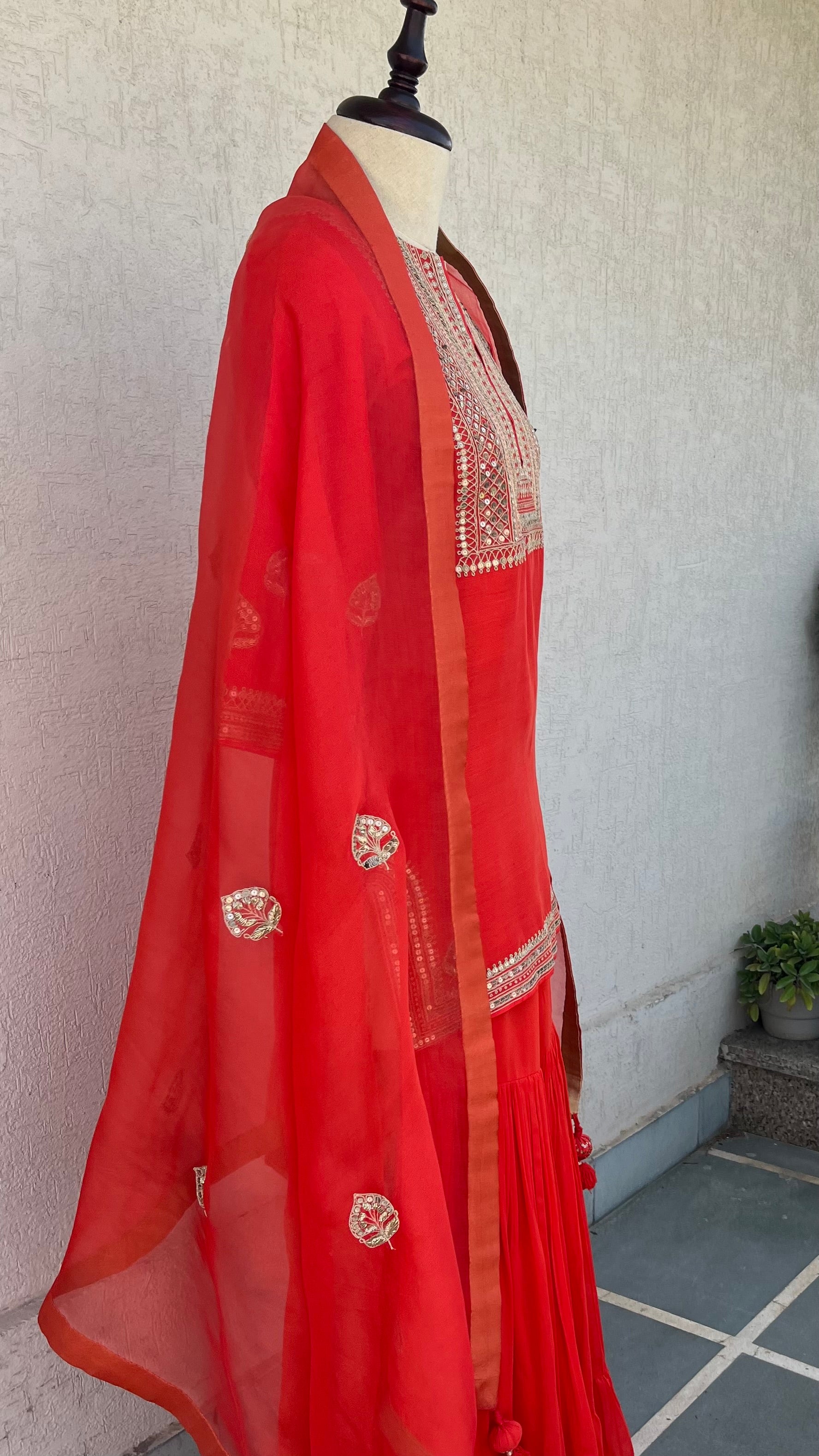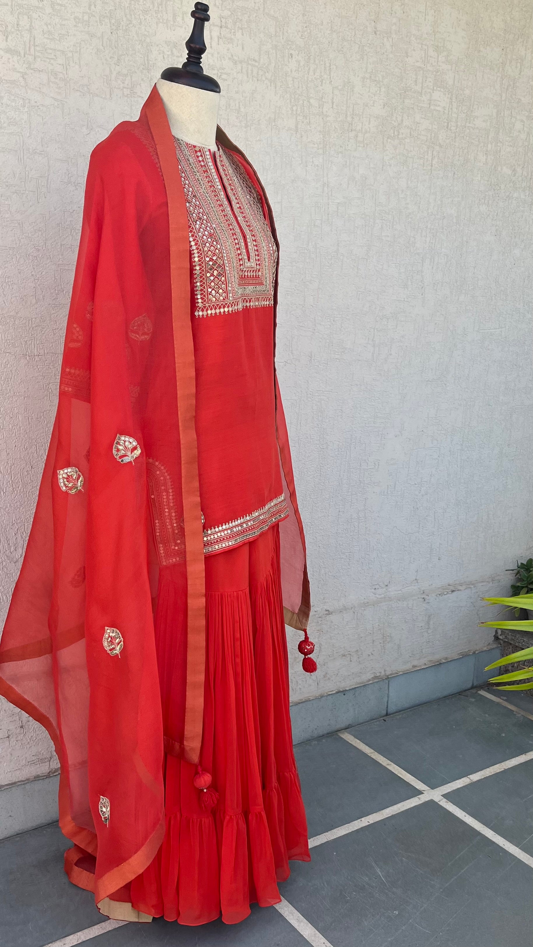Short Scarlet Silk Chanderi Kurta and Organza Dupatta with Hand Dori, sequins and Naqshi embroidery.