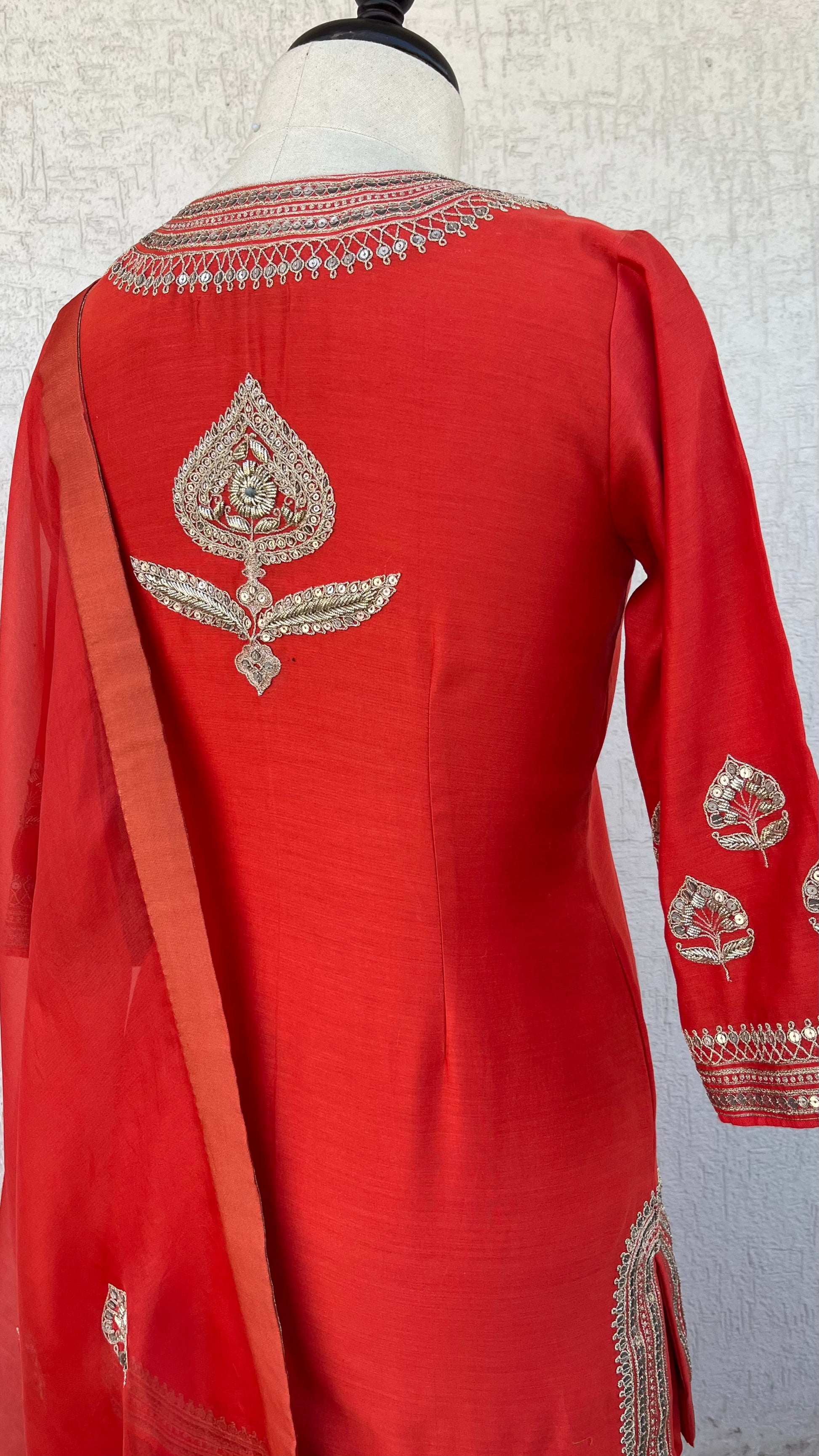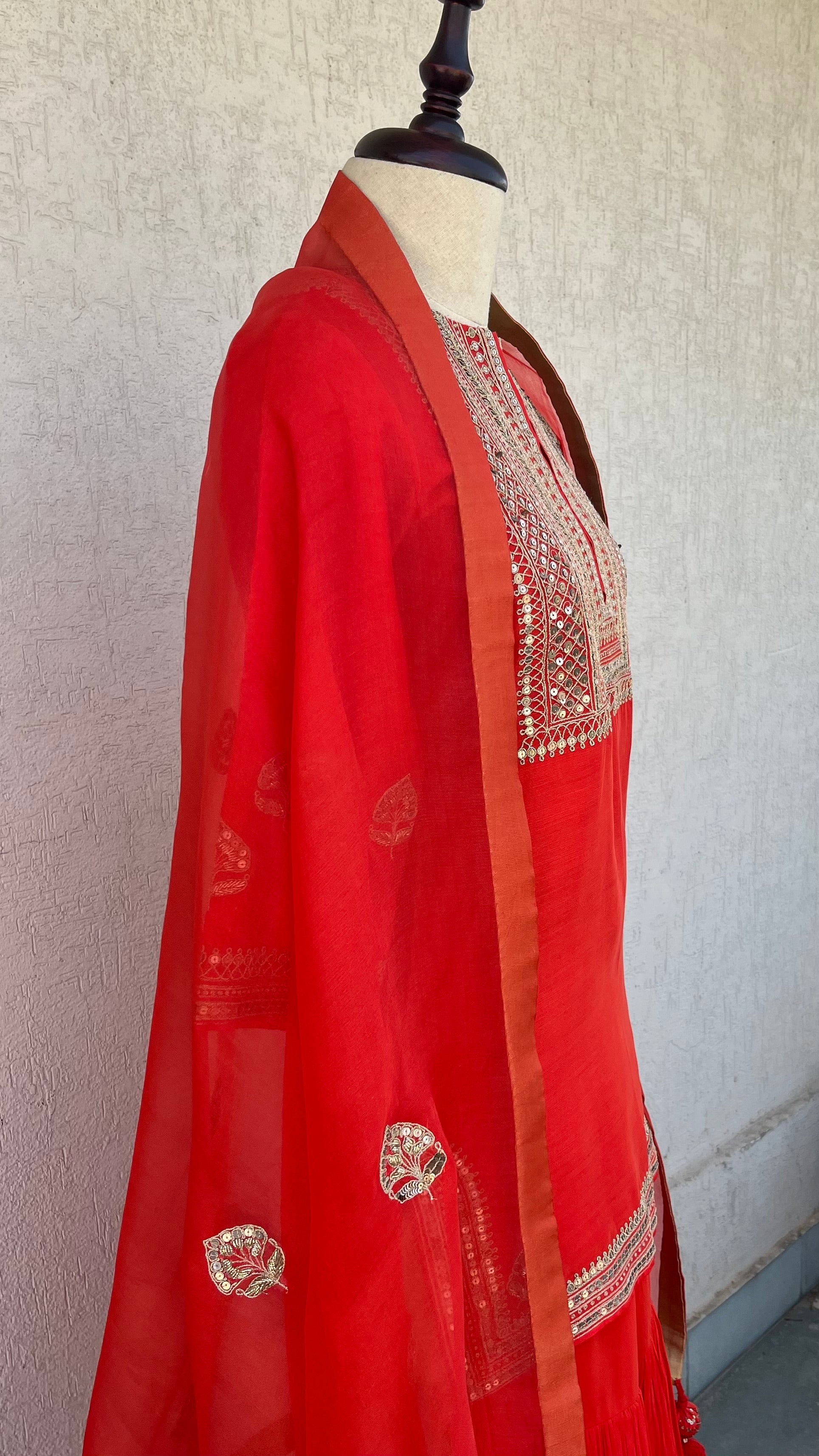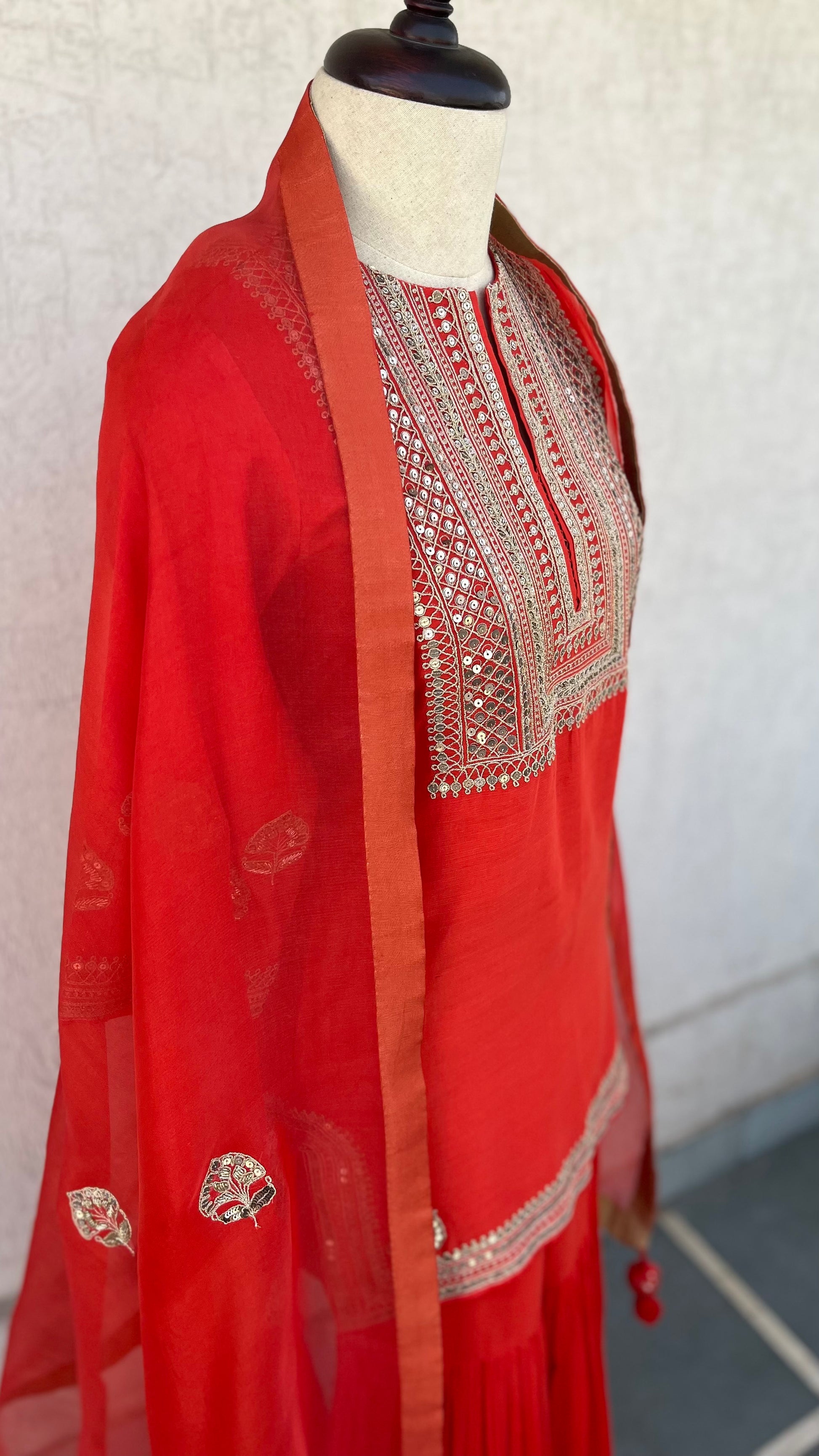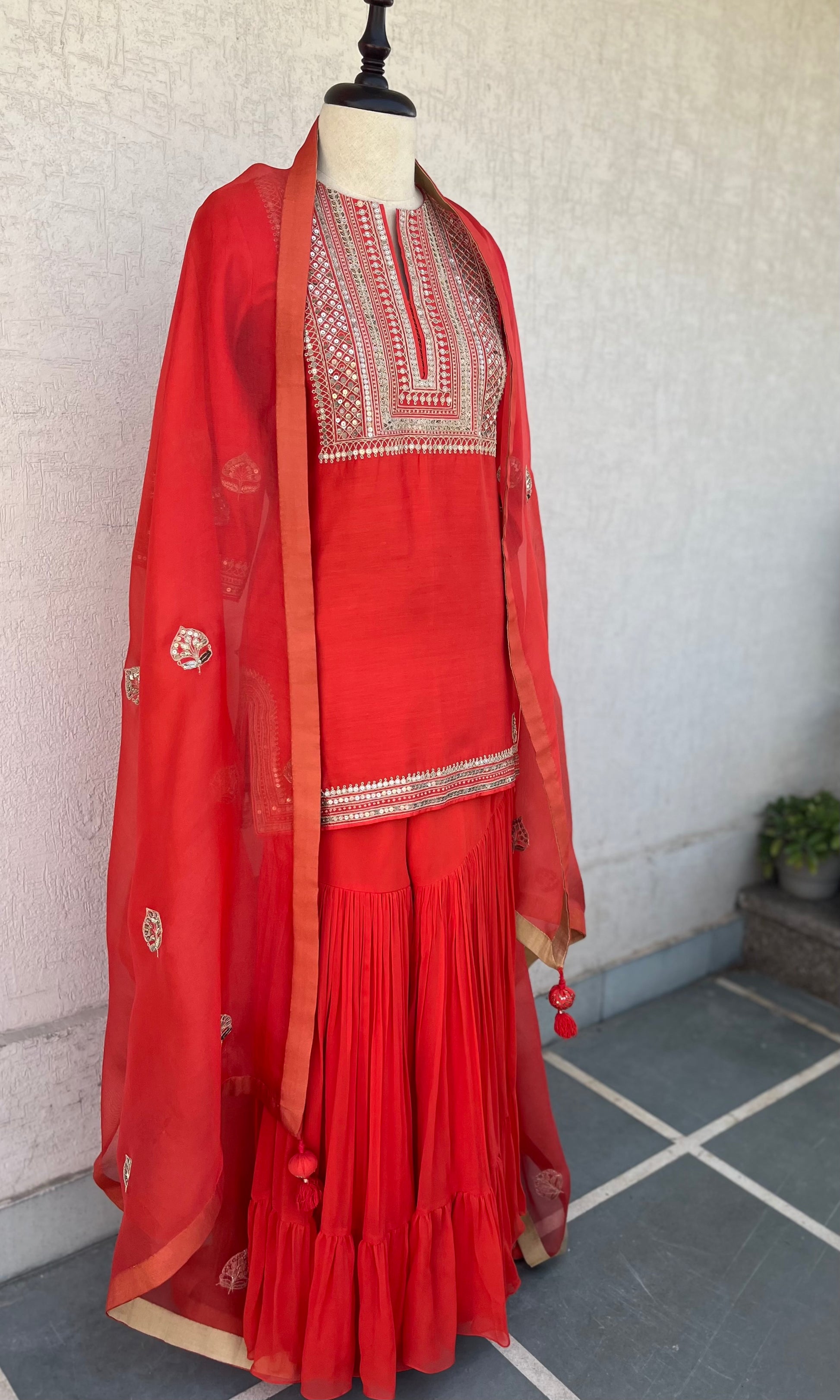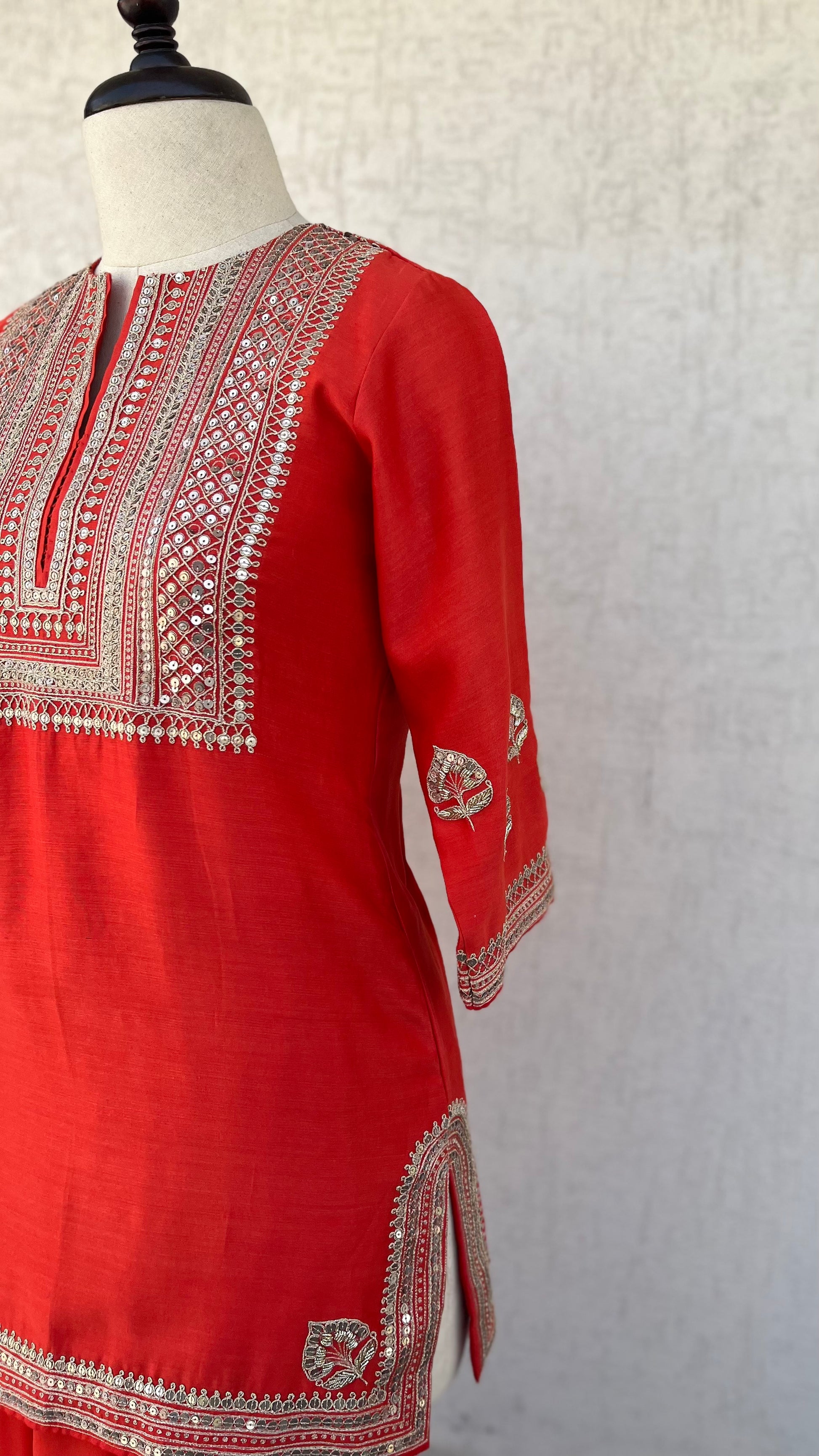 Short Scarlet Silk Chanderi Kurta and Organza Dupatta with Hand Dori, sequins and Naqshi embroidery.