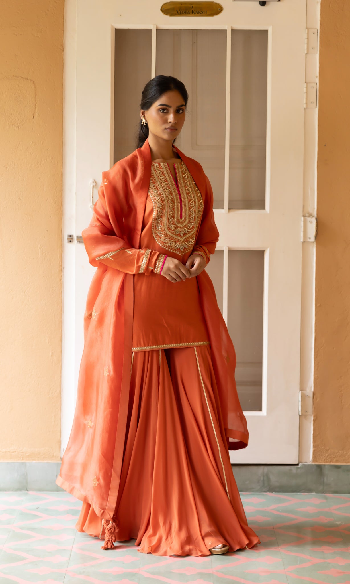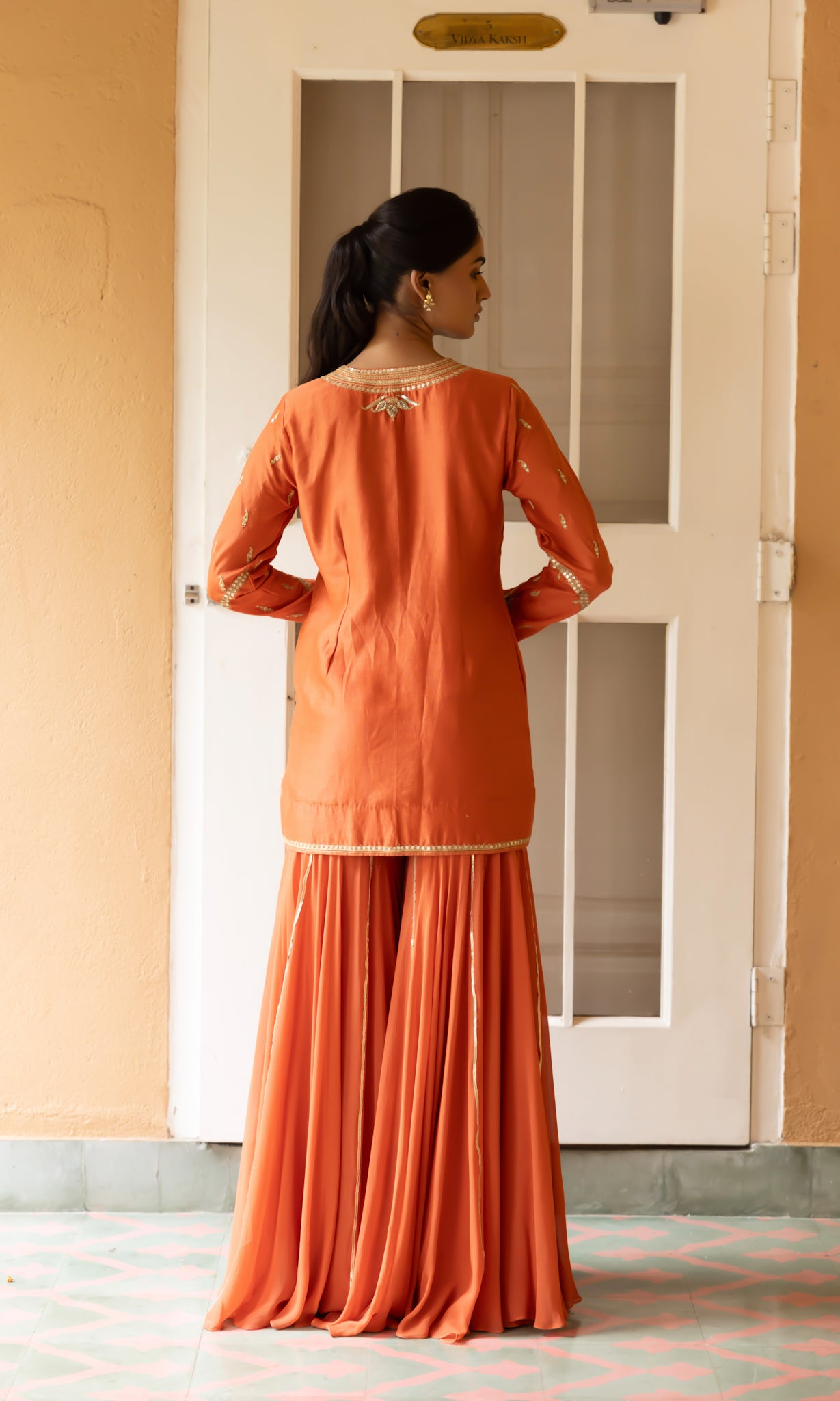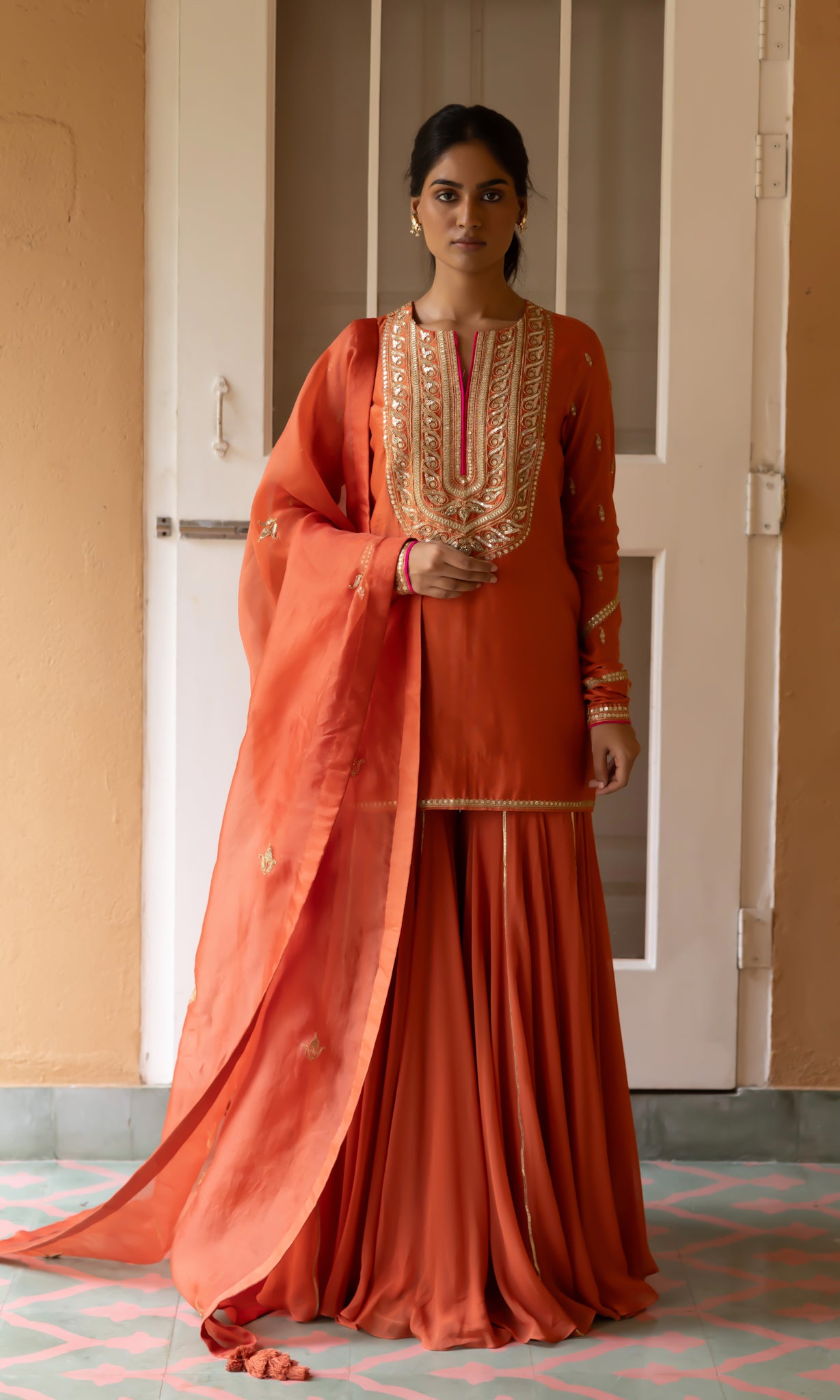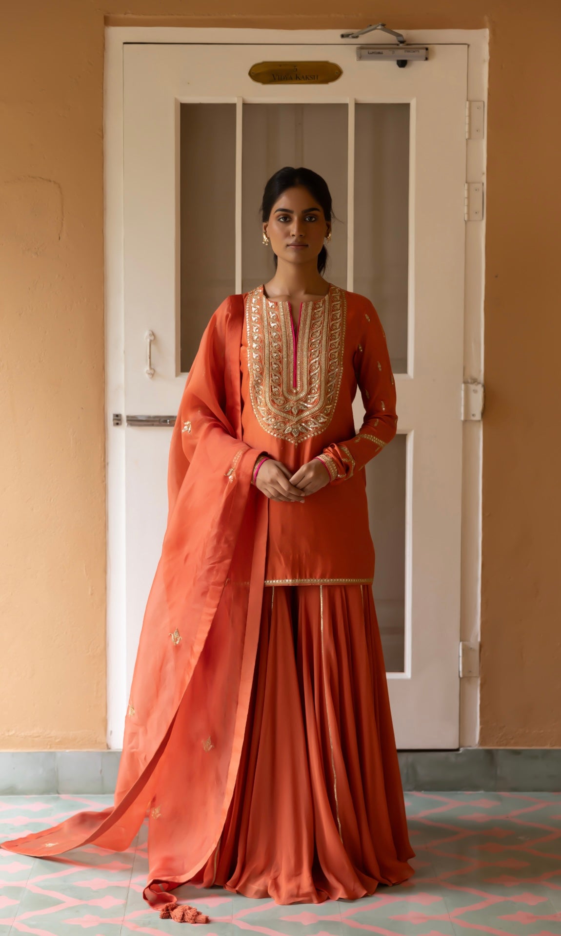 Rust Silk Chanderi Short Kurta, Georgette Gharara and Organza Dupatta set with Hand Dori and sequins embroidery