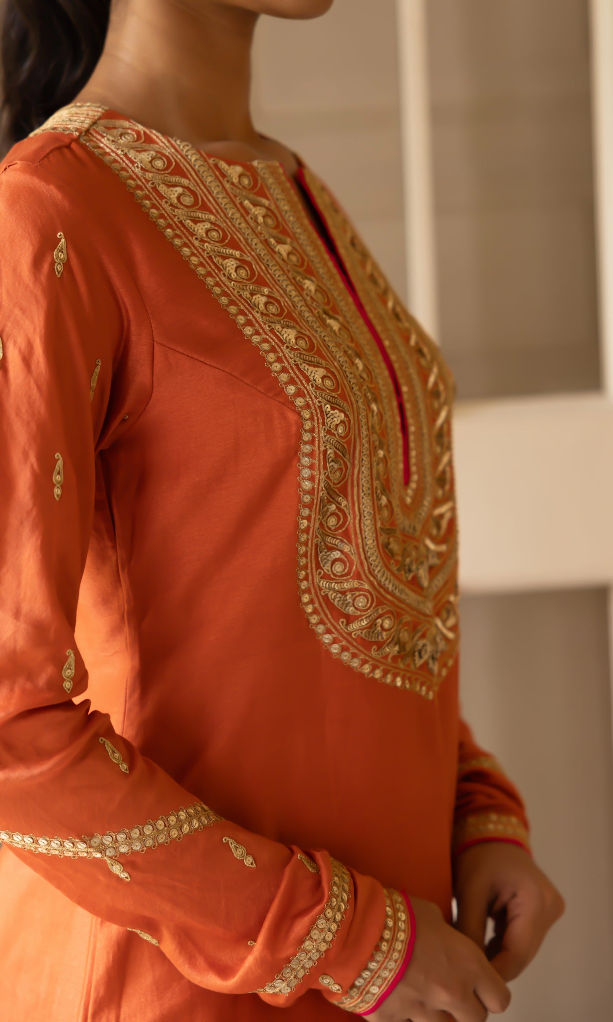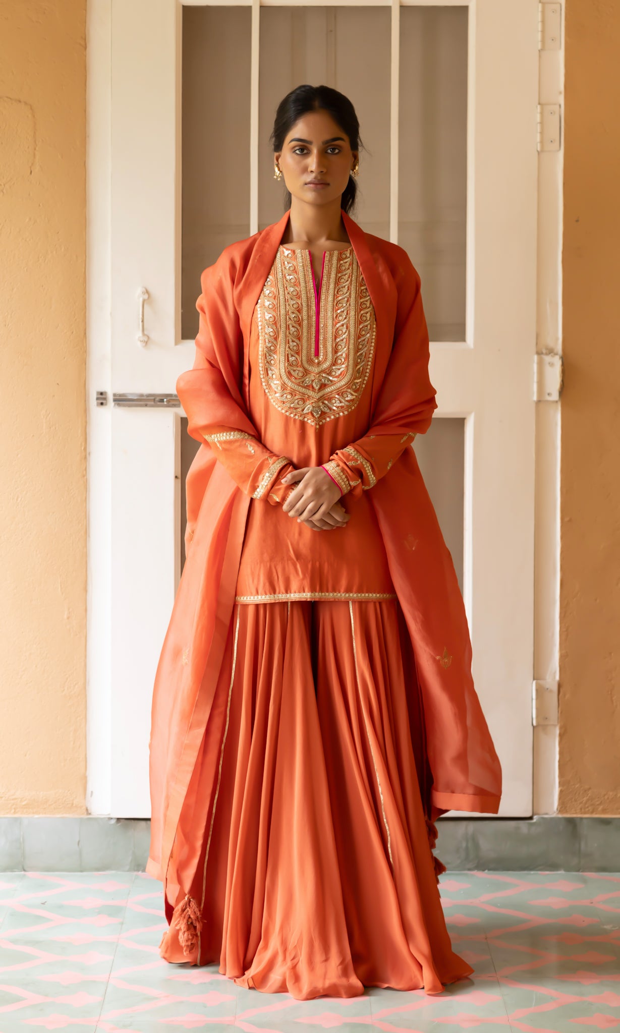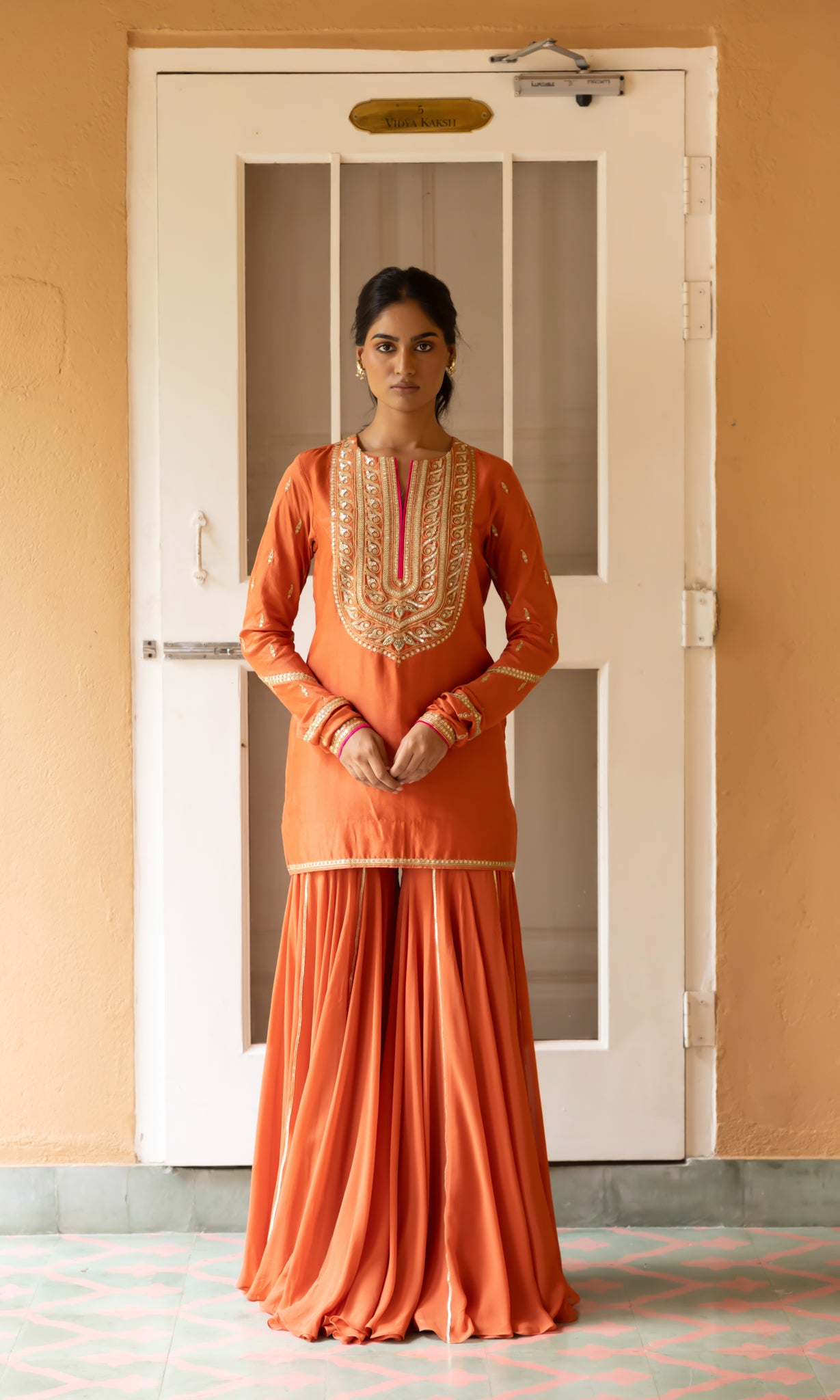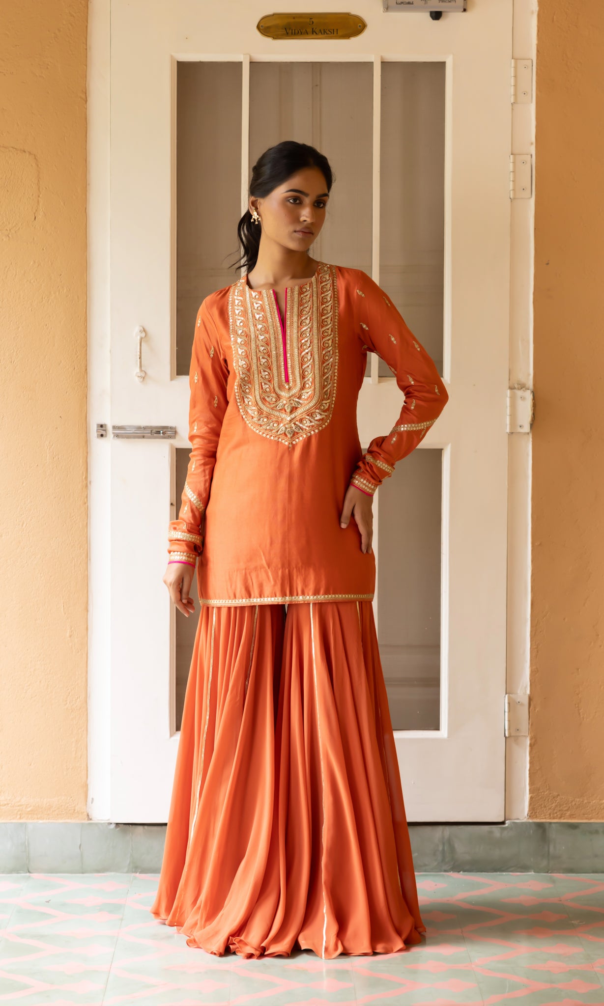 Rust Silk Chanderi Short Kurta, Georgette Gharara and Organza Dupatta set with Hand Dori and sequins embroidery