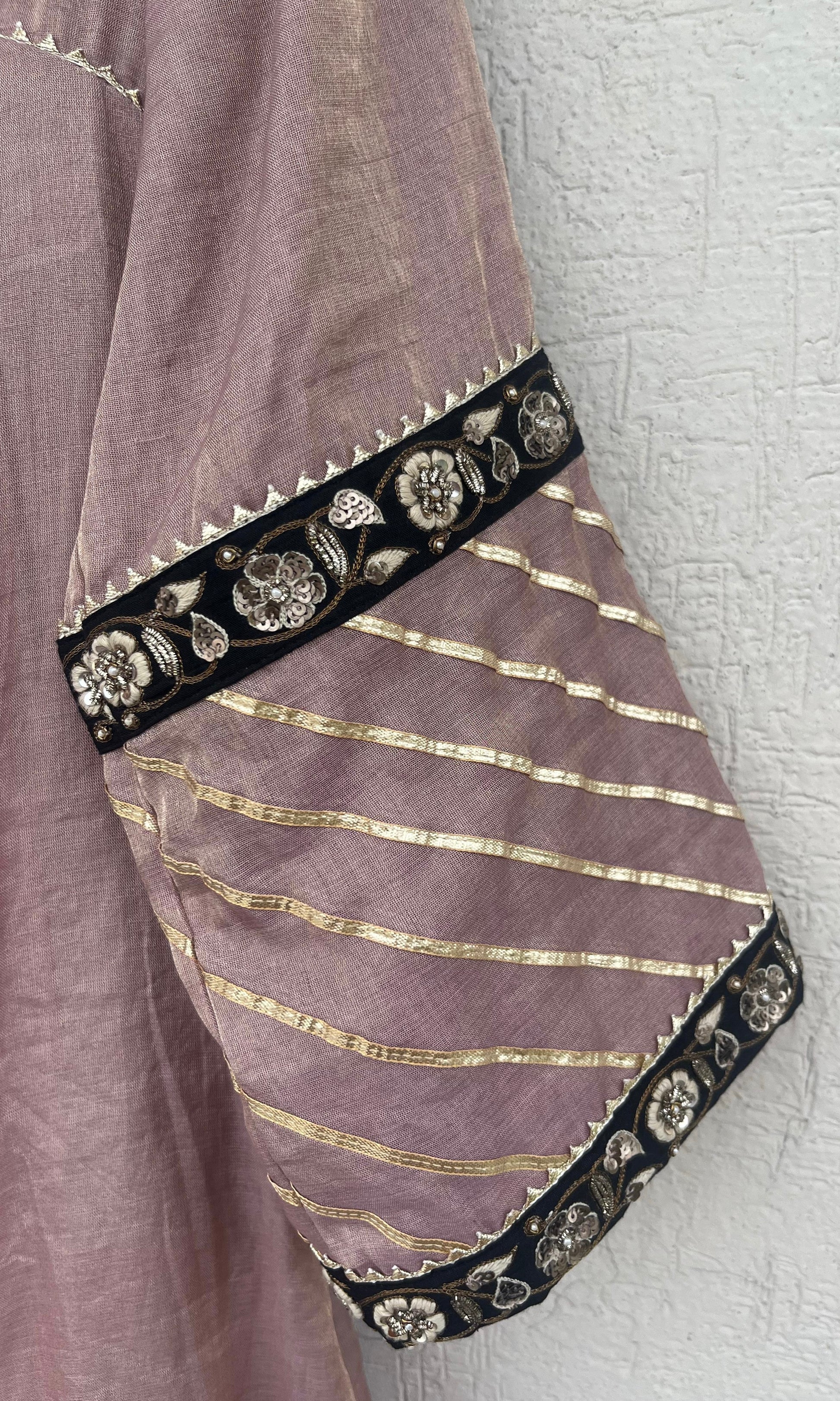 Silk Tissue A-line kurta with hand embroidered details. Comes with satin Lycra pants and organza dupatta