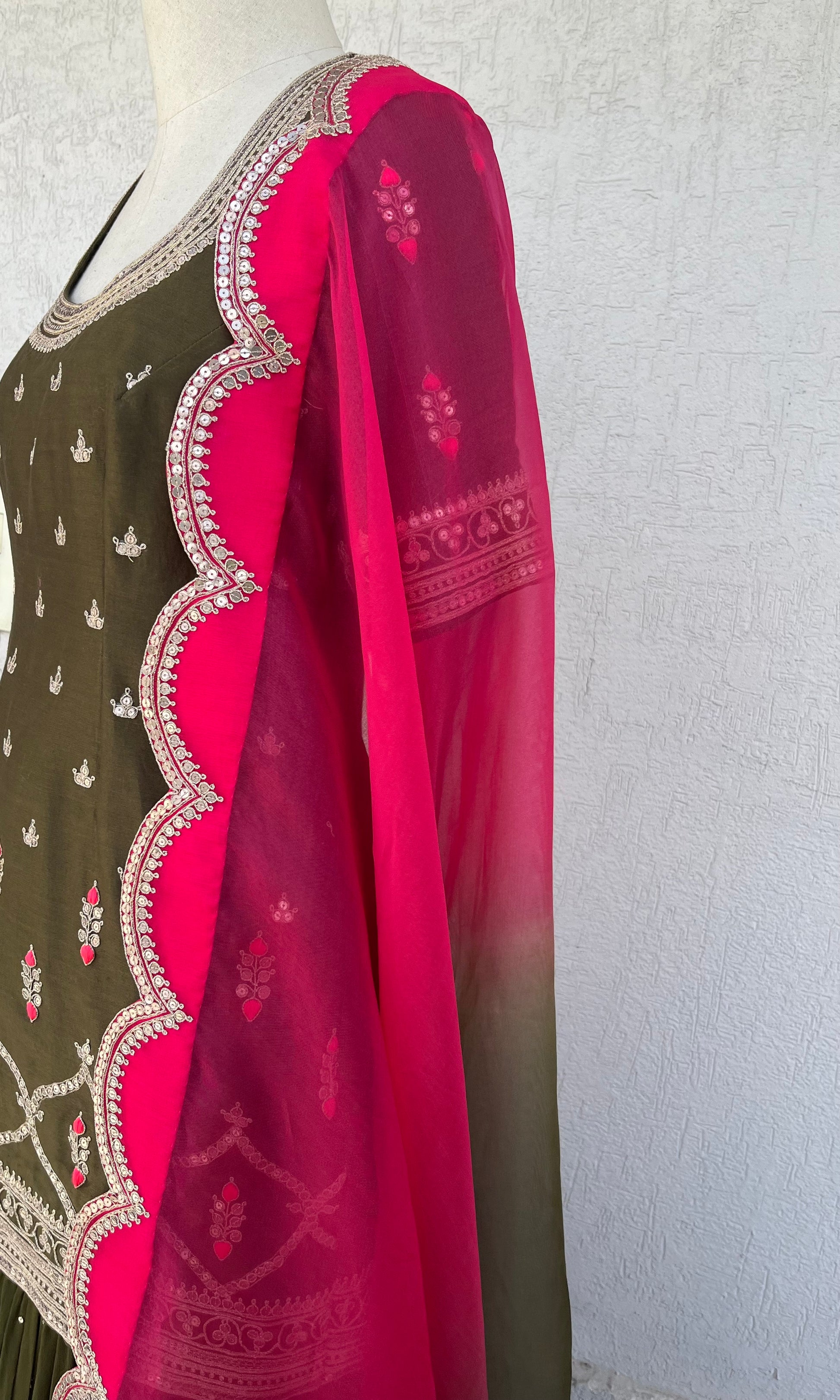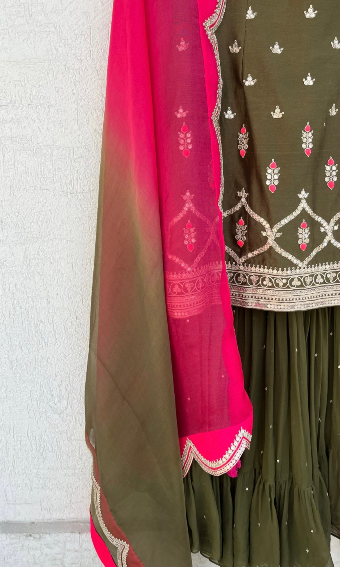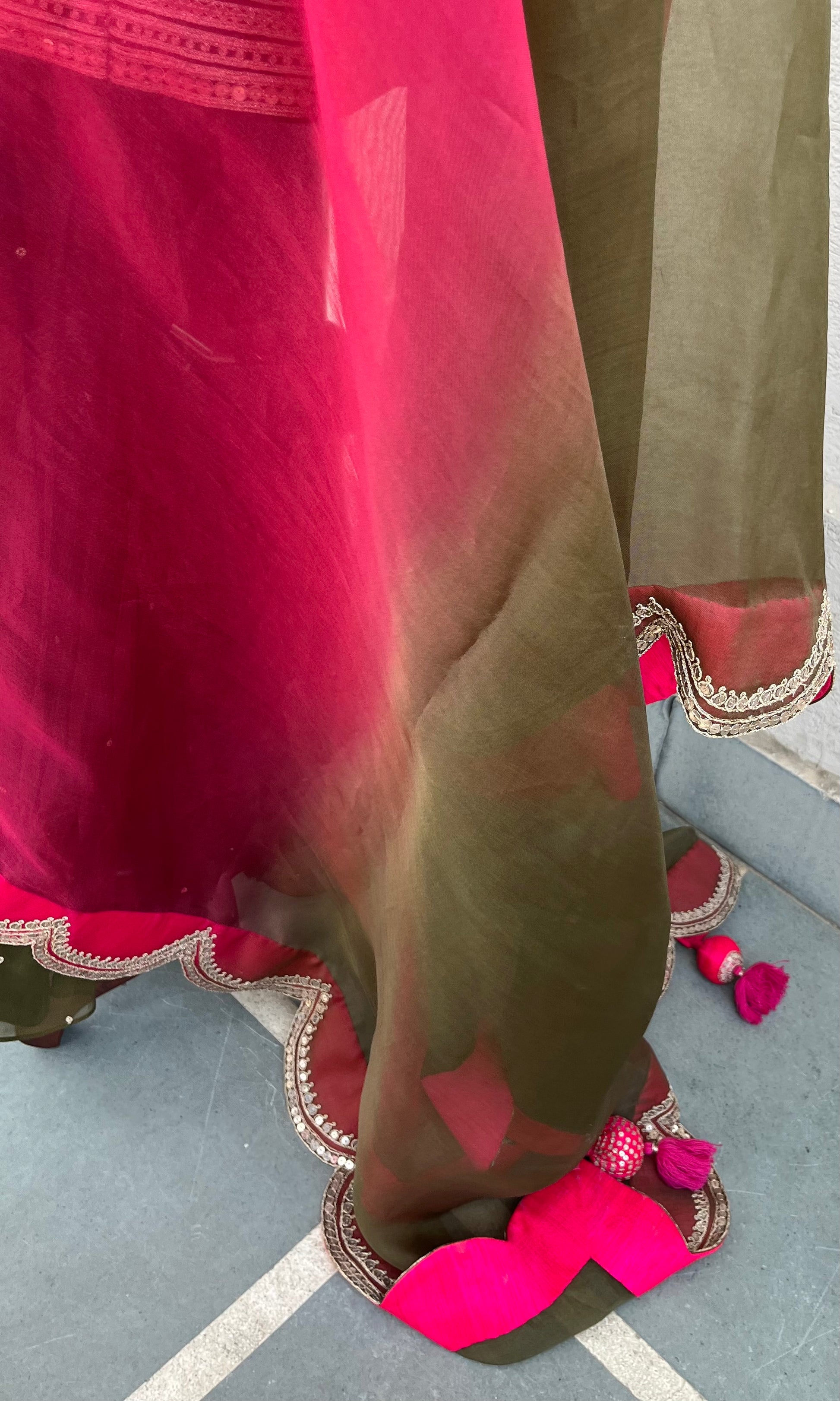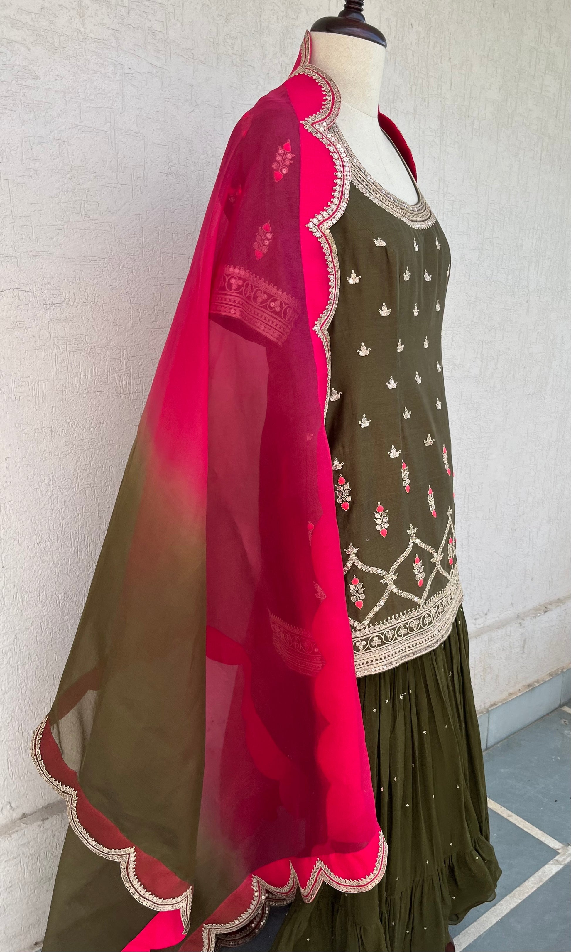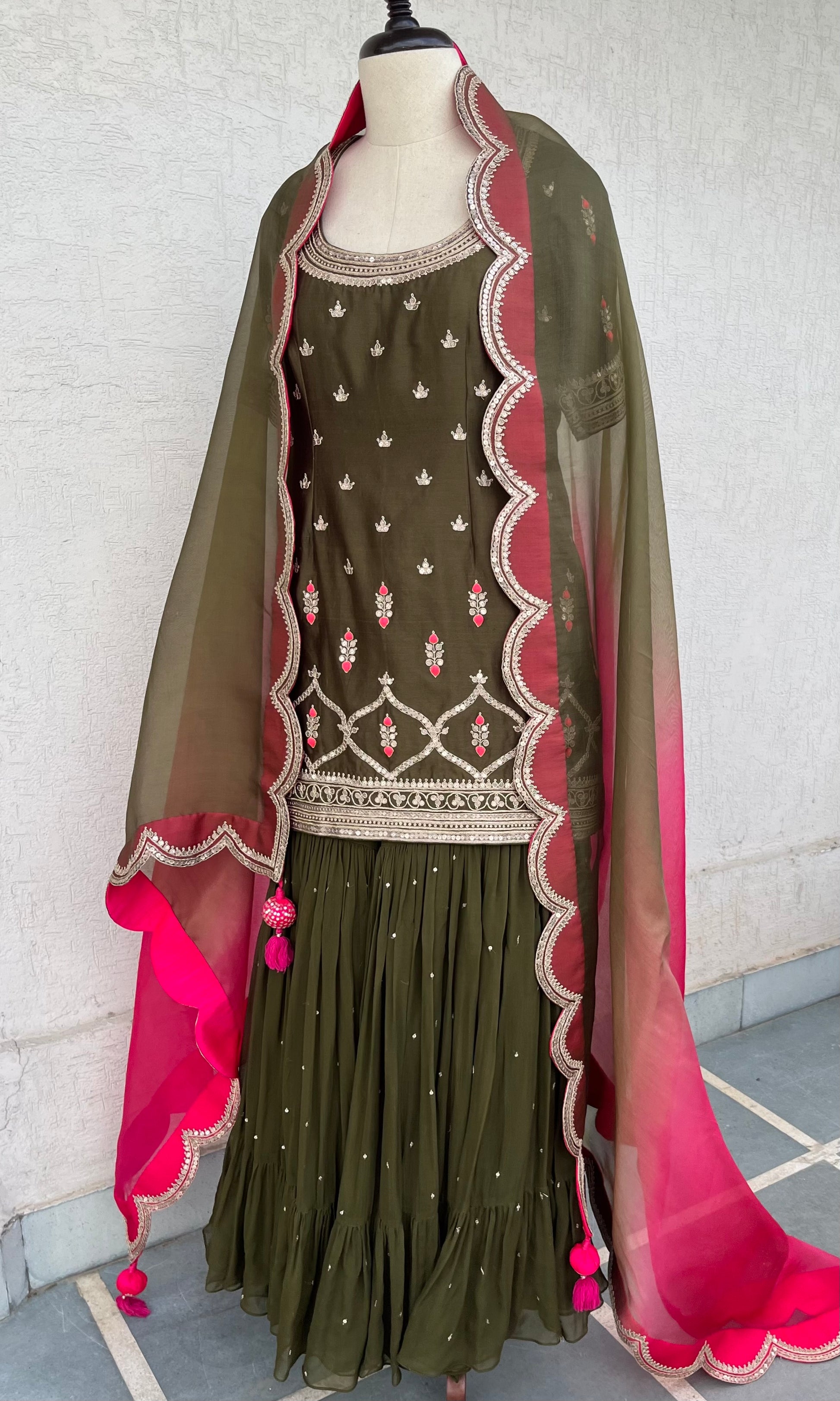 Olive Short Kurta, Georgette layered Gharara and Scallop Ombré and Magenta Organza Dupatta set with Hand Dori, sequins and thread embroidery