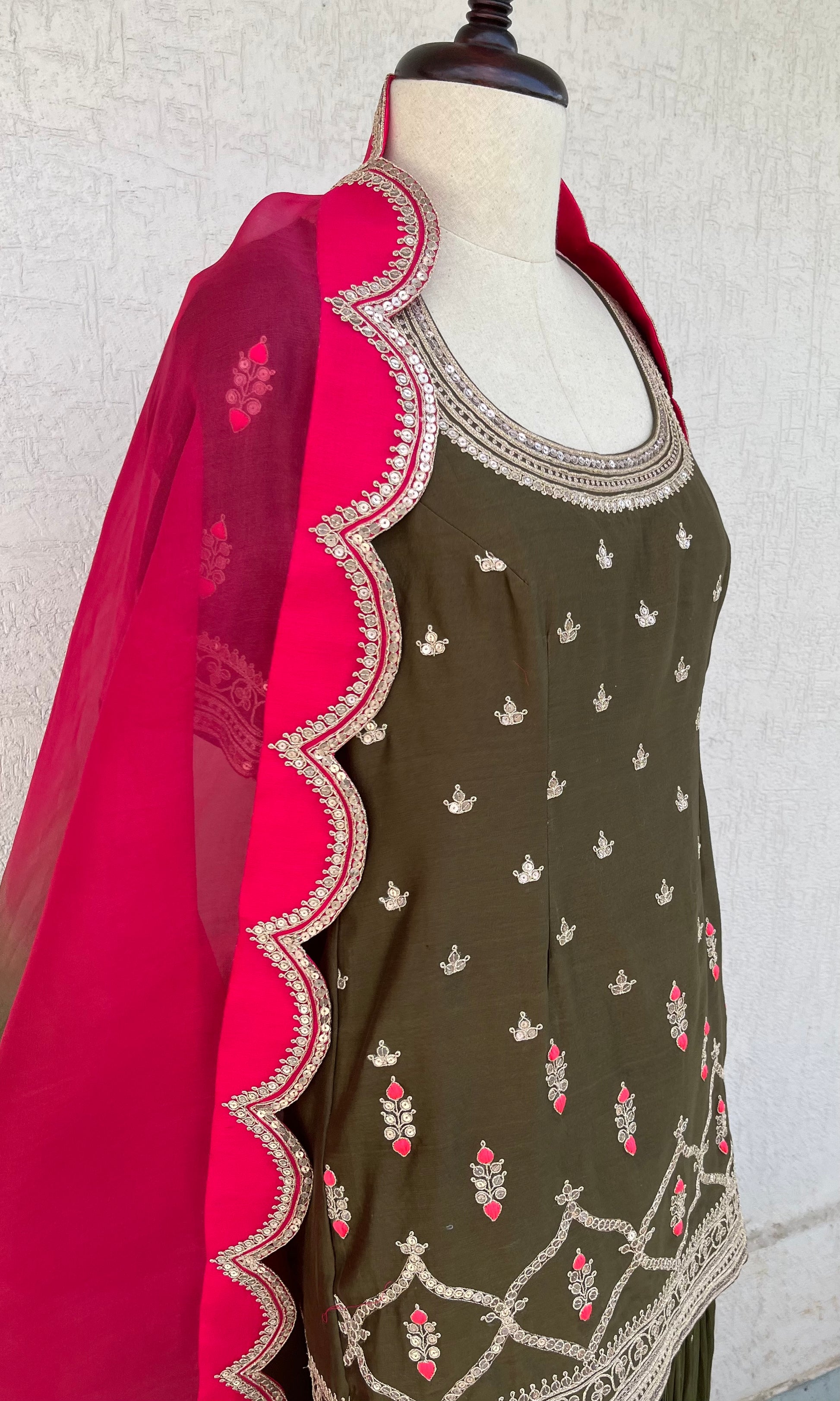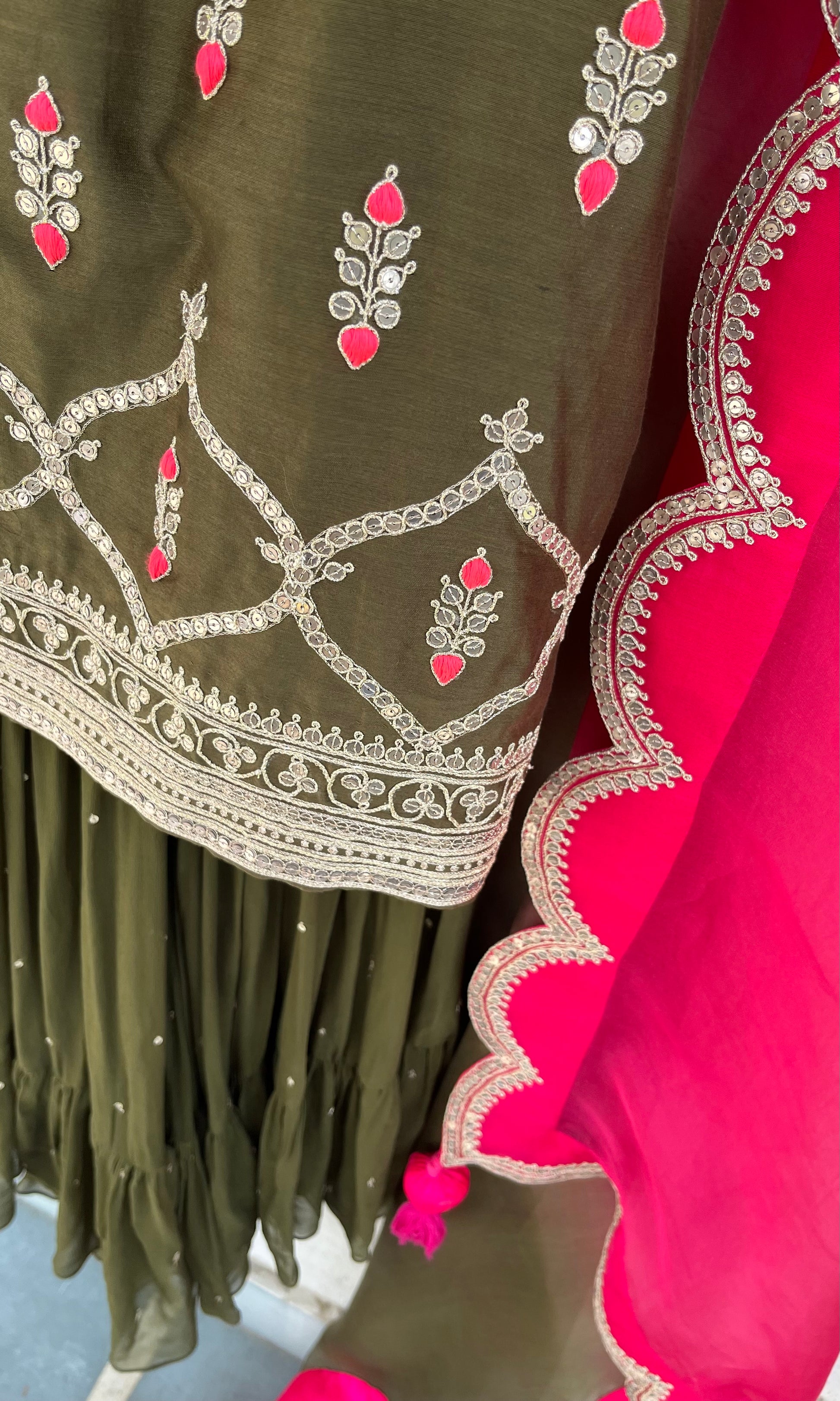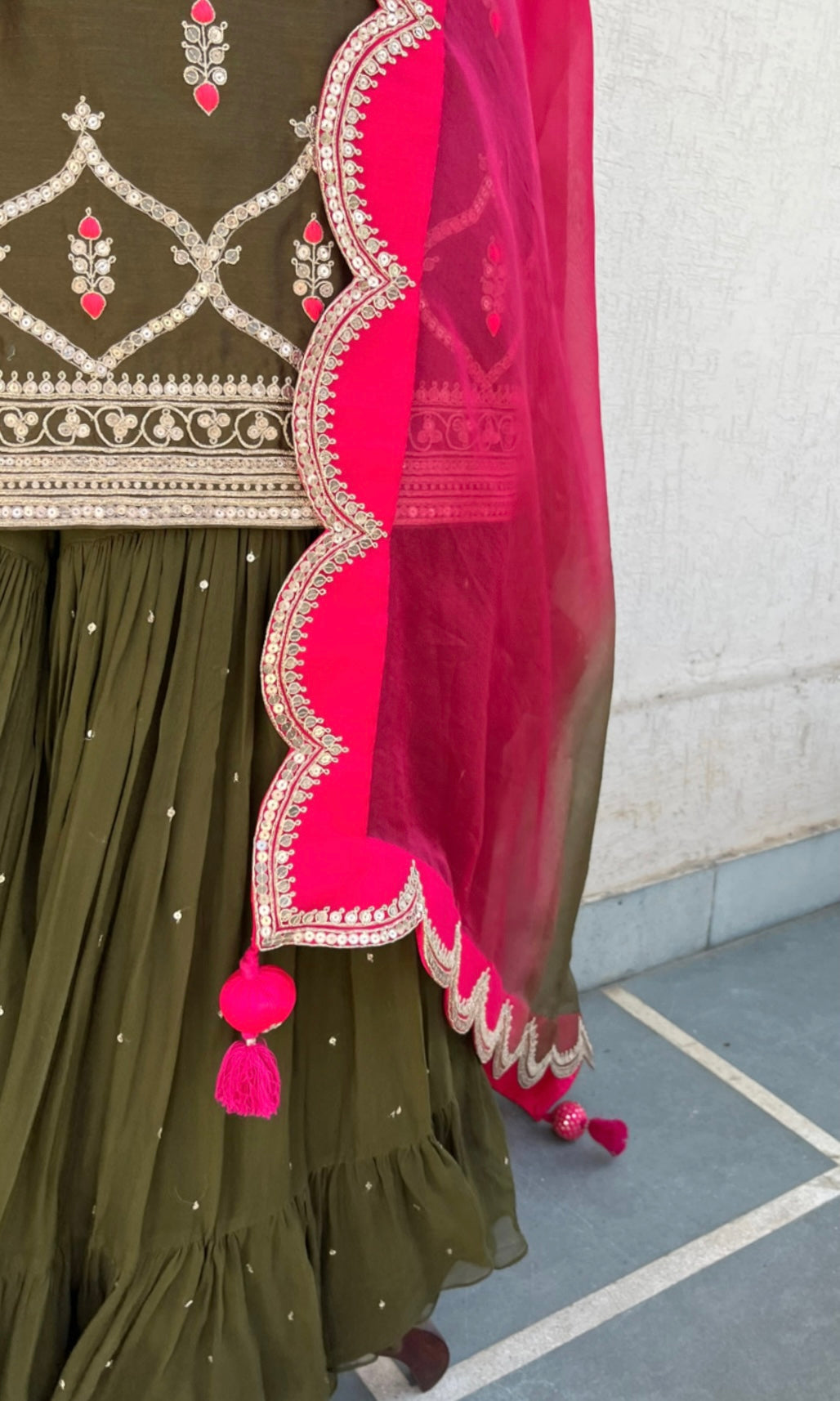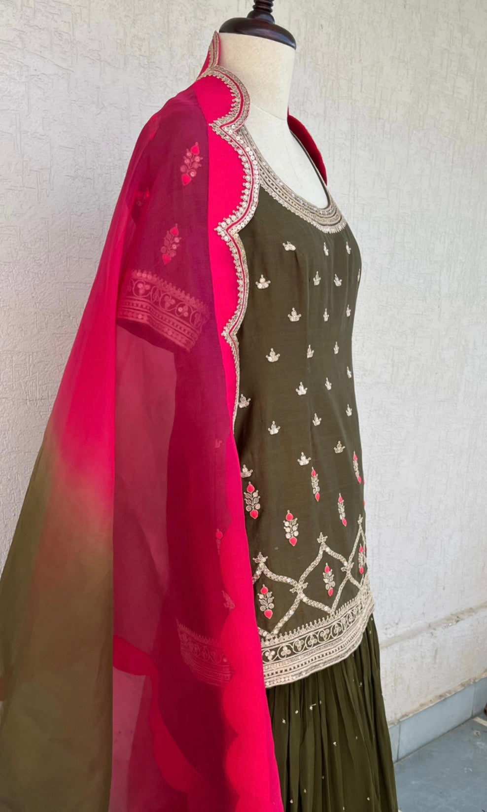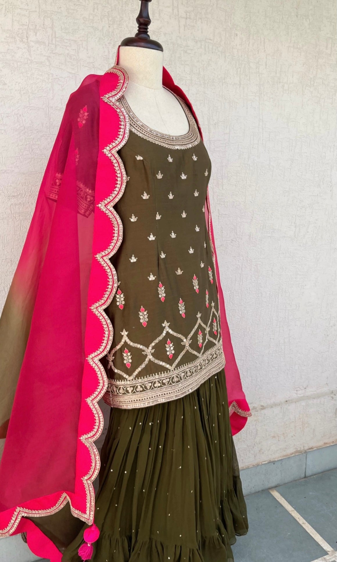 Olive Short Kurta, Georgette layered Gharara and Scallop Ombré and Magenta Organza Dupatta set with Hand Dori, sequins and thread embroidery